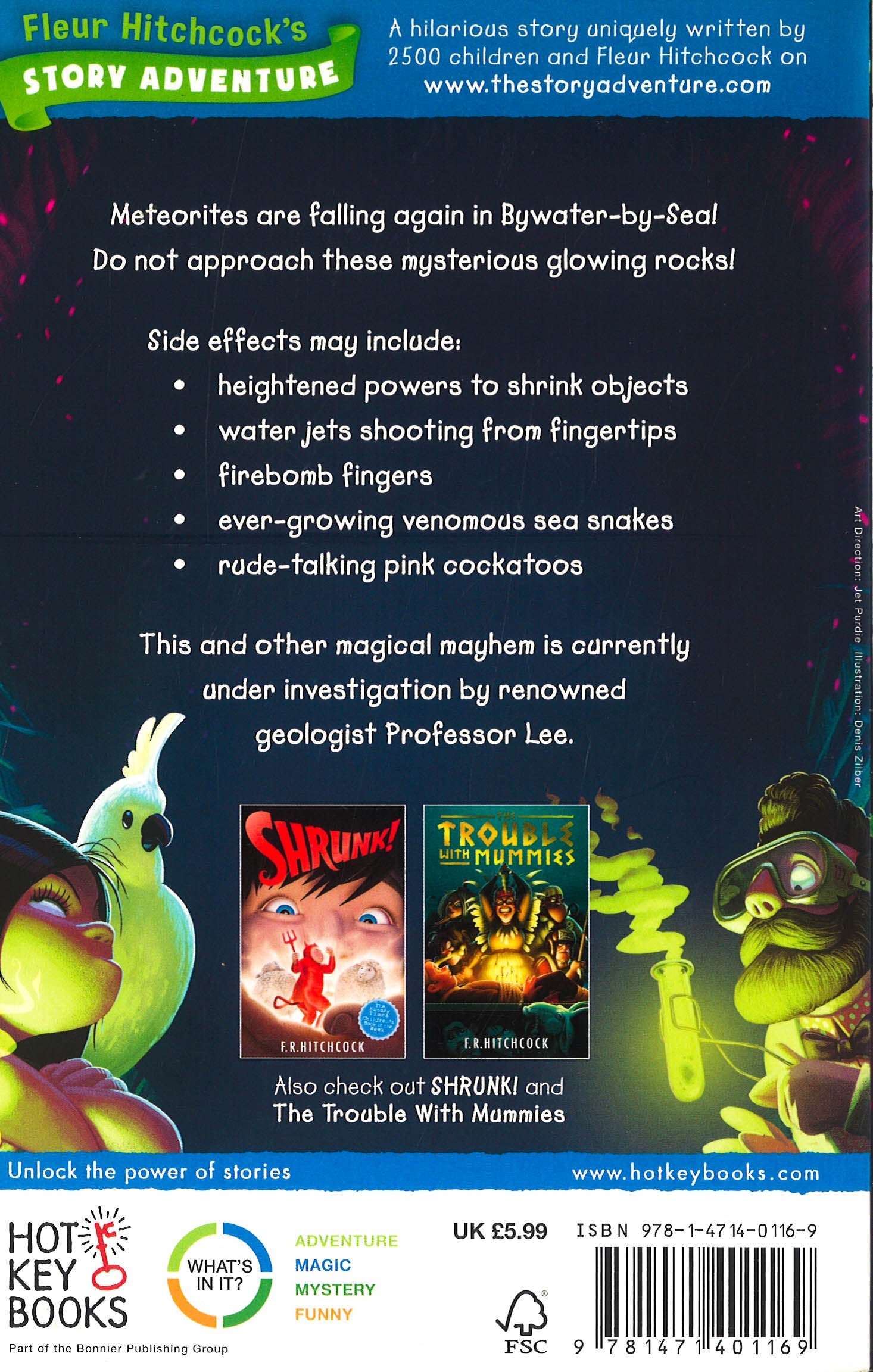 The sensational sequel to SHRUNK! the SUNDAY TIMES 'Book of the Week'!It seems all is quiet in the sleepy seaside town of Bywater-by-Sea until a meteorite falls to earth, landing in the middle of the Field Craft troop's outdoor expedition camp. Now it's not just Tom with strange powers: trouble-maker Jacob can set things on fire and sensible Eric has the power to put them out.What's more, the excavation of the ancient castle has uncovered a mysterious glittering rock, and the dust is making Bywater-by-Sea even more eccentric than usual.NEWSFLASH: Meteorites are falling again in Bywater-by-Sea. Do NOT approach these mysterious glowing rocks. Side effects may include: heightened powers to shrink objects, water jets shooting from fingertips, firebomb fingers, ever-growing venomous sea snakes and naughty pink cockatoos. This and other magical mayhem is currently under investigation by renowned geologist Professor Lee.This SHRUNK story was created on The Story Adventure, where week by week Fleur wrote a new chapter using ideas from over 2,000 school children - characters, locations and plot twists. See if you can spot them!