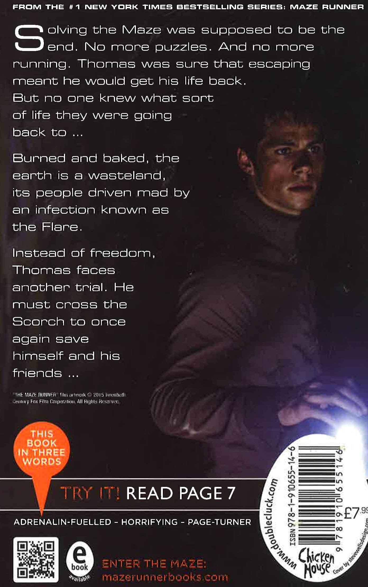 The second book in the New York Times bestselling Maze Runner series - now a series of major motion pictures starring Dylan O'Brien! SEE THE FILMS. READ THE BOOKS. ENTER THE MAZE ... Thomas was sure that escape from the maze meant he and the Gladers would get their lives back. But no one knew what sort of life they were going back to. The earth is a wasteland. Government and order have disintegrated and now Cranks, people driven to murderous insanity by the infectious disease known as the Flare, roam the crumbling cities hunting for their next victim ... and meal.Thomas can only wonder - does he hold the secret of freedom somewhere in his mind? Or will he forever be at the mercy of WICKED? Make sure you check out book 3, The Death Cure - the thrilling conclusion to the series!