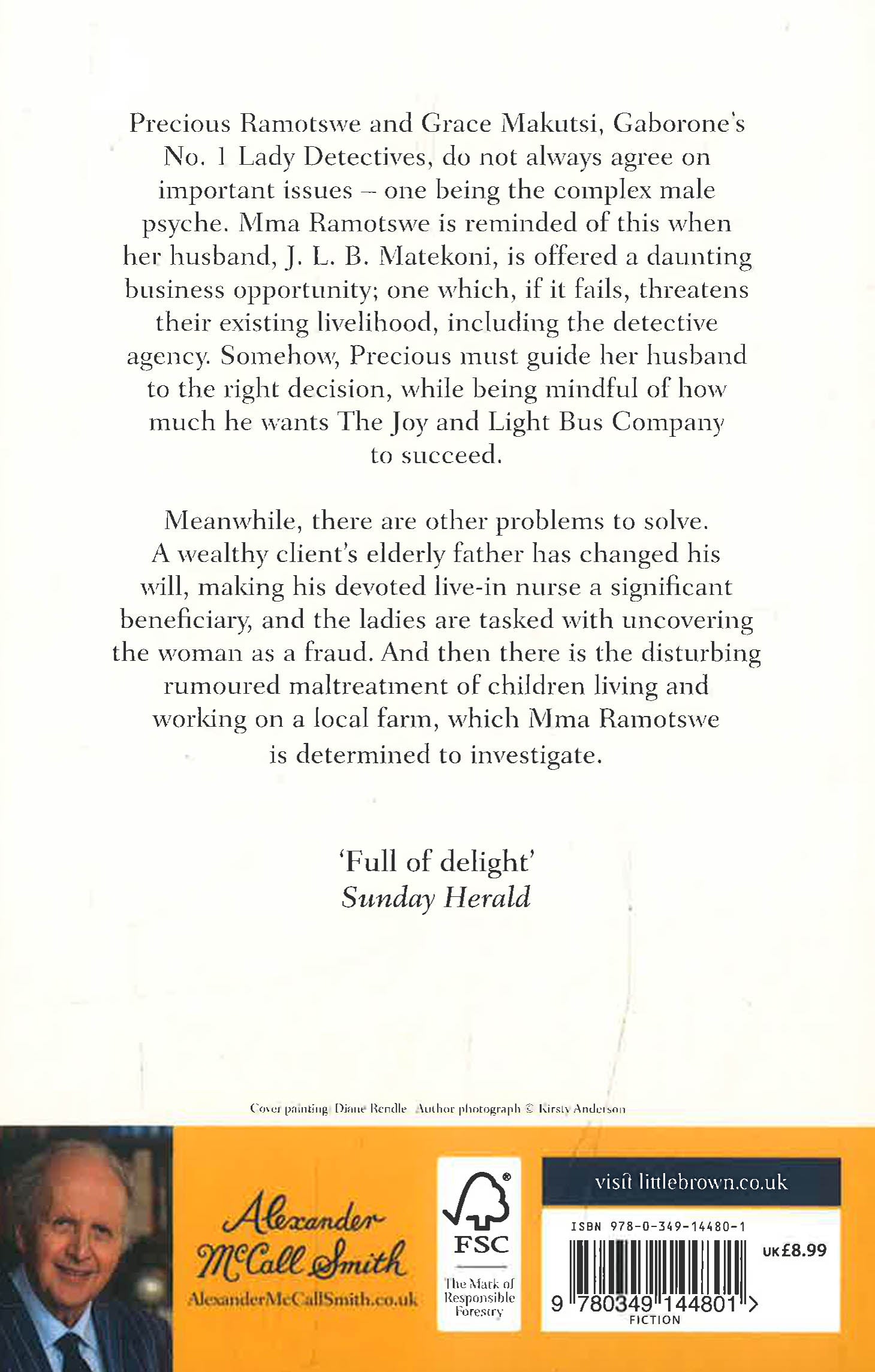 Mma Ramotswe knows she is very lucky indeed. She has a loving family, good friends and a thriving business doing what she enjoys most: helping people. But the latest mystery she is called upon to solve is distinctly trickier than it initially appears, and, of course, there's plenty to handle in her personal life between Charlie and his new bride and Mma Makutsi and her talking shoes.