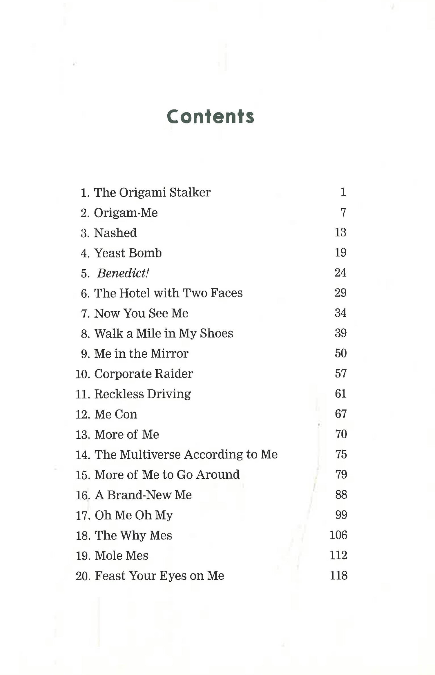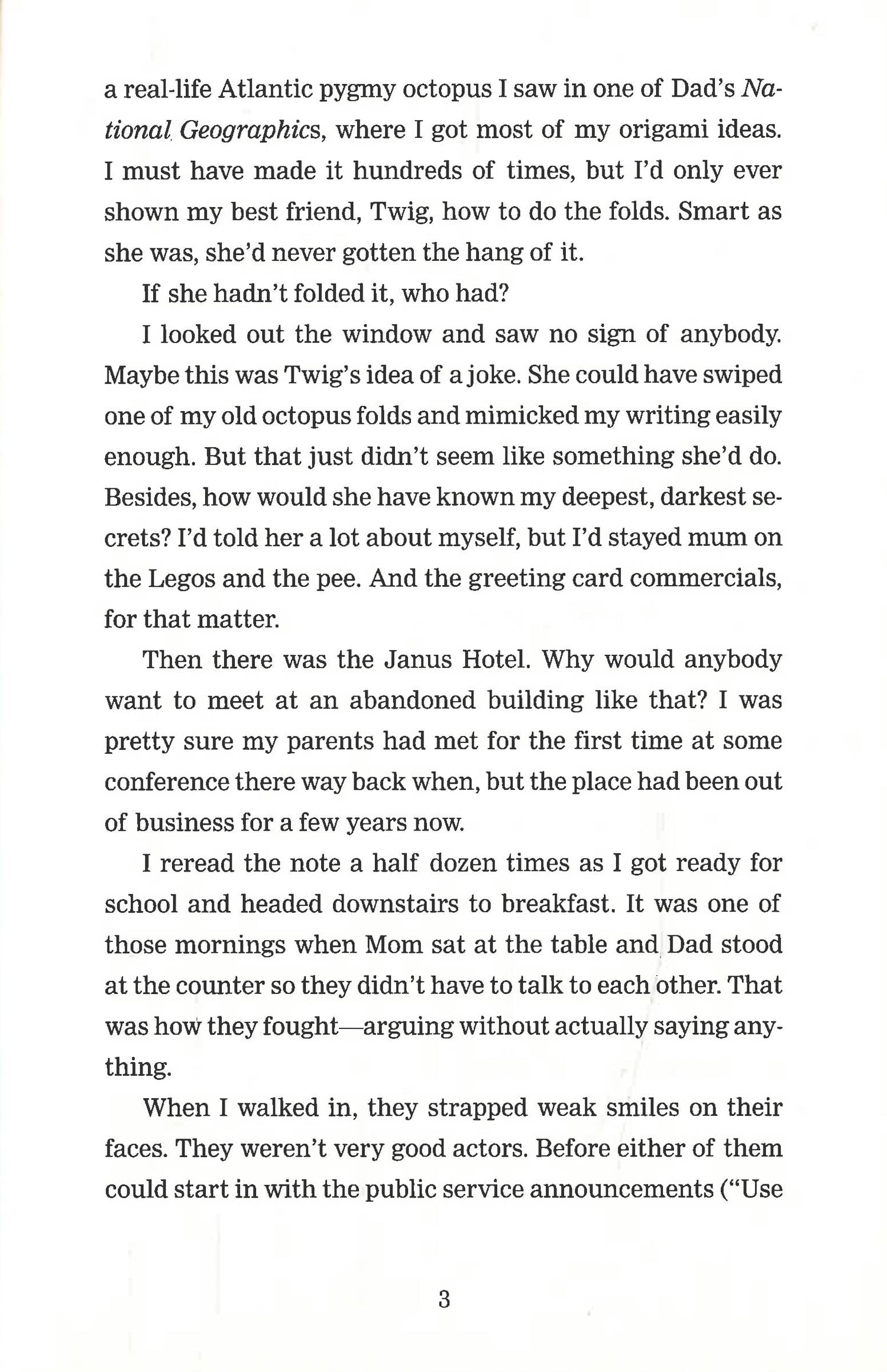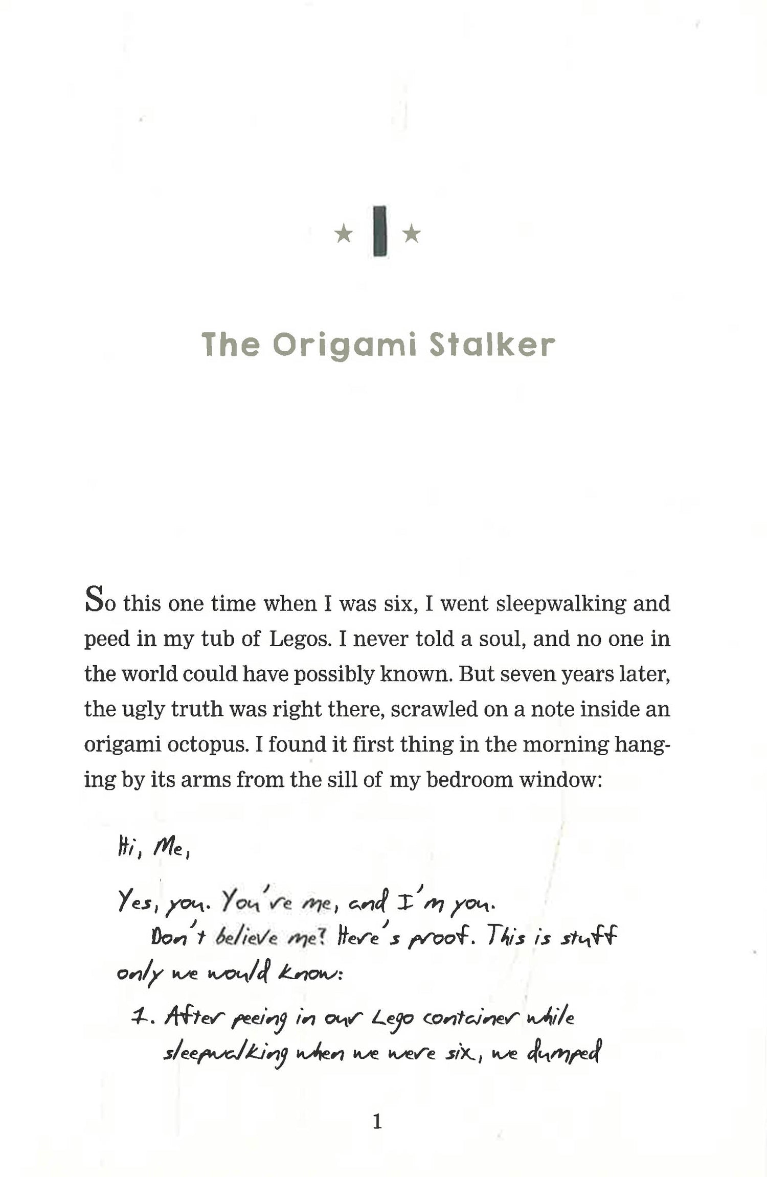 Except . . . the octopus is an origami fold Meade thought he invented. And the note writer has a lot of intel on him that nobody else should know. I mean, he's told his best friend Twig a lot about himself, but he's definitely kept mum about that time he sleepwalk-peed into his Lego container when he was six. Could Me Con be a real thing? And why does the origami stalker want him to go so badly anyway?