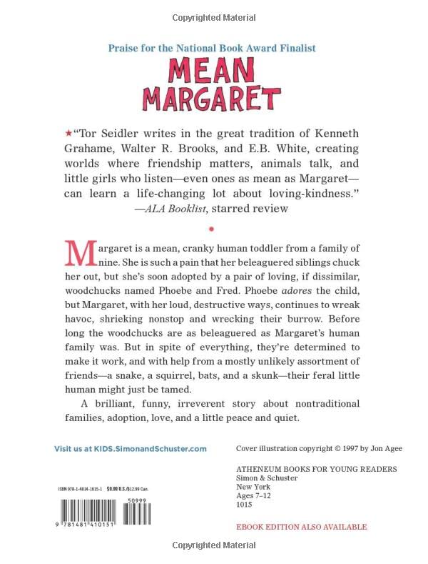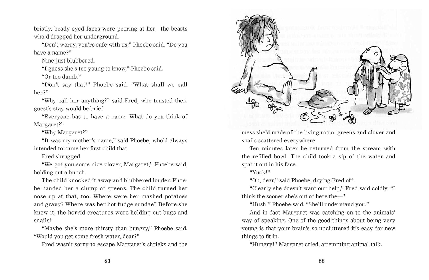 Margaret is a mean, cranky human toddler from a family of nine. She is such a pain that her beleaguered parents chuck her out, and she’s on her own, grousing and grumping until two caring woodchucks, Phoebe and Fred, take Margaret in as their own. But despite their love, Margaret continues to wreak havoc with her loud, destructive ways, ruining the burrow and shrieking nonstop. Soon the woodchucks are as beleaguered as Margaret’s human parents were, but because love is more powerful than temper tantrums, they are determined to make it work. So they enlist a little unconventional help, and with the guidance of a snake, bats, and a skunk, their feral little human just might realize there’s more to life than being mean.