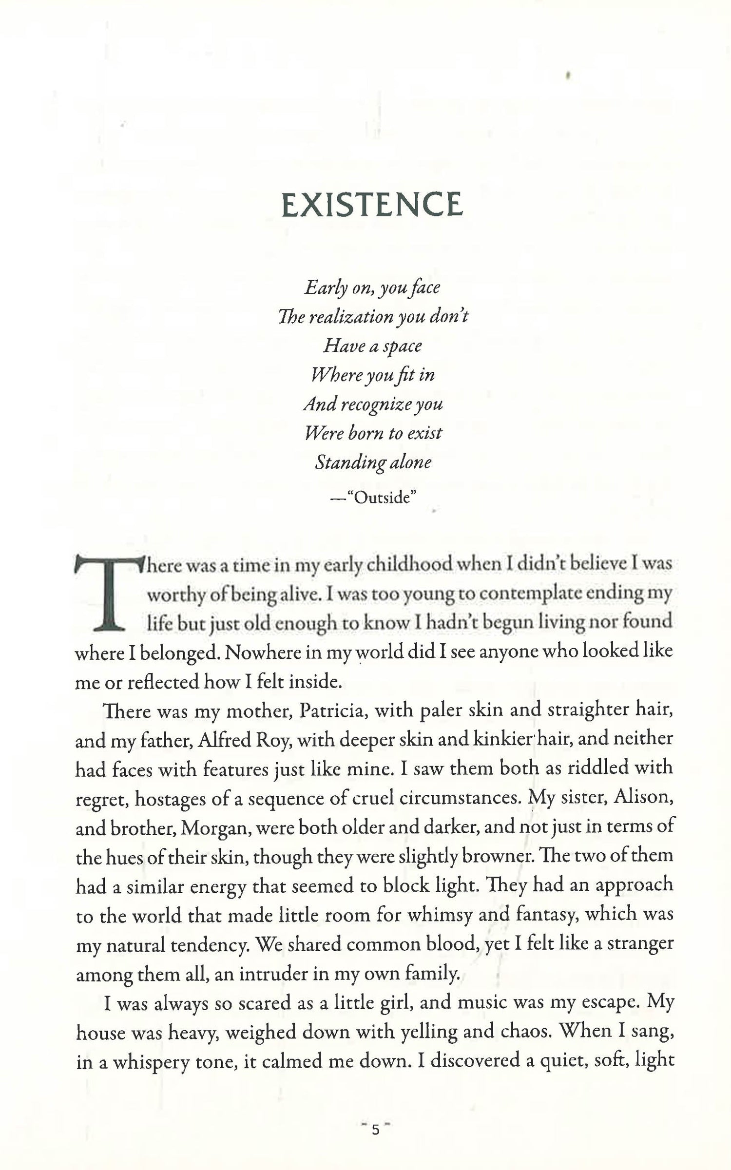 This book is composed of my memories, my mishaps, my struggles, my survival and my songs. Unfiltered. I went deep into my childhood and gave the scared little girl inside of me a big voice. I let the abandoned and ambitious adolescent have her say, and the betrayed and triumphant woman I became tell her side.