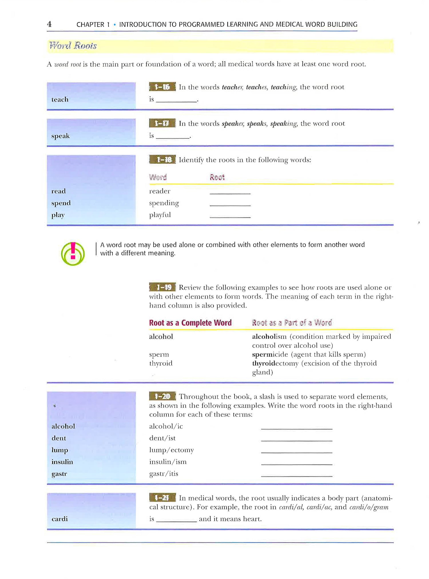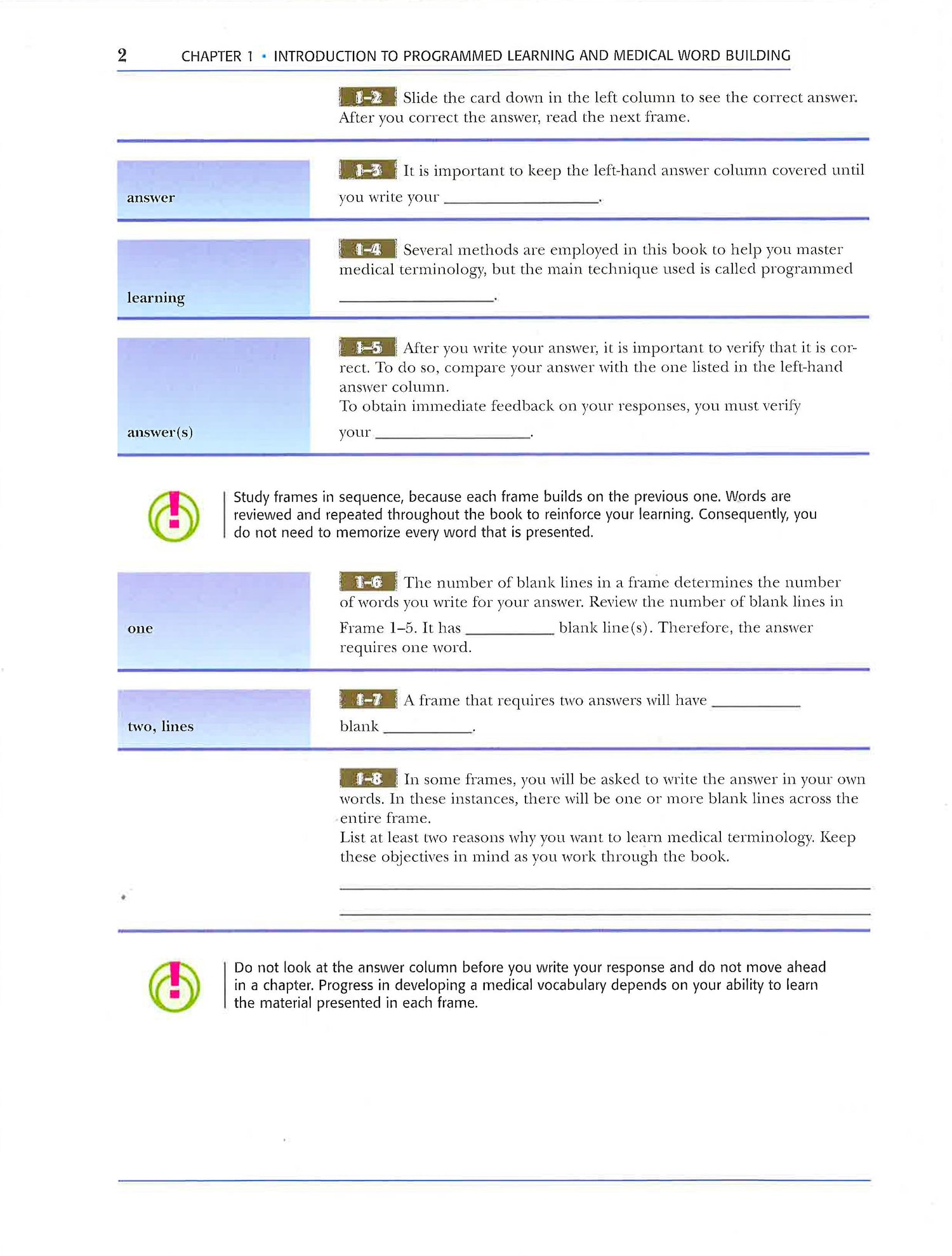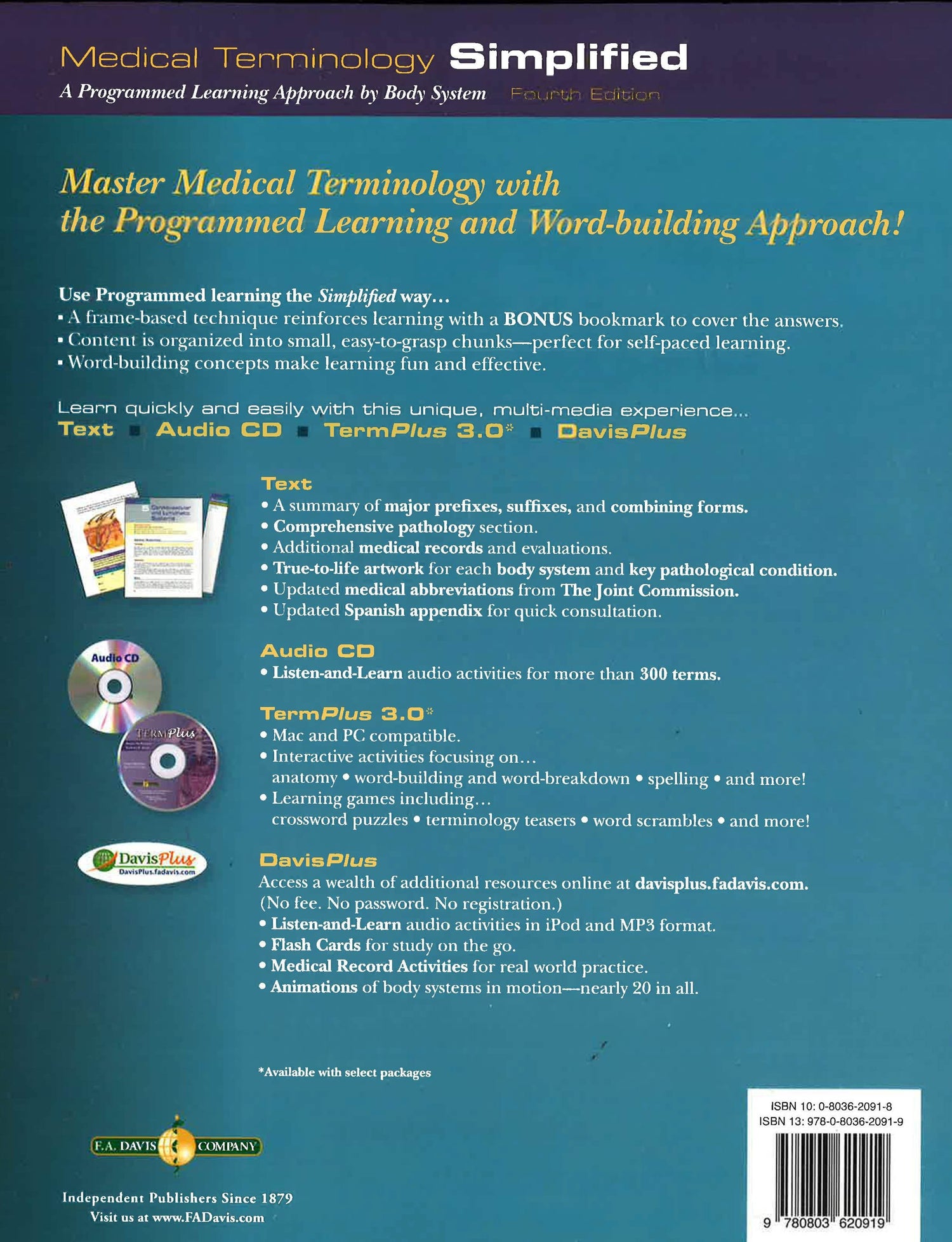 A programmed learning, word-building approach is ideal for self-paced learning and review and in-class instruction! The 4th Edition of this popular textbook continues to incorporate the most current trends and approaches to teaching medical terminology. Each body system unit features a summary of major combining forms, a comprehensive pathology section, and additional medical records and evaluations to help your students learn quickly and easily. Give your students the freedom to learn at their own pace, both inside or outside of the classroom. A learning aid bookmark and audio CD (packaged with every book) lets them learn on the go.