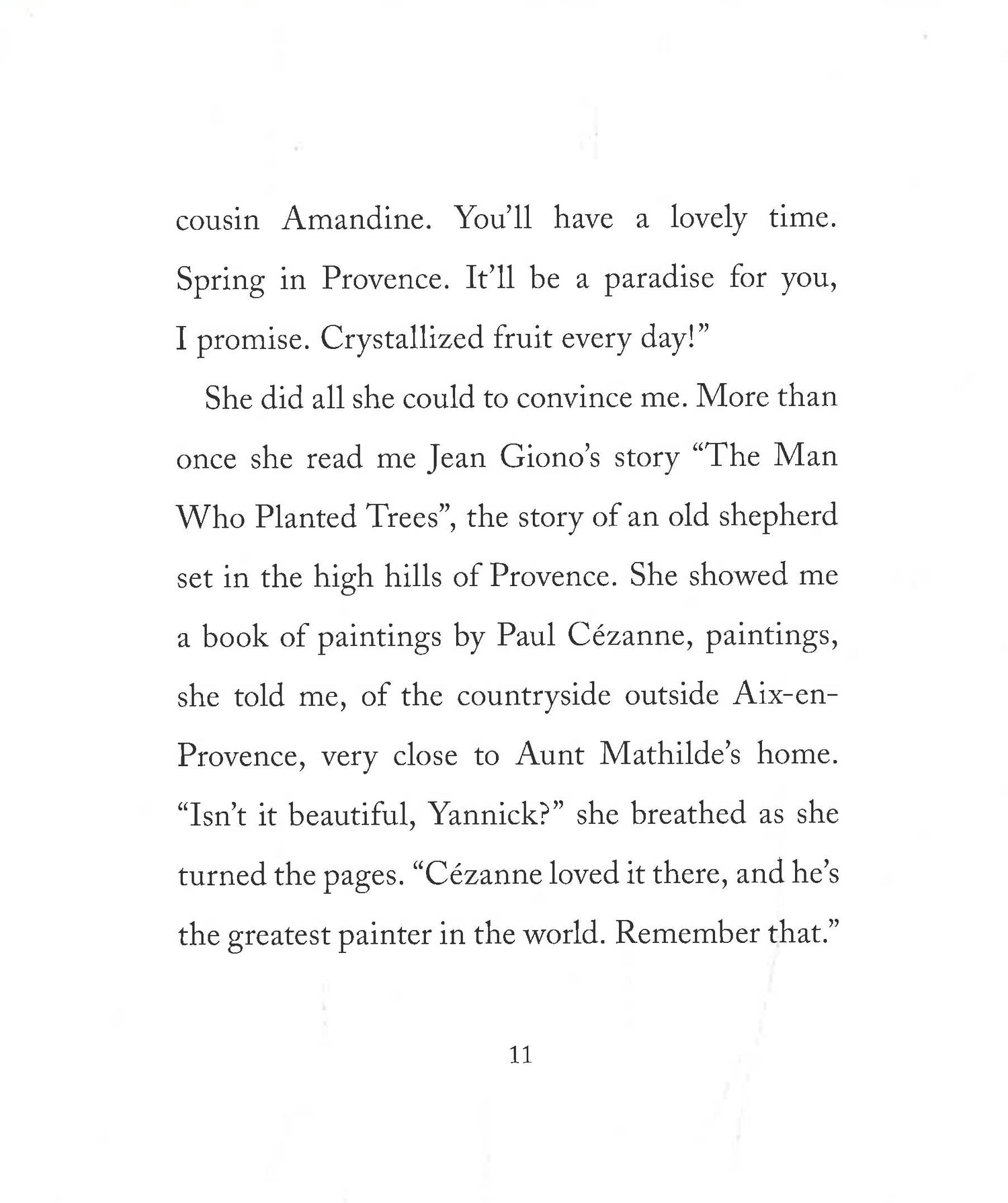 When Yannick is sent to stay with his Aunt Mathilde in the South of France, he cannot believe his luck. If the paintings of his mother’s beloved Cezanne are to be believed, surely Provence is paradise itself. So begins an idyllic month for the young boy. By day he roams the rolling hills and valleys of Aix-en-Provence. At night, he helps out at his aunt’s bustling village inn. All the while, he dreams about his beautiful cousin Amandine, feeling he has come to the most wonderful place in the world. But Yannick’s joy is shattered when he accidentally destroys a precious drawing by Cezanne himself. As he tries to put things right, he makes the most surprising discovery…