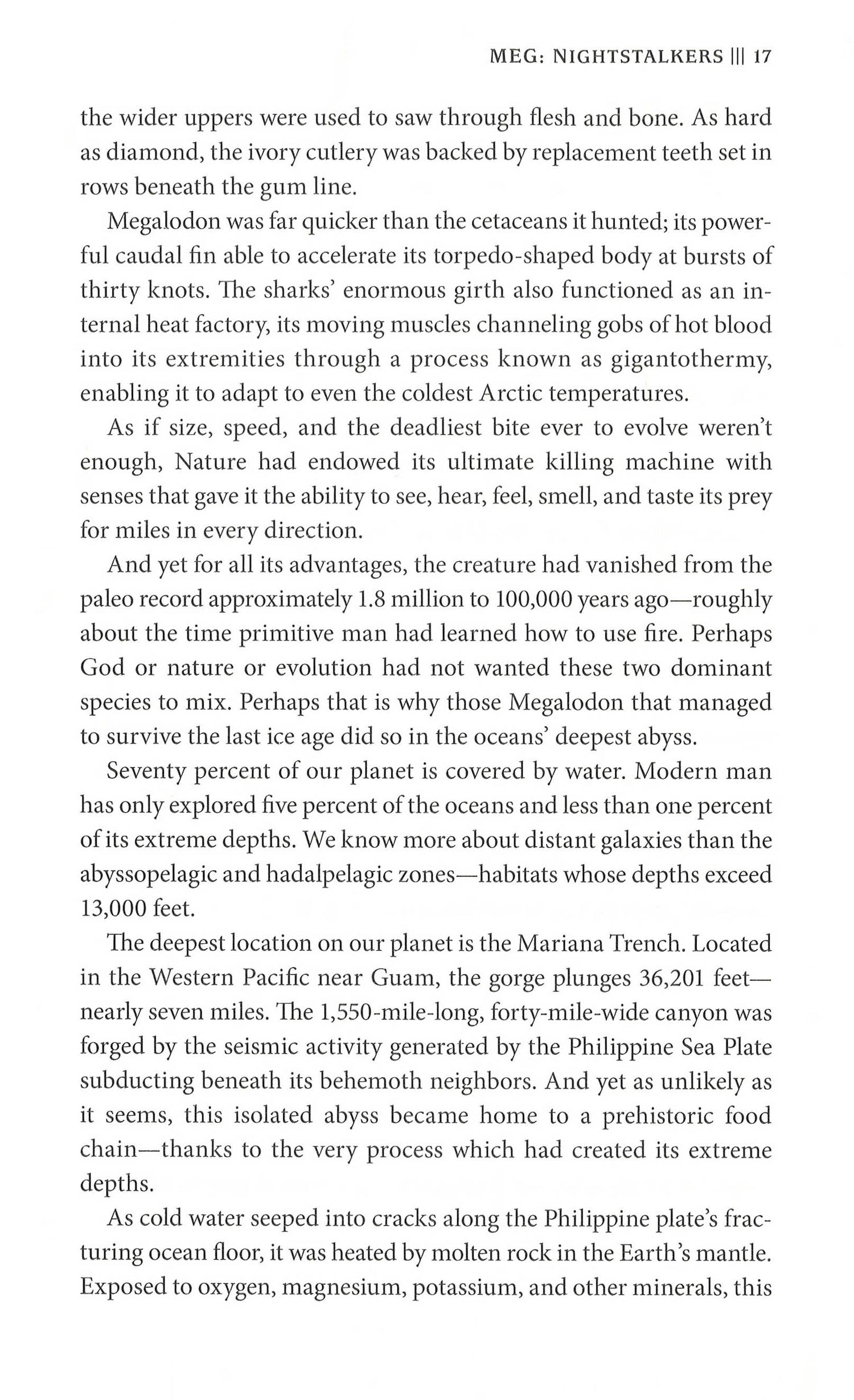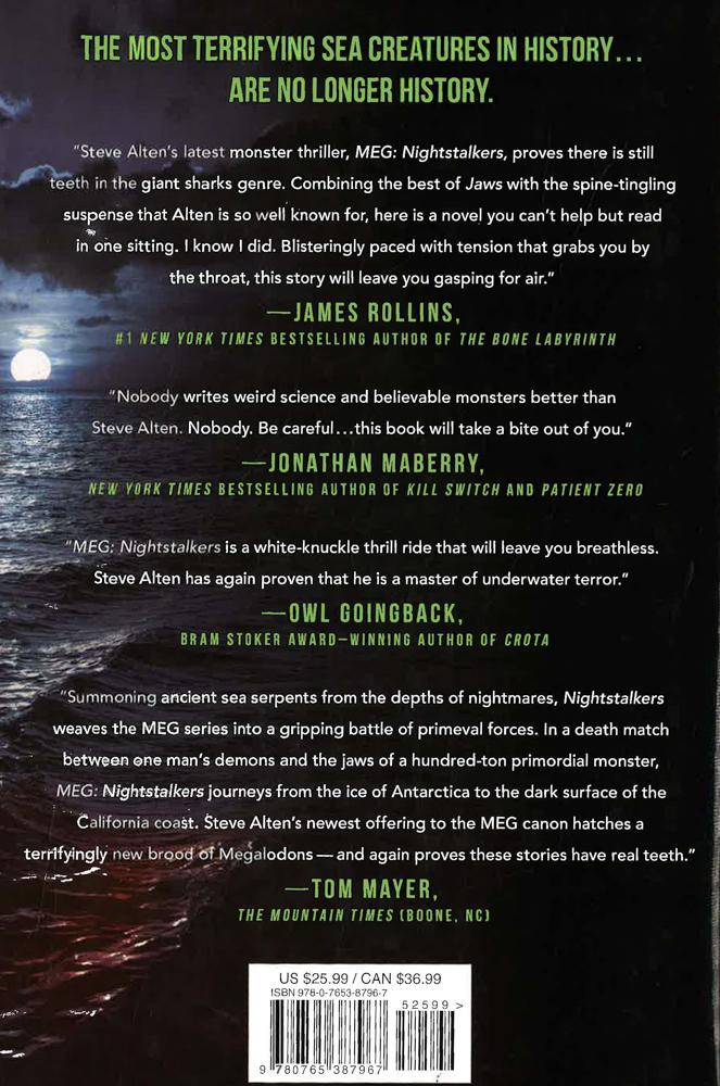 In this fifth installment of the New York Times bestselling MEG series, Nighstalkers picks up where MEG: Hell's Aquarium left off. Bela and Lizzy, the dominant Megalodon siblings from Angel's brood, have escaped the Tanaka Institute to roam the Salish Sea in British Columbia. While Jonas Taylor and his friend Mac attempt to either recapture or kill the "sisters," Jonas's son, David, embarks on his own adventure, motivated by revenge. Having witnessed his girlfriend's gruesome death, David has joined a Dubai Prince's ocean expedition, tracking the 120-foot, hundred-ton Liopleurodon that escaped from the Panthalassa Sea. Haunted by night terrors, David repeatedly risks his life to lure the Lio and other prehistoric sea creatures into the fleet's nets, while battling his own suicidal demons.Steve Alten weaves these storylines together in a page-turning thriller that culminates in a final showdown between the most dangerous predators ever to inhabit the planet.