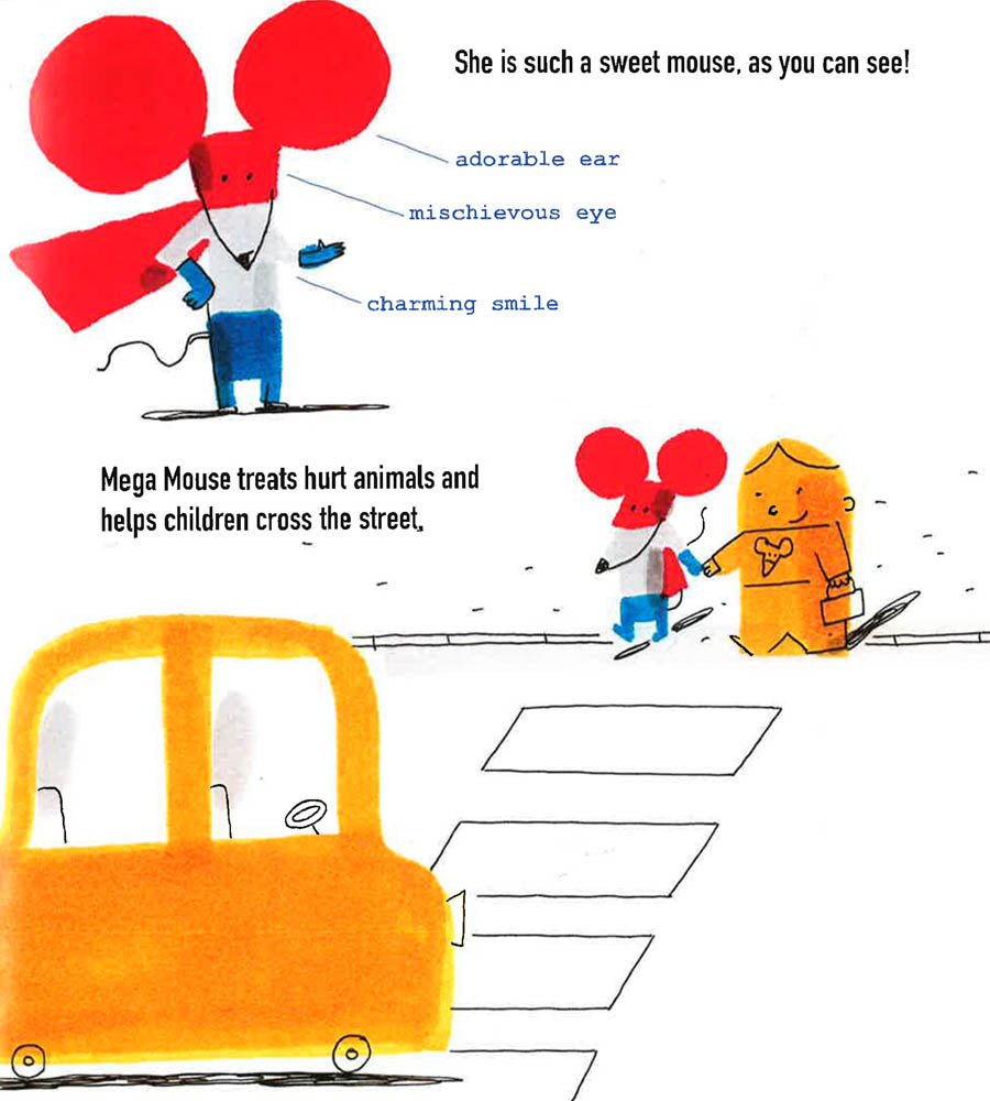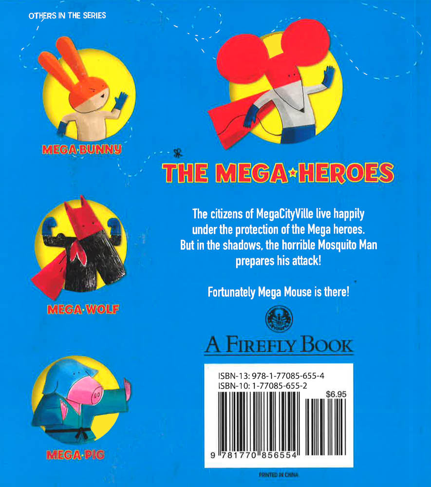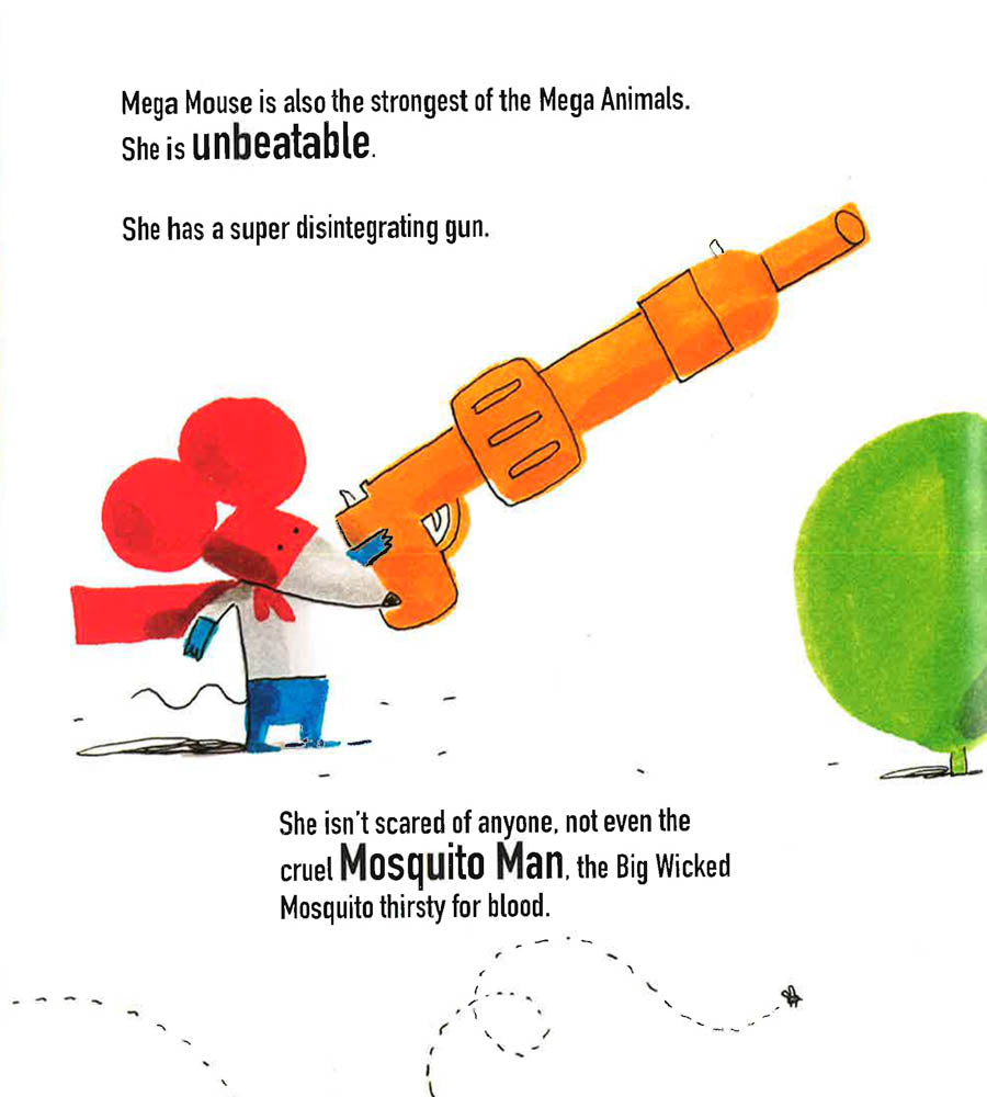 Mega City is full of Mega Animals. There is Mega Wolf, who loves sports cars; Mega Bunny, who is always losing things; the elegant Mega Pig; and the cheese-loving Mega Mouse. These are the heroes that keep Mega City safe from the dastardly and bloodthirsty Mosquito Man. Mega Mouse is the strongest of the Mega Animals. She likes to help injured animals and children. She has a super-powerful disintegrator gun and is not afraid of anyone. One day, Mega Mouse's friend Mega Pig takes some children are on a bus trip. Suddenly, there is an SOS call. BOOM! Mosquito Man has destroyed the bridge. This is awful. The bus will fall. 'Help! Help!' shout the children. Mega Mouse will save them! She is so strong she does not even need her disintegrator gun. She lifts the bus using her own strength. Mega Mouse has saved the children on Bus 14...and she loves Mega Pig. 'Shhh...it's a secret!'