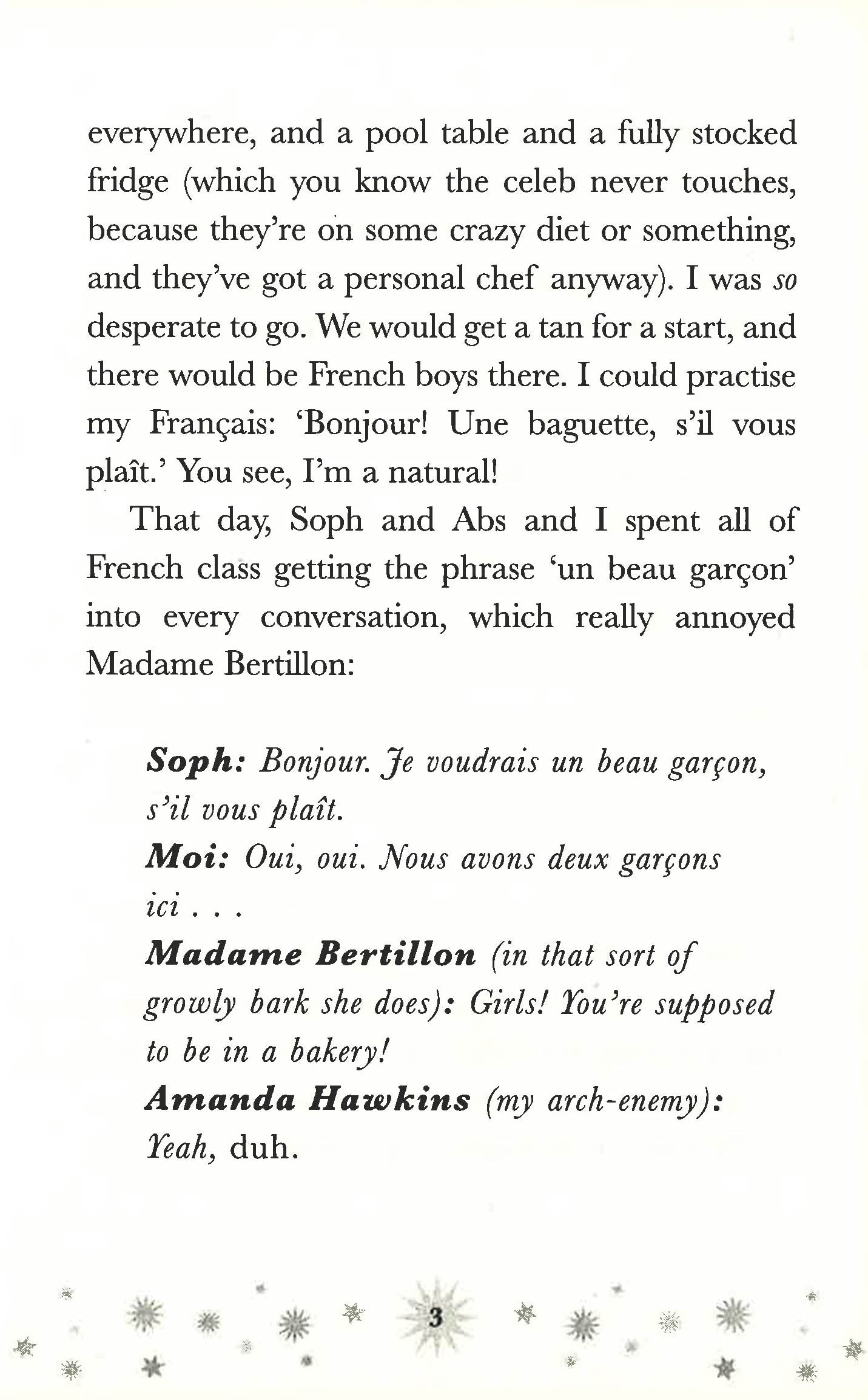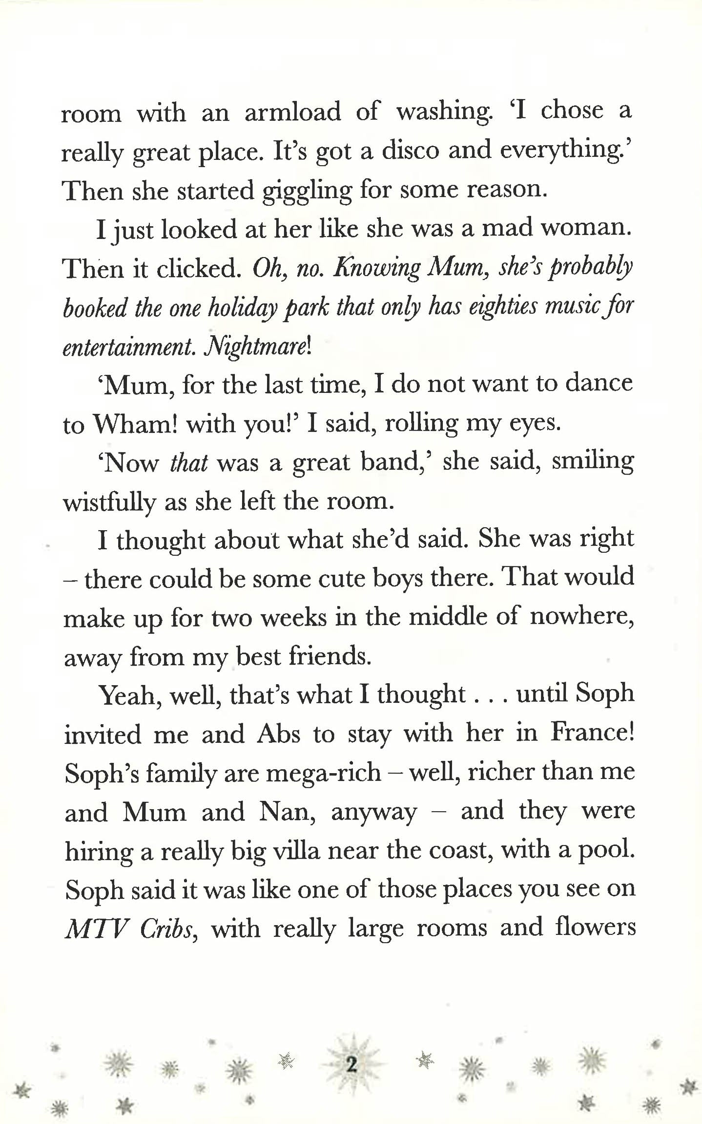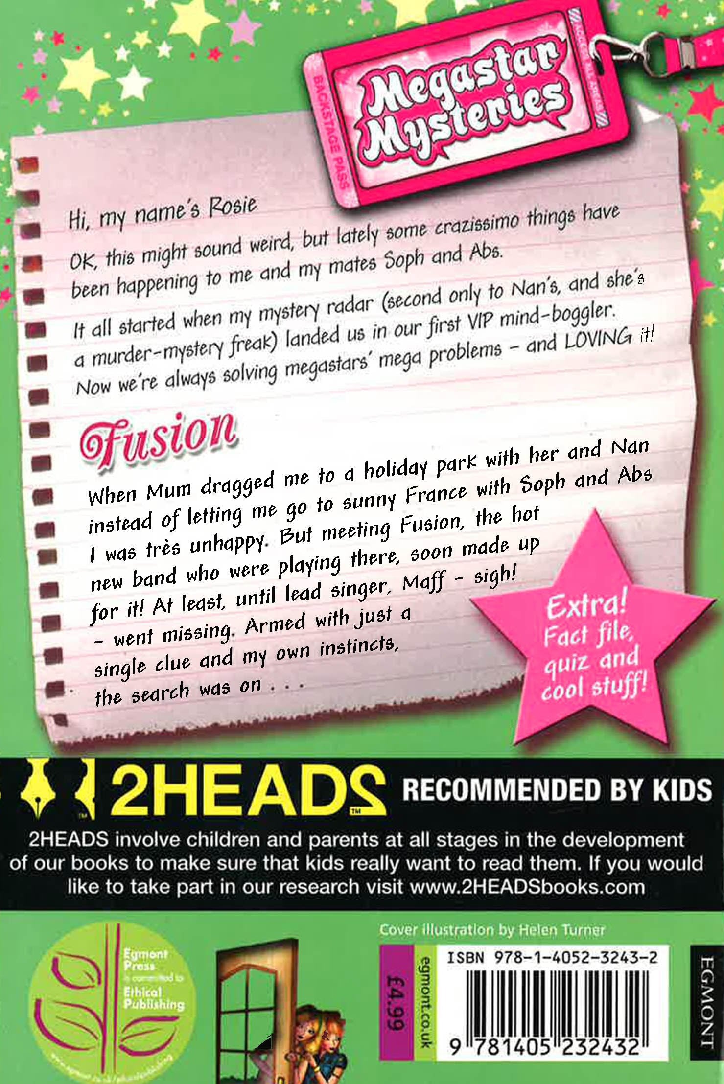 Rosie and her best mates Soph and Abs are three regular girls. They like regular-girl things; they eat regular-girl food and wear regular-girl gear. In book one in the "Megastar Mysteries" series, their regular-girl lives are turned upside down when Rosie gets caught up with a desperate plea for help from a mega pop star, Mirage Mullins, who's doing a signing in their local record shop. The girls don't know quite what to do, but they'll go to any lengths to help save the career of their favourite pop star. The trio of friends must find a way to solve the murky mystery surrounding Mirage's gorgeous stepbrother, Joe, and they resolve to get to the bottom of the strange behaviour of Mirage's manager, Simone Jones. Over the course of the "Megastar Mysteries" series, Rosie and her friends unintentionally stumble upon other celebrity mysteries that need solving and, much to their delight, are always finding themselves in demand by mega stars with mega problems. Readers will fall in love with Maff, the troubled star of rising pop band Fusion, actress twins Paige and Shelby, teen model Angel, soap opera star Cassie St Claire and the enigmatic new chart sensation Songbird.