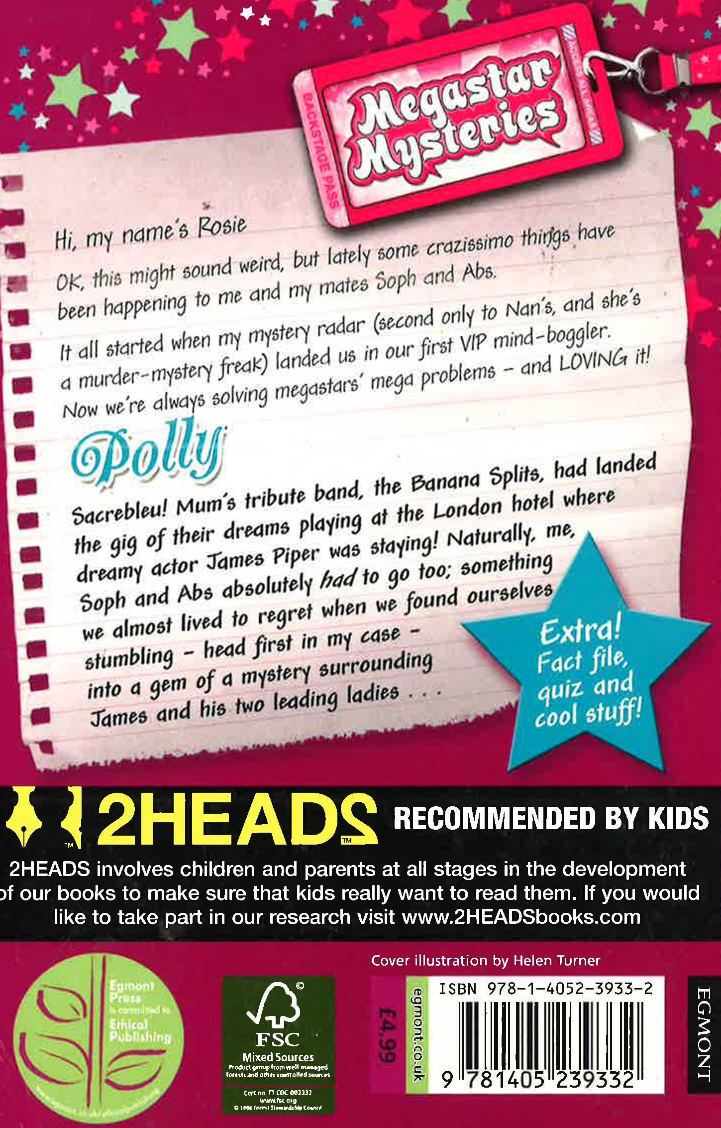 Rosie and her best mates Soph and Abs are three regular girls. They like regular-girl things; they eat regular-girl food and wear regular-girl gear. In book one in the "Megastar Mysteries" series, their regular-girl lives are turned upside down when Rosie gets caught up with a desperate plea for help from a mega pop star, Mirage Mullins, who's doing a signing in their local record shop.The girls don't know quite what to do, but they'll go to any lengths to help save the career of their favourite pop star. The trio of friends must find a way to solve the murky mystery surrounding Mirage's gorgeous stepbrother, Joe, and they resolve to get to the bottom of the strange behaviour of Mirage's manager, Simone Jones.Over the course of the "Megastar Mysteries" series, Rosie and her friends unintentionally stumble upon other celebrity mysteries that need solving and, much to their delight, are always finding themselves in demand by mega stars with mega problems.In "Polly", actor James Tyler's fiancee April is jealous of the chemistry that seems to be developing between him and his co-star, Polly.