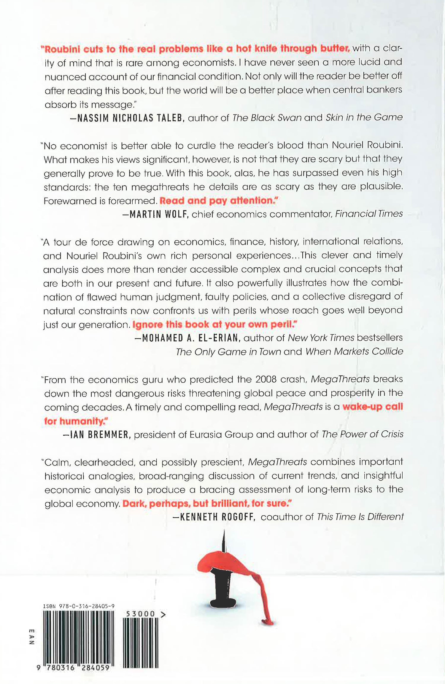 Renowned economist Nouriel Roubini was nicknamed “Dr. Doom,” until his prediction of the 2008 housing crisis and Great Recession came true--when it was too late. Now he is back with a much scarier prediction, one that we ignore at our peril. There are no fewer than ten overlapping, interconnected threats that are so serious, he calls them Megathreats. From the worst debt crisis the world has ever seen, to governments pumping out too much money, to borders that are blocked to workers and to many shipments of goods, to the rise of a new superpower competition between China and the U.S., to climate change that strikes directly at our most populated cities, we are facing not one, not two, but ten causes of disaster. There is a slight chance we can avoid them, if we come to our senses—but we must act now.