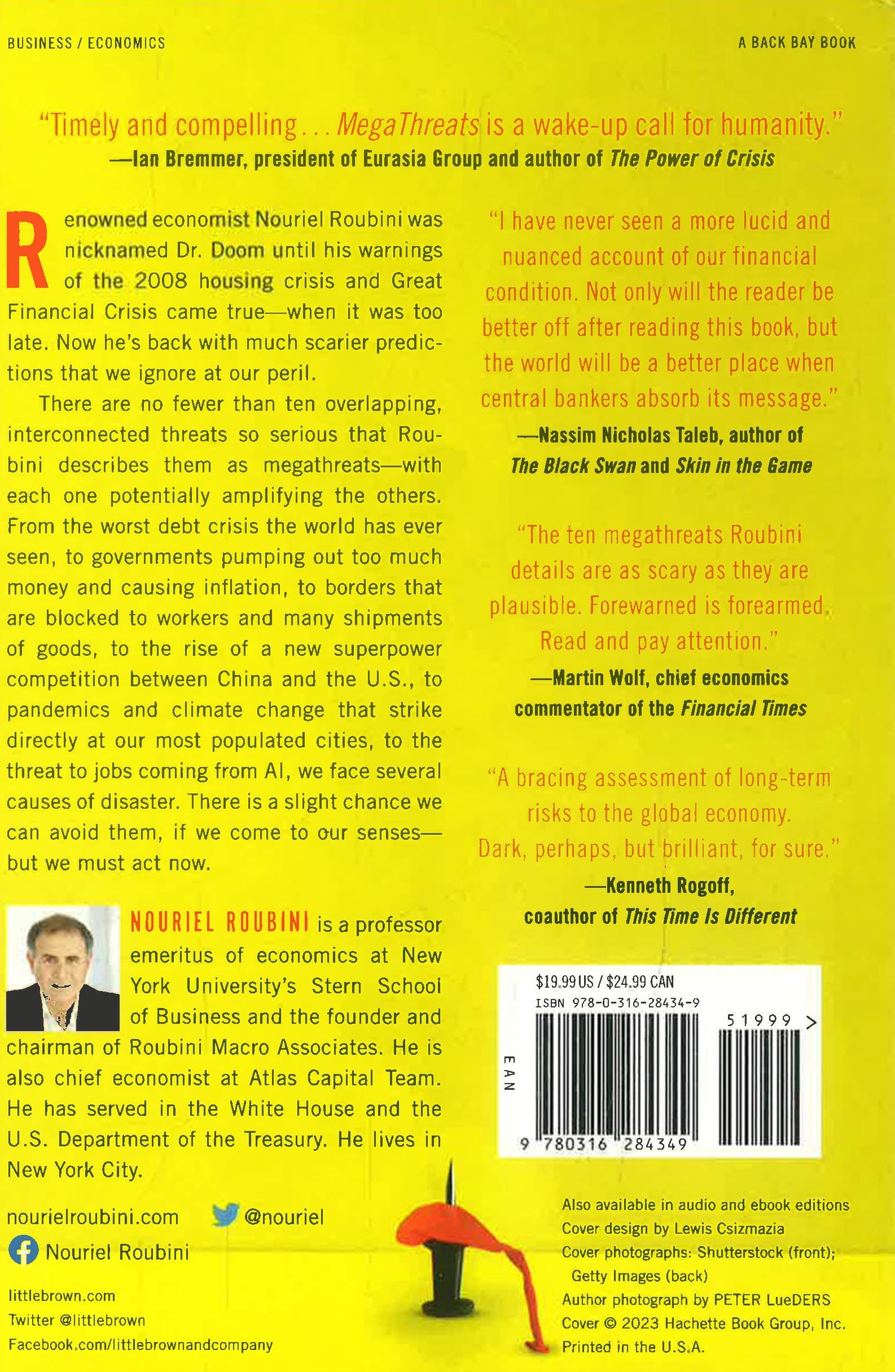 Renowned economist Nouriel Roubini was nicknamed “Dr. Doom,” until his prediction of the 2008 housing crisis and Great Recession came true--when it was too late. Now he is back with a much scarier prediction, one that we ignore at our peril. There are no fewer than ten overlapping, interconnected threats that are so serious, he calls them Megathreats. From the worst debt crisis the world has ever seen, to governments pumping out too much money, to borders that are blocked to workers and to many shipments of goods, to the rise of a new superpower competition between China and the U.S., to climate change that strikes directly at our most populated cities, we are facing not one, not two, but ten causes of disaster. There is a slight chance we can avoid them, if we come to our senses—but we must act now.