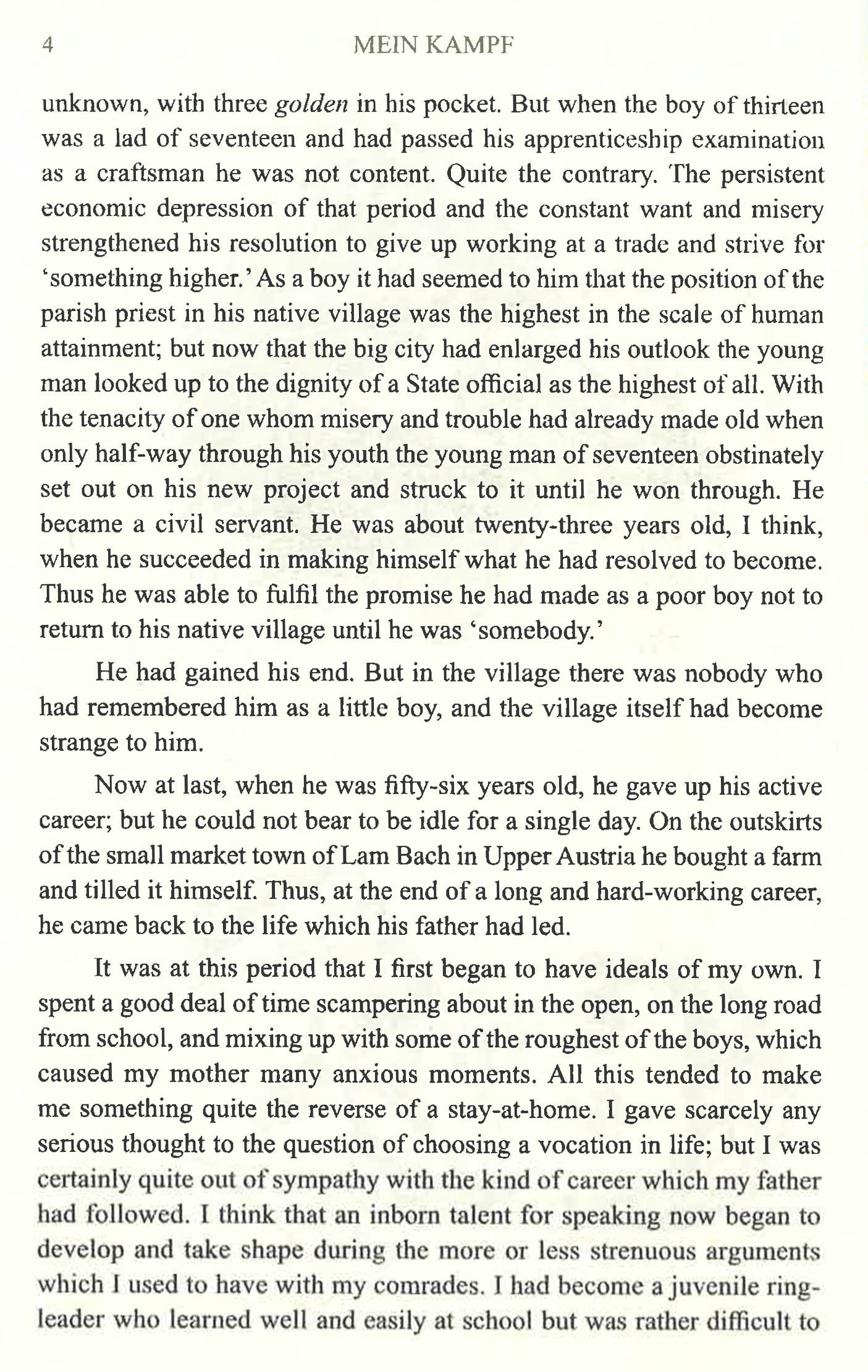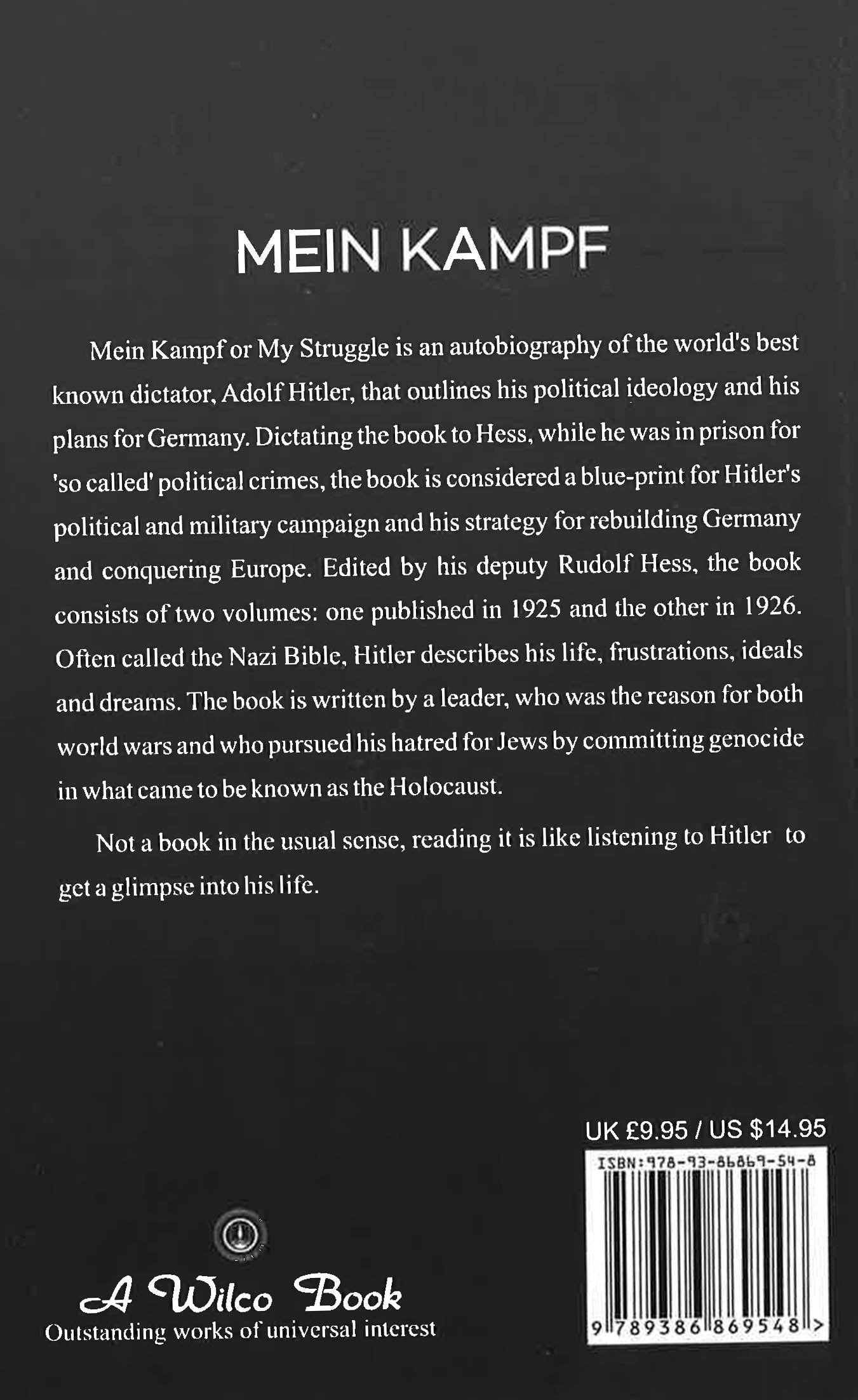 Mein Kampf- Adolf Hitler Complete and Unabridged. Mein Kampf or my struggle is an autobiography of the world's best known dictator, Adolf Hitler, that outlines his political ideology and his plans for Germany. Dictating the book to Hess, while he was in prison for 'so called' political crimes, the book is considered a blue-print for Hitler's political and military campaign and his strategy for rebuilding Germany and conquering Europe. Edited by his deputy Rudolf Hess, the book consists of two volumes: one published in 1925 and the others in 1926. Often called the Nazi Bible, Hitler describes his life, frustrations, ideals and dreams. The book is written by a leader, who was the reason for both world wars and who pursuednhis hatred for Jews by committing genocide in what came to be known as the Holocust. Not a book in the usual sense, reading it is like listening to Hitler to get a glimpse into his life.