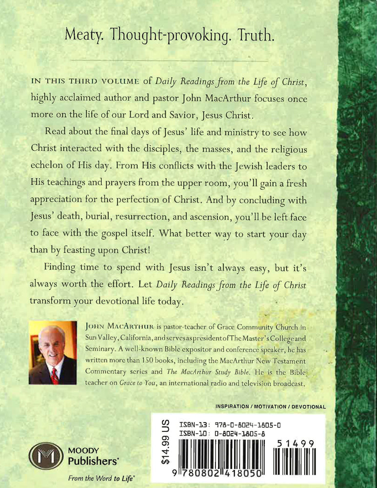 In this third volume of Daily Readings from the Life of Christ, highly acclaimed author and speaker John MacArthur walks you through the final days of Jesus' life and ministry. See how Jesus interacts with the disciples, the crowds, and the religious echelon of His time. From His conflicts with the Jewish leaders to His teachings and prayers from the upper room, you'll gain a fresh appreciation for the perfection of Christ. And by concluding with Jesus' death, burial, resurrection, and ascension, you'll be left face-to-face with the gospel itself. What better way to start your day than by gazing upon Christ.