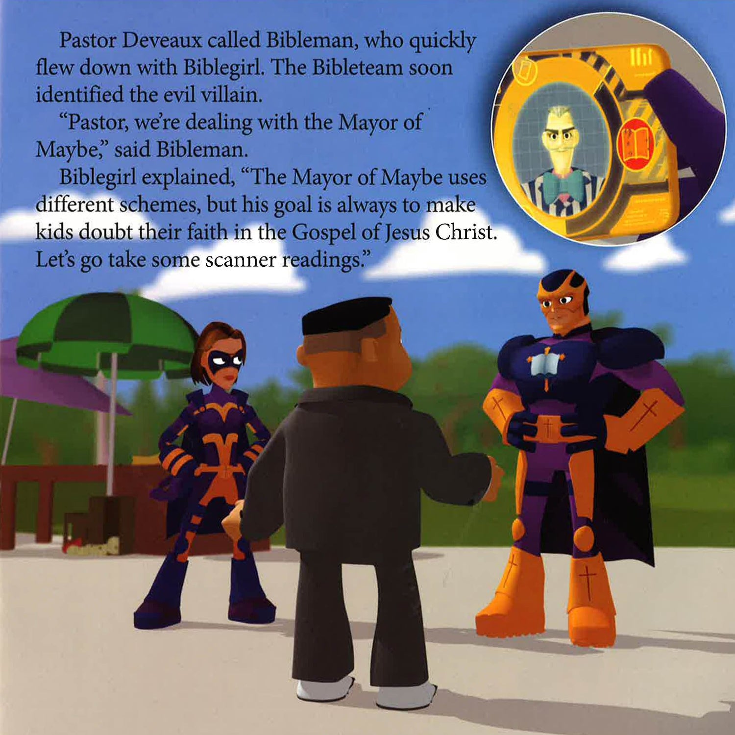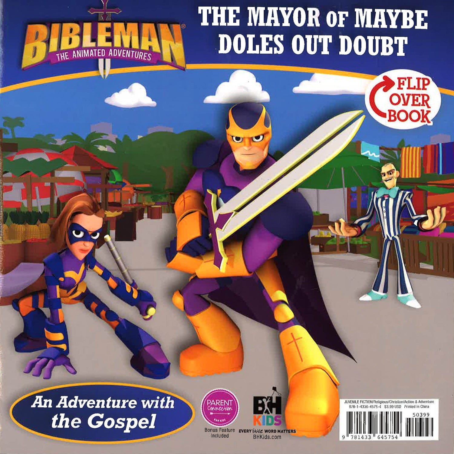 What's better than a new Bibleman adventure? Two new Bibleman adventures! When you open this Bibleman Flip-Over book, you'll find two exciting stories and learn two lessons from God's Word! Read about how the Bibleman team uses the power of kindness in Melting the Master of Mean. Then flip the book over to see them use the Gospel to take on a new villain in The Mayor of Maybe Doles Out Doubt. Join the all new Bibleman on his next adventure, and let him show YOU the power in God's Word.