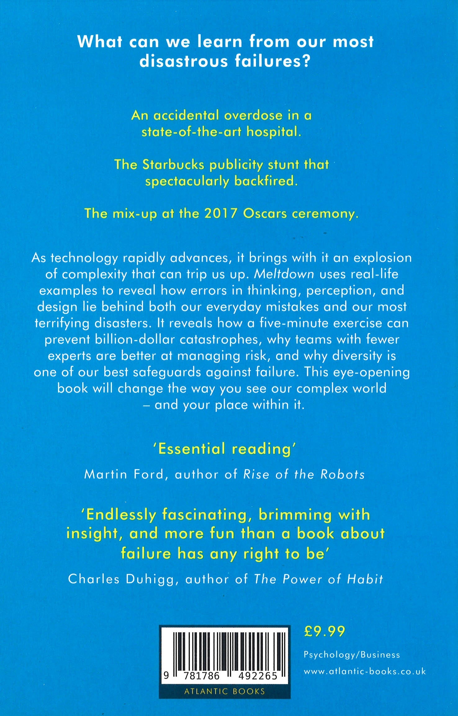 Financial Times' best business books of the year, 2018'Endlessly fascinating, brimming with insight, and more fun than a book about failure has any right to be.' - Charles Duhigg, author of The Power of Habit What can we learn from our most disastrous failures?An accidental overdose in a state-of-the-art hospital.The Starbucks publicity stunt that spectacularly backfired.The mix-up at the 2017 Oscars ceremony.As technology rapidly advances, it brings with it an explosion of complexity that can trip us up. Meltdown uses real-life examples to reveal how errors in thinking, perception, and design lie behind both our everyday mistakes and our most terrifying disasters. It reveals how a five-minute exercise can prevent billion-dollar catastrophes, why teams with fewer experts are better at managing risk, and why diversity is one of our best safeguards against failure. This eye-opening book will change the way you see our complex world - and your place within it.'Essential reading.' - Martin Ford, bestselling author of Rise of the Robots