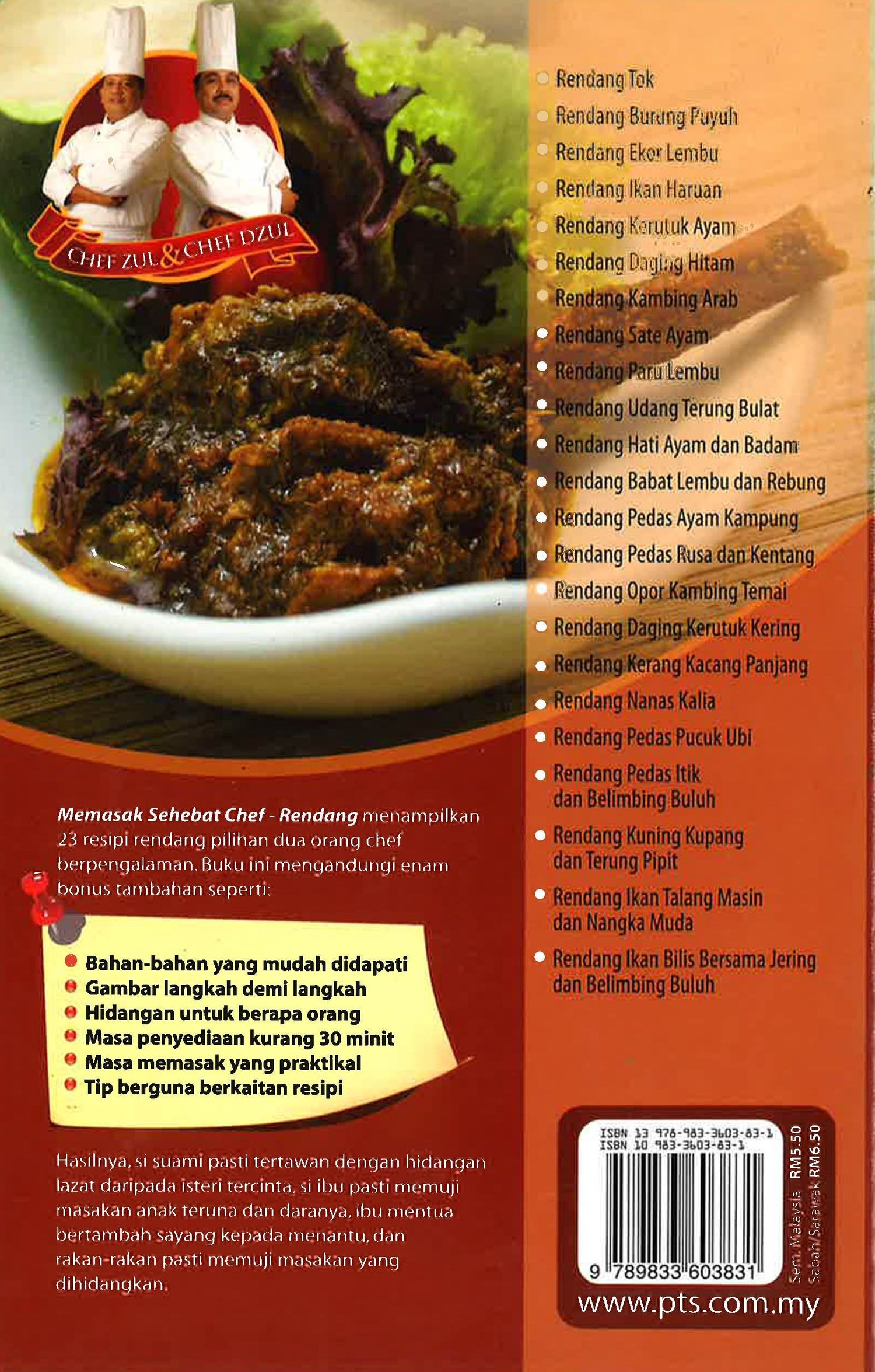 Memasak Sehebat Chef- Rendang menampilkan 23 resipi rendang pilihan dua orang chef berpengalaman. Buku ini mengandungi enam bonus tambahan seperti: Bahan-bahan yang mudah didapati, gambar langkah demi langkah, hidangan untuk berapa orang, masa penyediaan kurang 30 minit, masa memasak yang praktikal, tip berguna berkaitan resipi. Hasilnya, si suami pasti tertawan dengan hidangan lazat daripada isteri tercinta, si ibu pasti memuji masakan anak teruna dan daranya, ibu mentua bertambah sayang kepada menantu, dan rakan-rakan pasti memuji masakan yang dihidangkan.