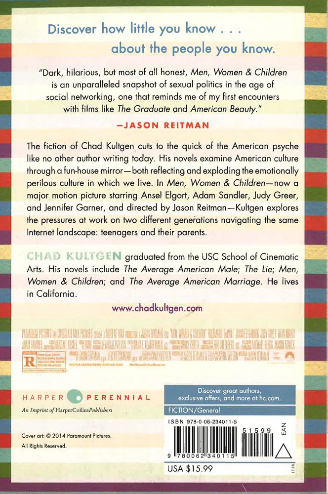 The fiction of Chad Kultgen cuts to the quick of the American psyche like no other author writing today. His novels examine American culture through a fun-house mirror--both reflecting and exploding the emotionally perilous culture in which we live. In Men, Women & Children, Kultgen explores the pressures at work on two different generations navigating the same Internet landscape: teenagers and their parents.
