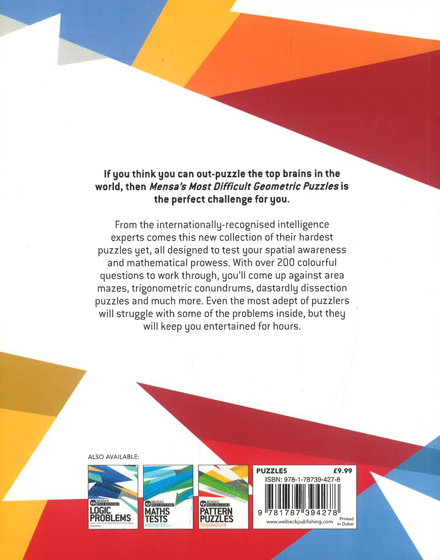 The high IQ society's most ingenious puzzle setters have created a series of conundrums to stretch your spatial awareness and mathematical dexterity. With 200 puzzles, you will come up against area mazes, trigonometric conundrums and dastardly dissection puzzles. This colourful puzzle book is certain to keep you entertained for hours.