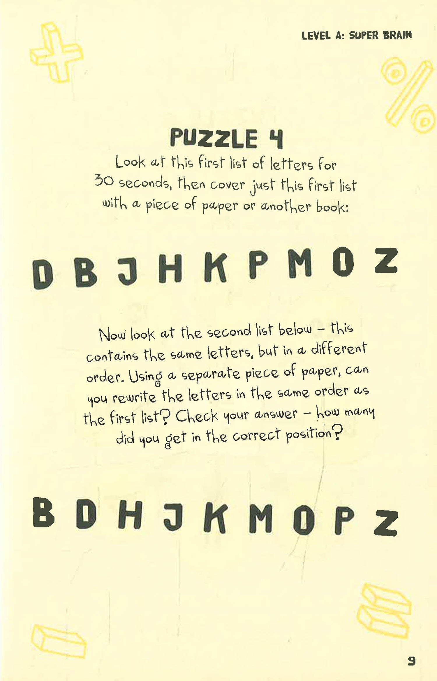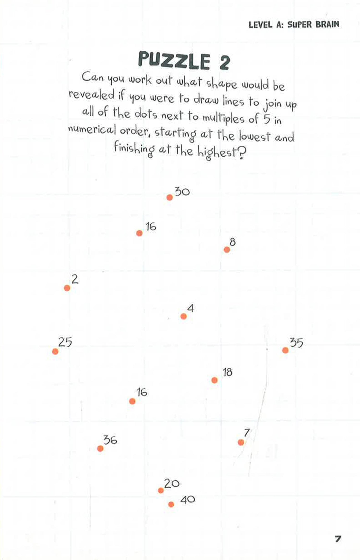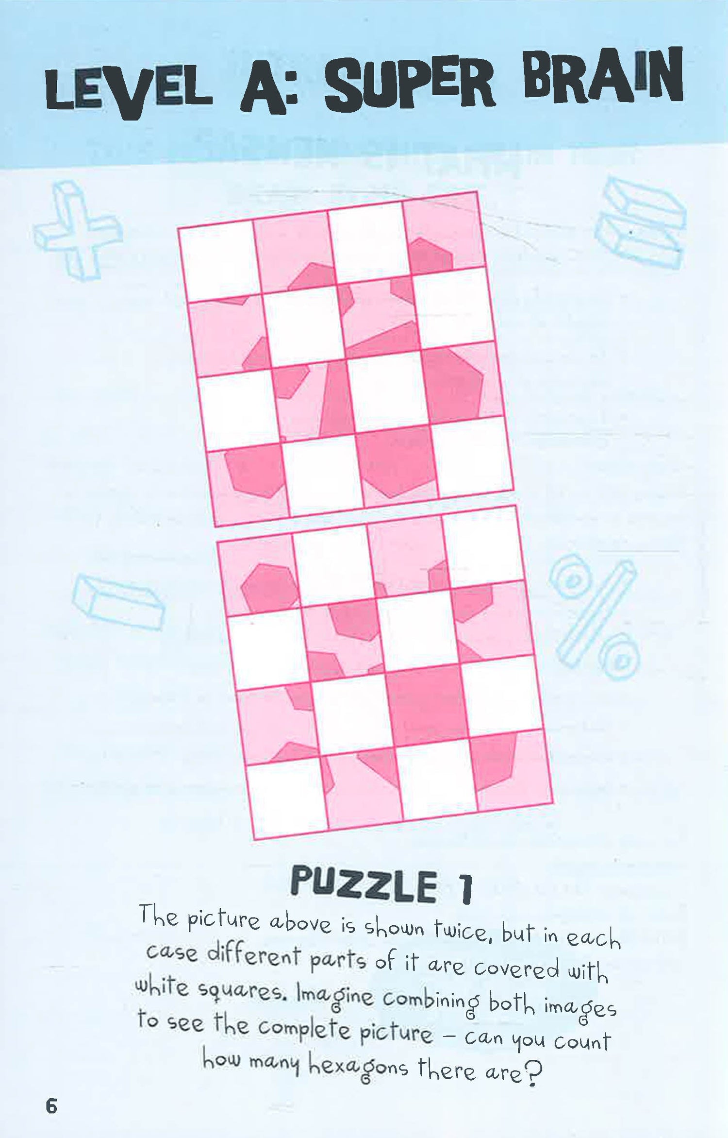 The book contains 96 puzzle-packed pages. It is split into three levels of difficulty, called Super Brain, Mega Mind and Ultra Genius. The levels get considerably harder as the book progresses and as kids improve their puzzle skills. The variety of different types of challenges, including numerical, logical and word puzzles, will test all areas of puzzle solving. All the answers can be found at the back of the book. Kids will have fun putting their brain to the test and seeing how many puzzles they can work out correctly.