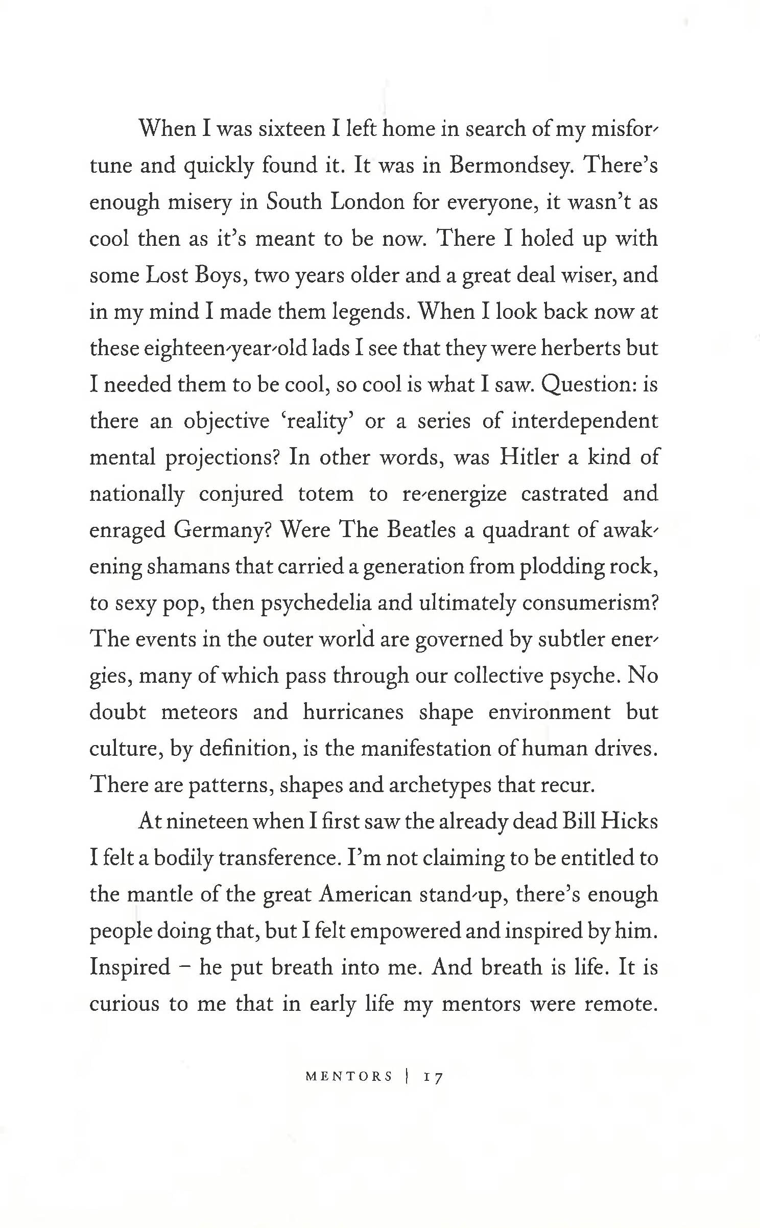 "I have mentors in every area of my life, as a comic, a dad, a recovering drug addict, a spiritual being and as a man who believes that we, as individuals and the great globe itself, are works in progress and that through a chain of mentorship we can improve individually and globally, together . . . One of the unexpected advantages my drug addiction granted is that the process of recovery that I practise includes a mentorship tradition.