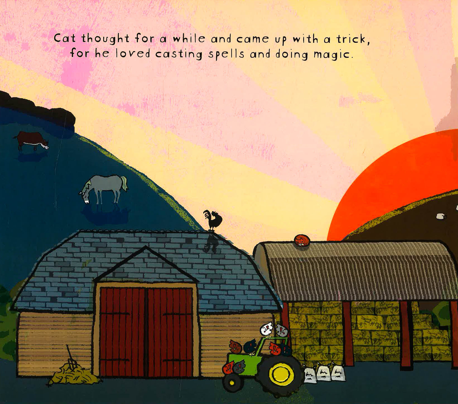 It's a noisy morning in the barnyard: roosters crowing, cows mooing, mice squeaking! And the farmer's cat has had enough. With a flick of his tail, the cat casts a spell and the barnyard is turned upside-down. The chickens are oinking, the sheep are barking, and the sheepdog can only let out a confused "Baa?" It's not long before the animals figure out who's to blame...