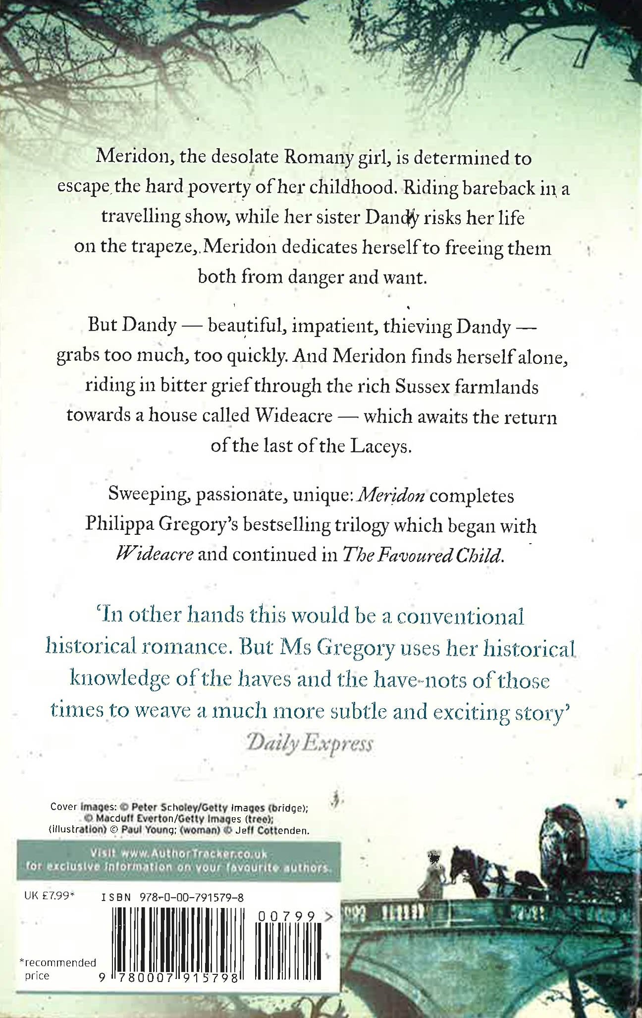 Meridon knows she does not belong in the dirty, vagabond life of a gypsy bareback rider. The half-remembered vision of another life burns in her heart, even as her beloved sister, Dandy, risks everything for their future. Alone, Meridon follows the urgings of her dream, riding in the moonlight past the rusted gates, up the winding drive to a house -- clutching the golden clasp of the necklace that was her birthright -- home at last to Wideacre. The lost heir of one of England's great estates would take her place as its mistress.... Crowning the extraordinary trilogy that began with Wideacre and The Favored Child, Meridon is a rich, impassioned tapestry of a young woman's journey from dreams to glittering drawing rooms and elaborate deceits...from a simple hope to a deep and fulfilling love. Set in the savage contrasts of Georgian England -- a time alive with treachery, grandeur, and intrigue -- Meridon is Philippa Gregory's masterwork