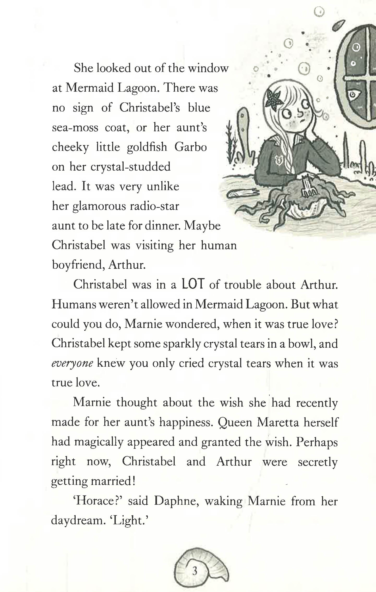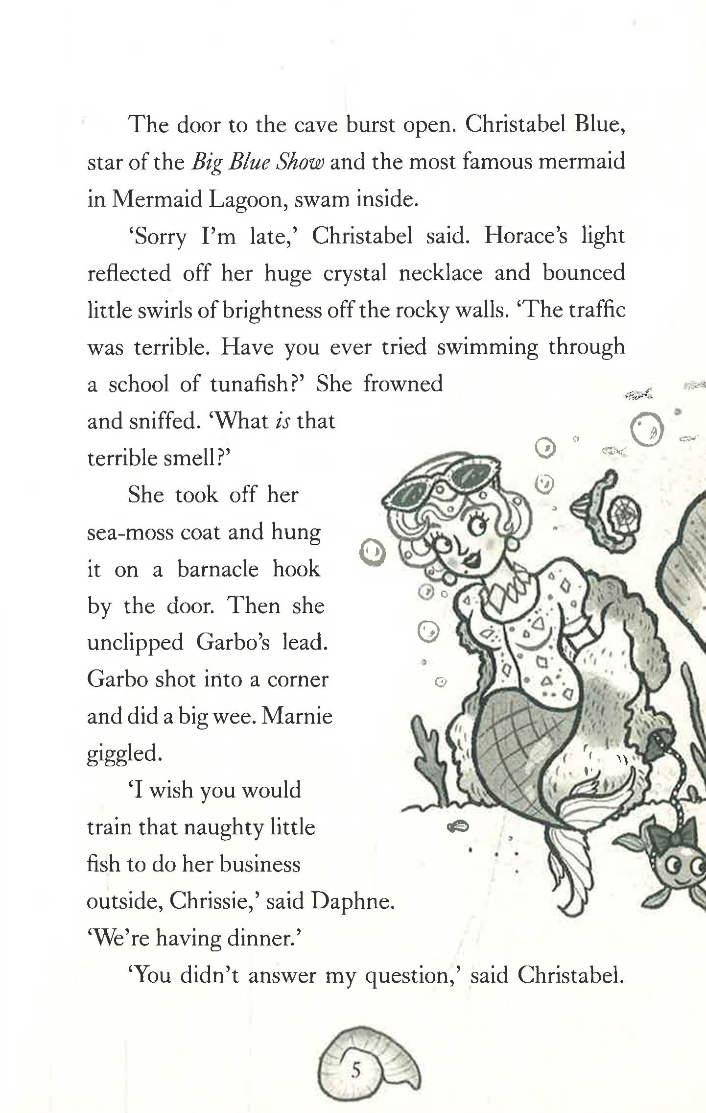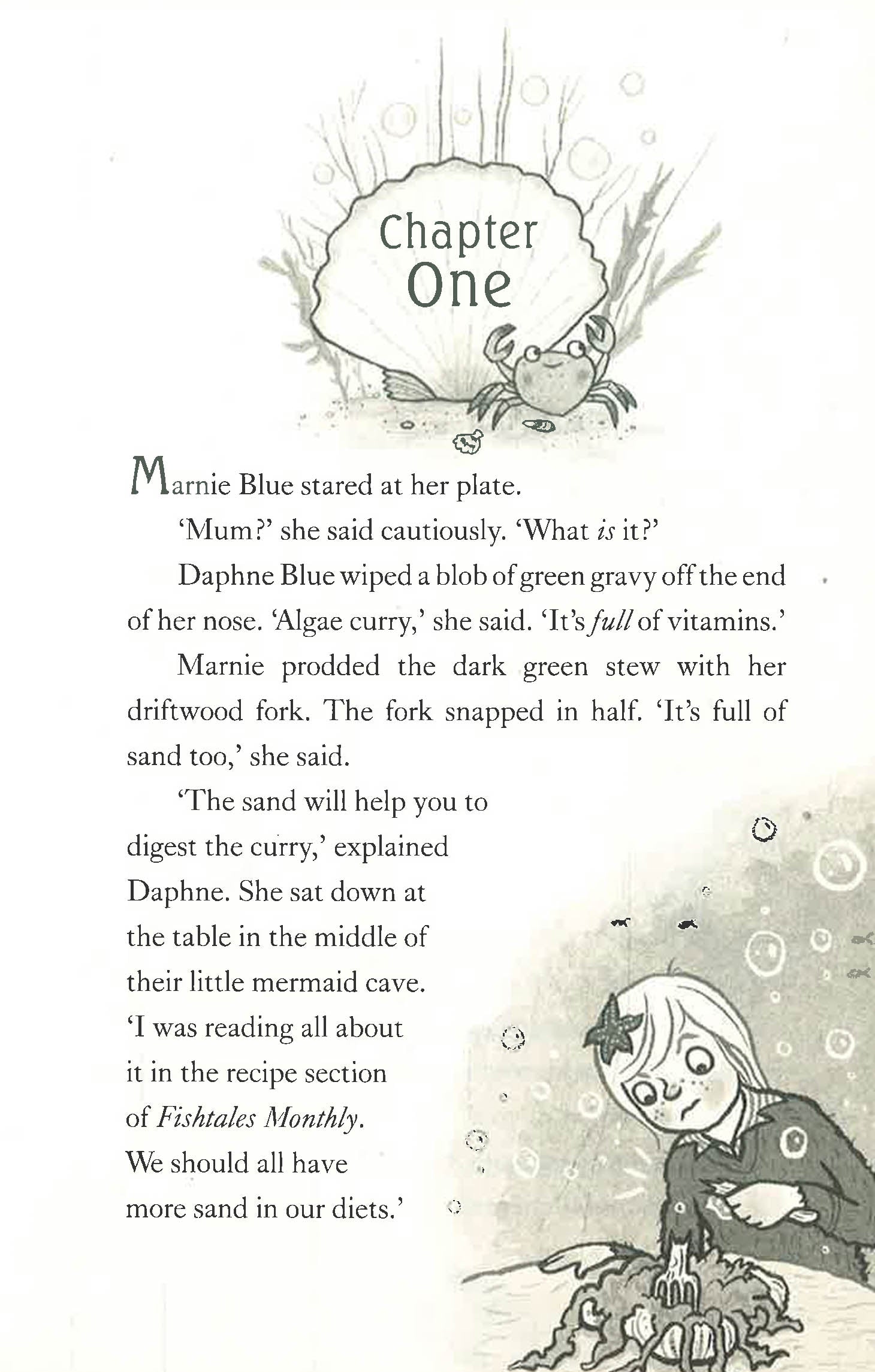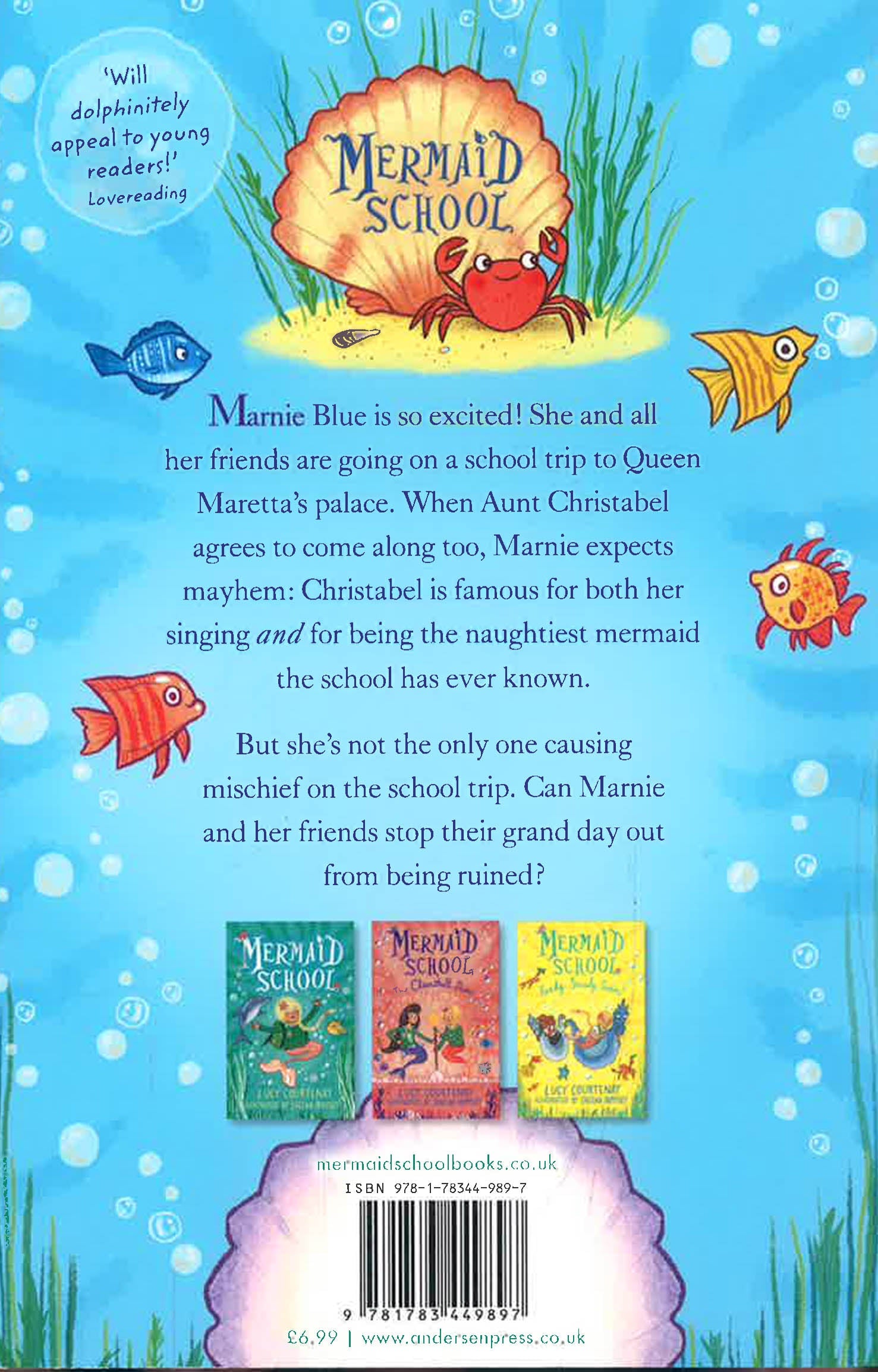 Marnie Blue is so excited! She is going on a school trip to see the legendary palace of Queen Maretta with all her friends. But when Mum is too unwell to join the trip, Aunt Christabel agrees to come in her place, and she was offishially the naughtiest mermaid the school has ever known. Marnie expects mayhem. Will they board the whale-shark on time? Will everyone eat their packed lunches on the way there? And just who is sneaking around the palace causing all sorts of mischief?