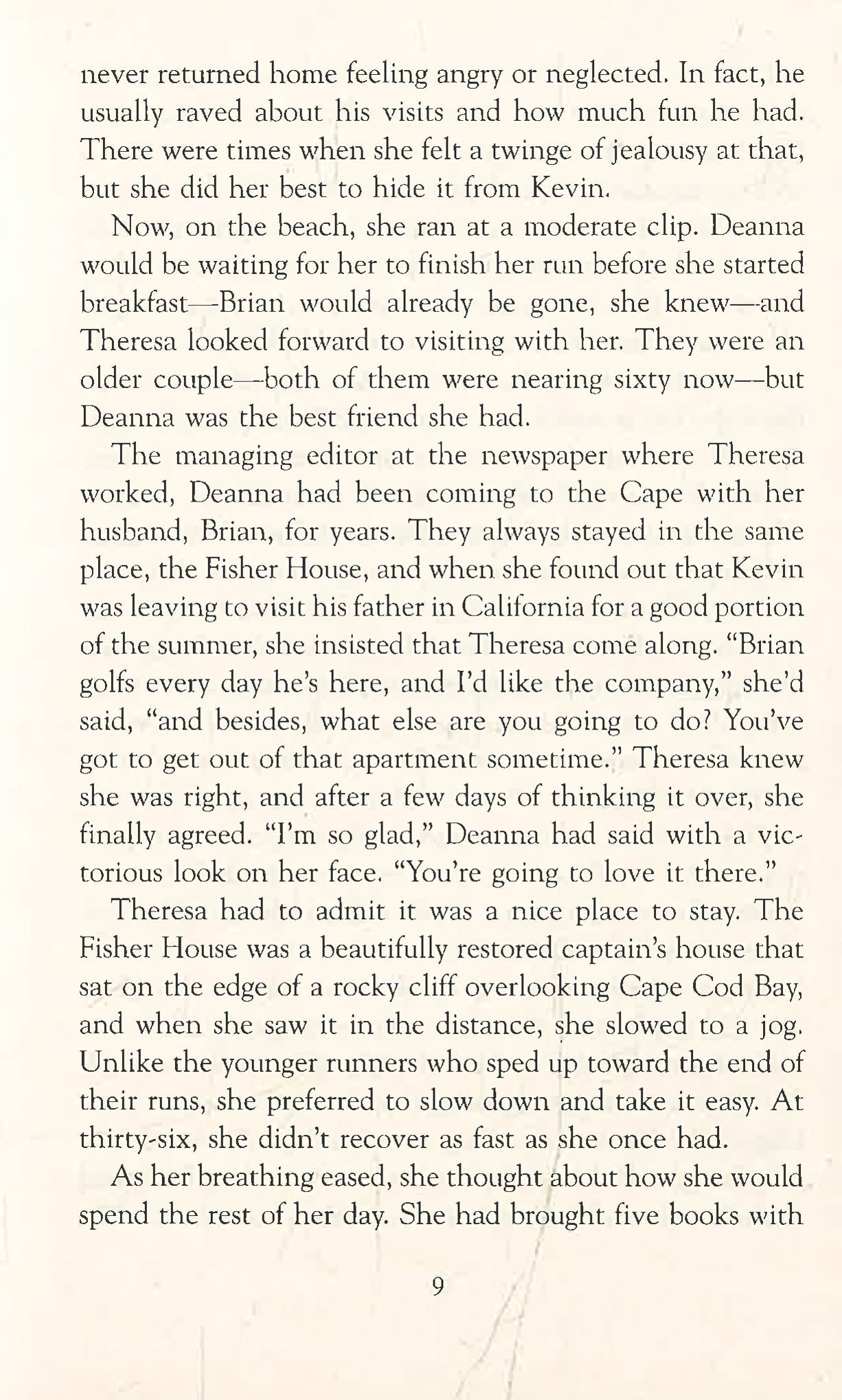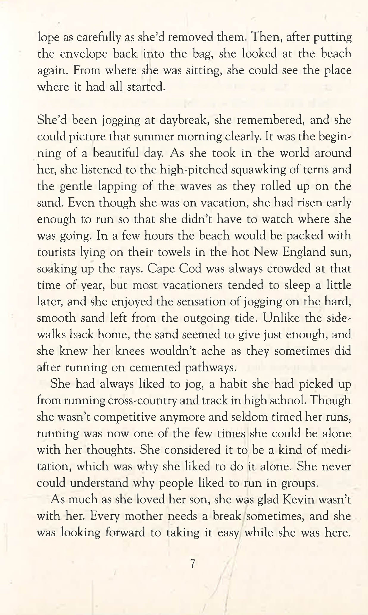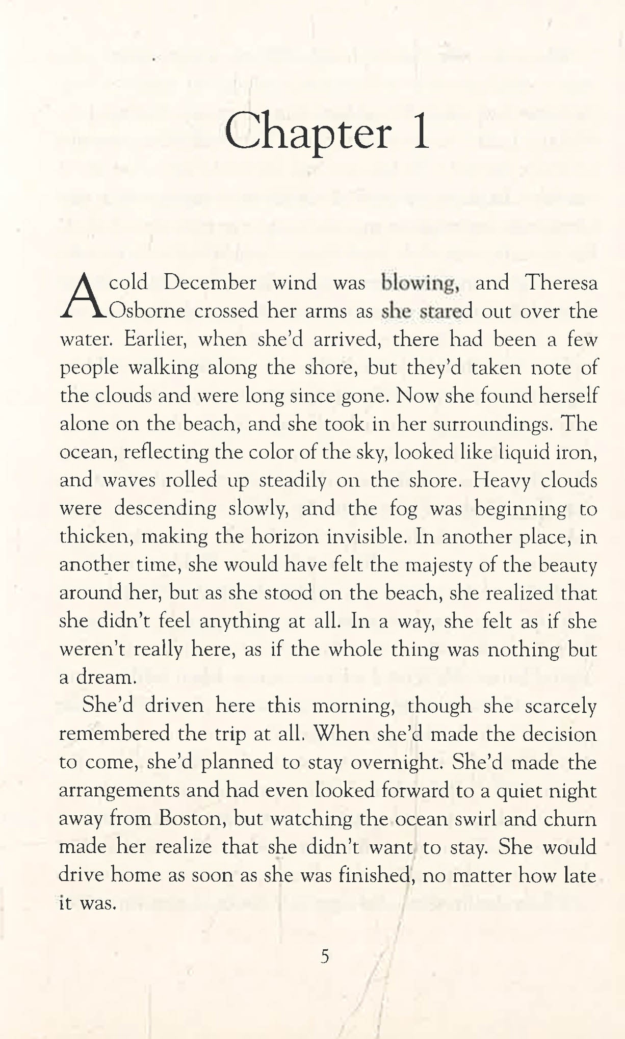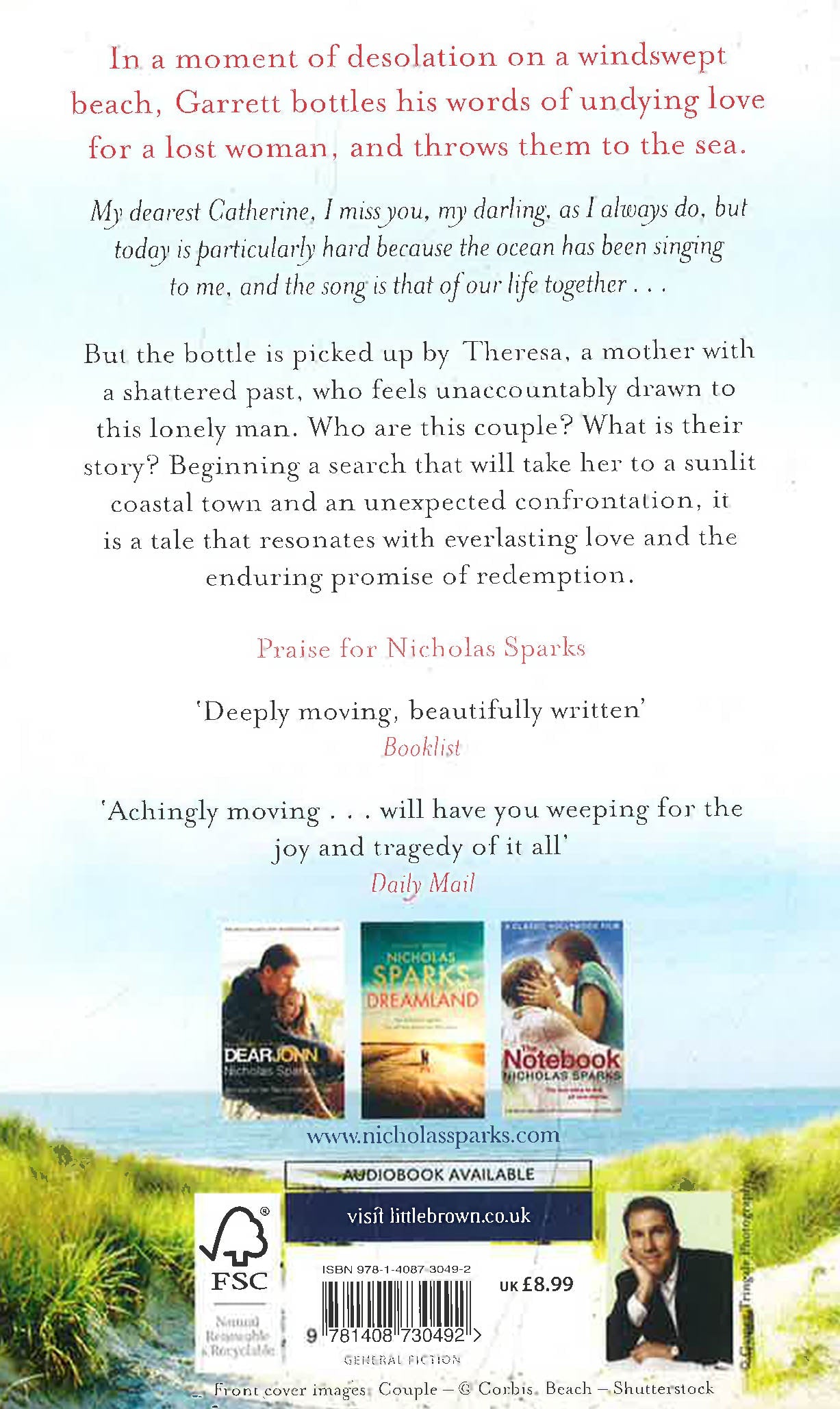 Divorced and disillusioned about relationships, Theresa Osborne is jogging when she finds a bottle on the beach. Inside is a letter of love and longing to "Catherine," signed simply "Garrett." Challenged by the mystery and pulled by emotions she doesn't fully understand, Theresa begins a search for this man that will change her life. What happens to her is unexpected, perhaps miraculous-an encounter that embraces all our hopes for finding someone special, for having a love that is timeless and everlasting.... Nicholas Sparks exquisitely chronicles the human heart. In his first bestselling novel, The Notebook, he created a testament to romantic love that touched readers around the world. Now in this New York Times bestseller, he renews our faith in destiny, in the ability of lovers to find each other no matter where, no matter when...