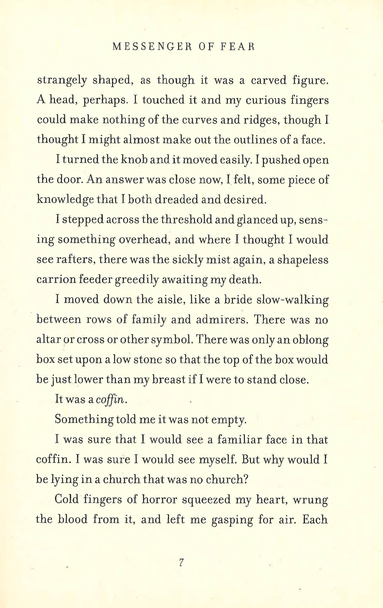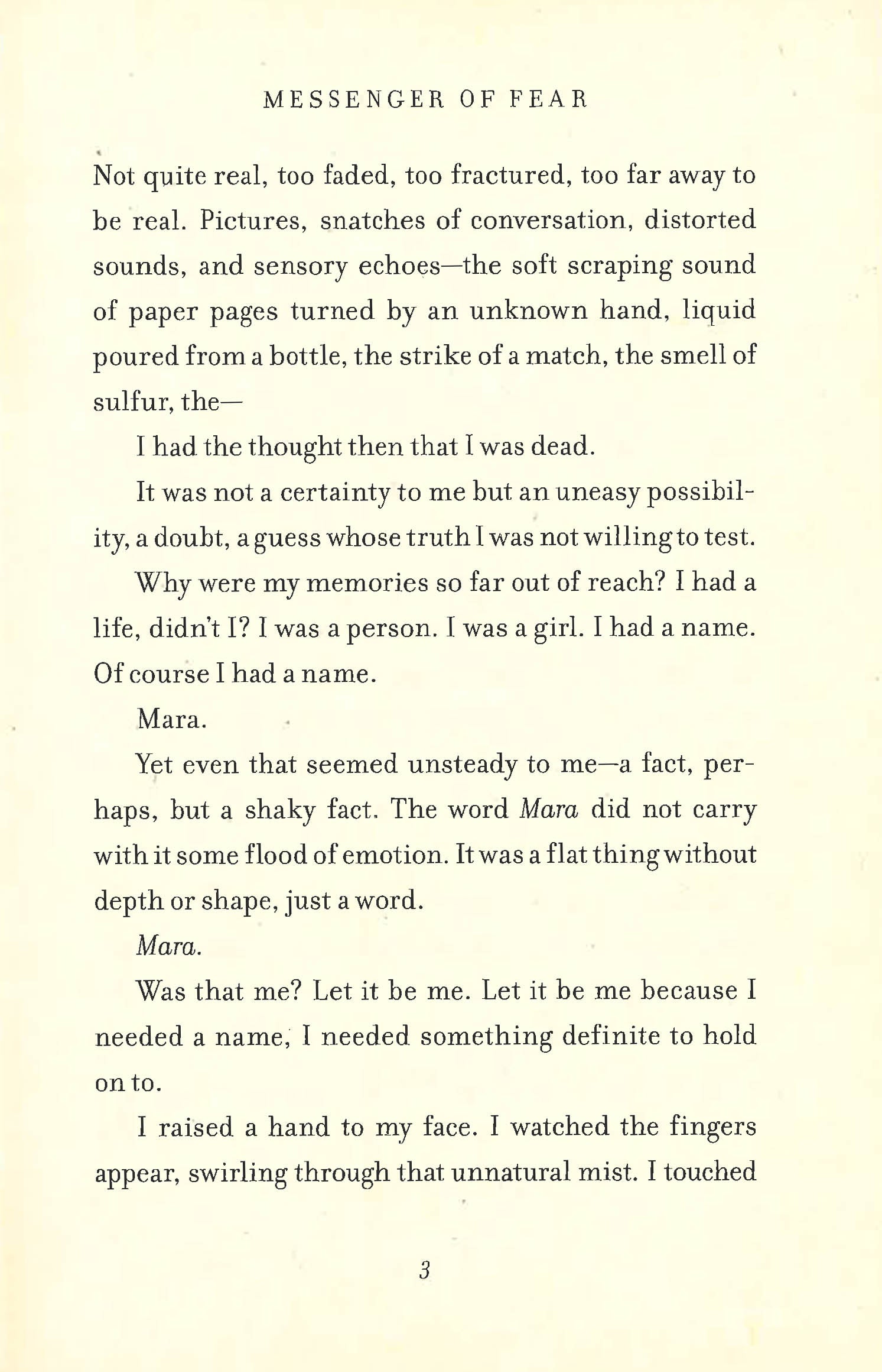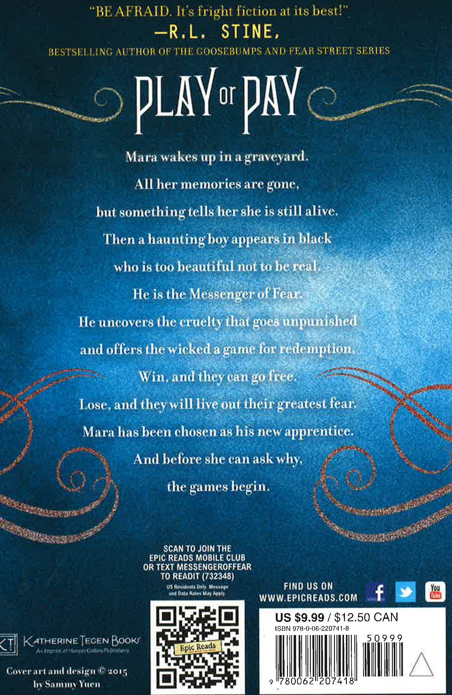 Mara Todd wakes in a field of dead grass, a heavy mist pressing down on her. She is terrified, afraid that she is dead. She can't remember who she is or anything about her past. Is it because of the boy who appears? He calls himself the Messenger of Fear. If the world does not bring justice to those who do evil, the Messenger will. He offers the wicked a game. If they win, they go free. If they lose, they will live their greatest fear. Either way, their sanity will be challenged.It is a world of fair but harsh justice. Of retribution and redemption. And mystery. Why was Mara chosen to be the Messenger's apprentice? What has she done to deserve this terrible fate? She won't find out until three of the wicked receive justice. And when she does, she will be shattered.