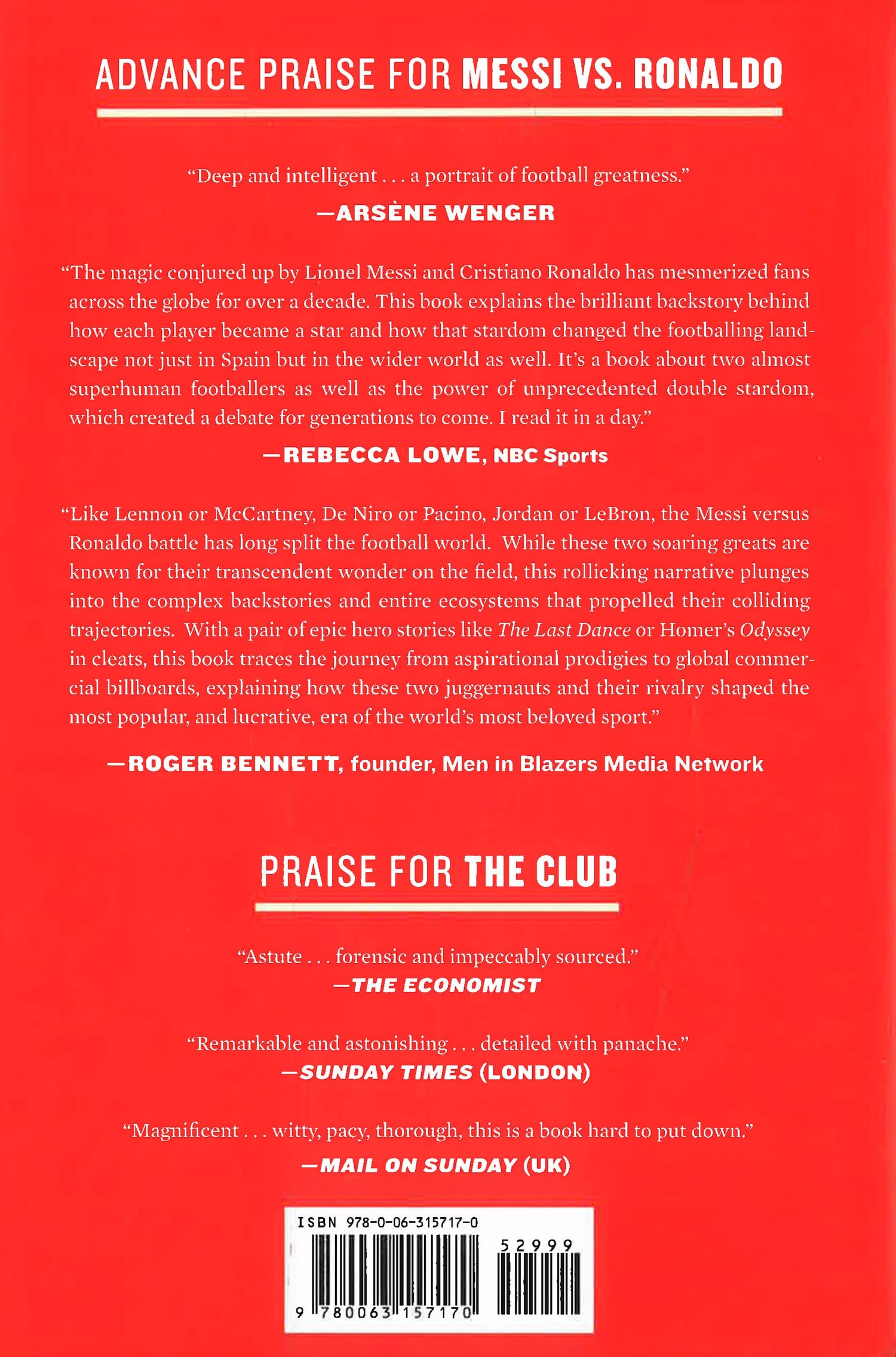 Now Wall Street Journal reporters and co-authors of The Club, Joshua Robinson and Jonathan Clegg, unite the stories of Messi and Ronaldo into a single modern epic of global sports, detailing how one rivalry changed both the game and the business of international soccer―forever. Based on dozens of firsthand accounts and years of original reporting, Messi vs. Ronaldo weaves together the stakes, color, and characters at the heart of each man’s story, going inside the locker rooms and boardrooms where their legends were forged and revealing off-field drama as gripping as anything that happened on it. From their contrasting origin stories to their divergent career arcs and their conflicting reputations, these players have built their successes on opposite paths, yet each, in his own way, offers a riveting tale of triumph and excess. Taken together, their story embodies the astronomical growth of international soccer, how social media has revolutionized the power of sports celebrity, and how the desire to capitalize on the billions of dollars these players represent electrified some of the most storied clubs in Europe―Barcelona, Real Madrid, and Manchester United among them―and cost them almost everything.