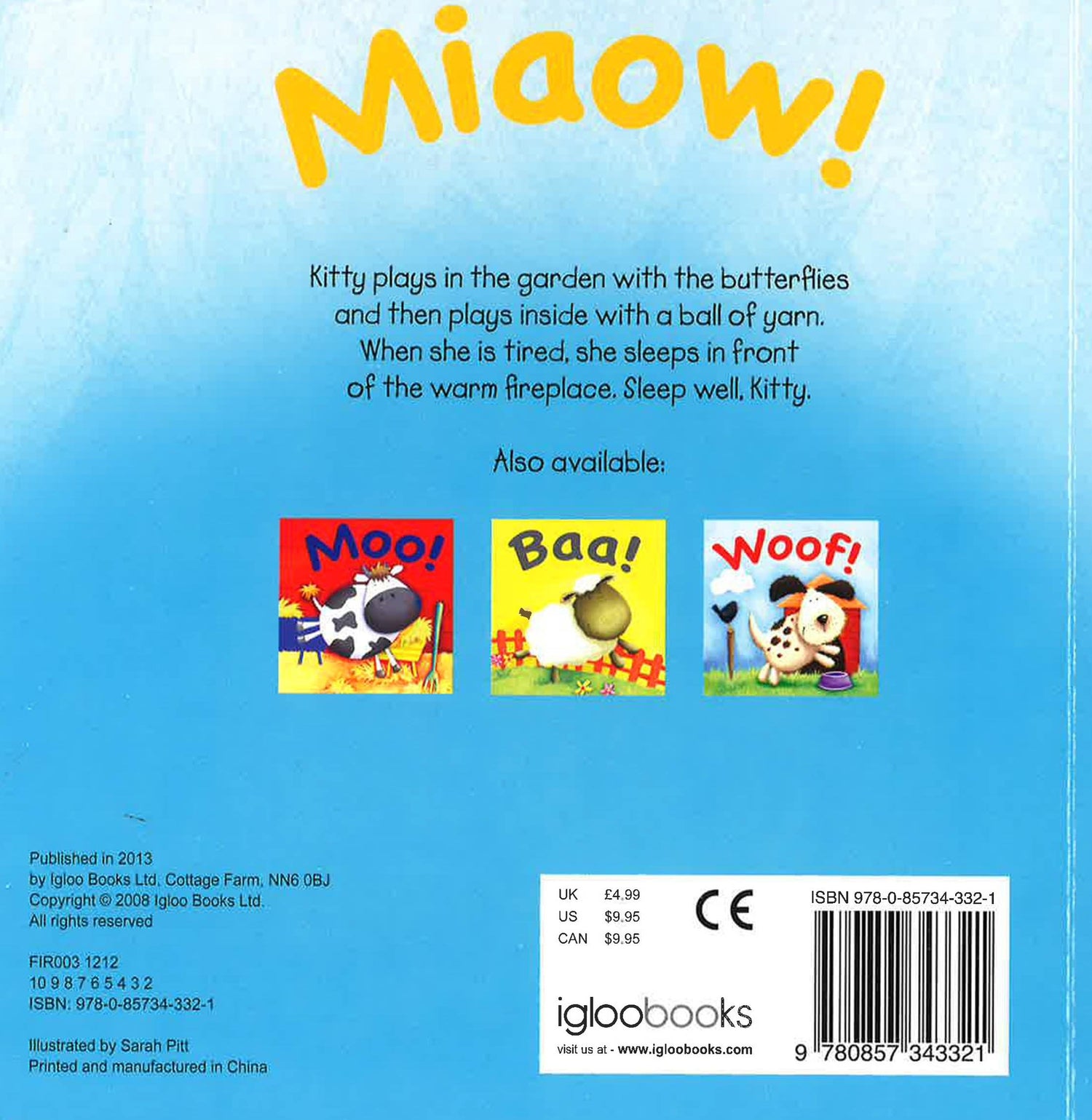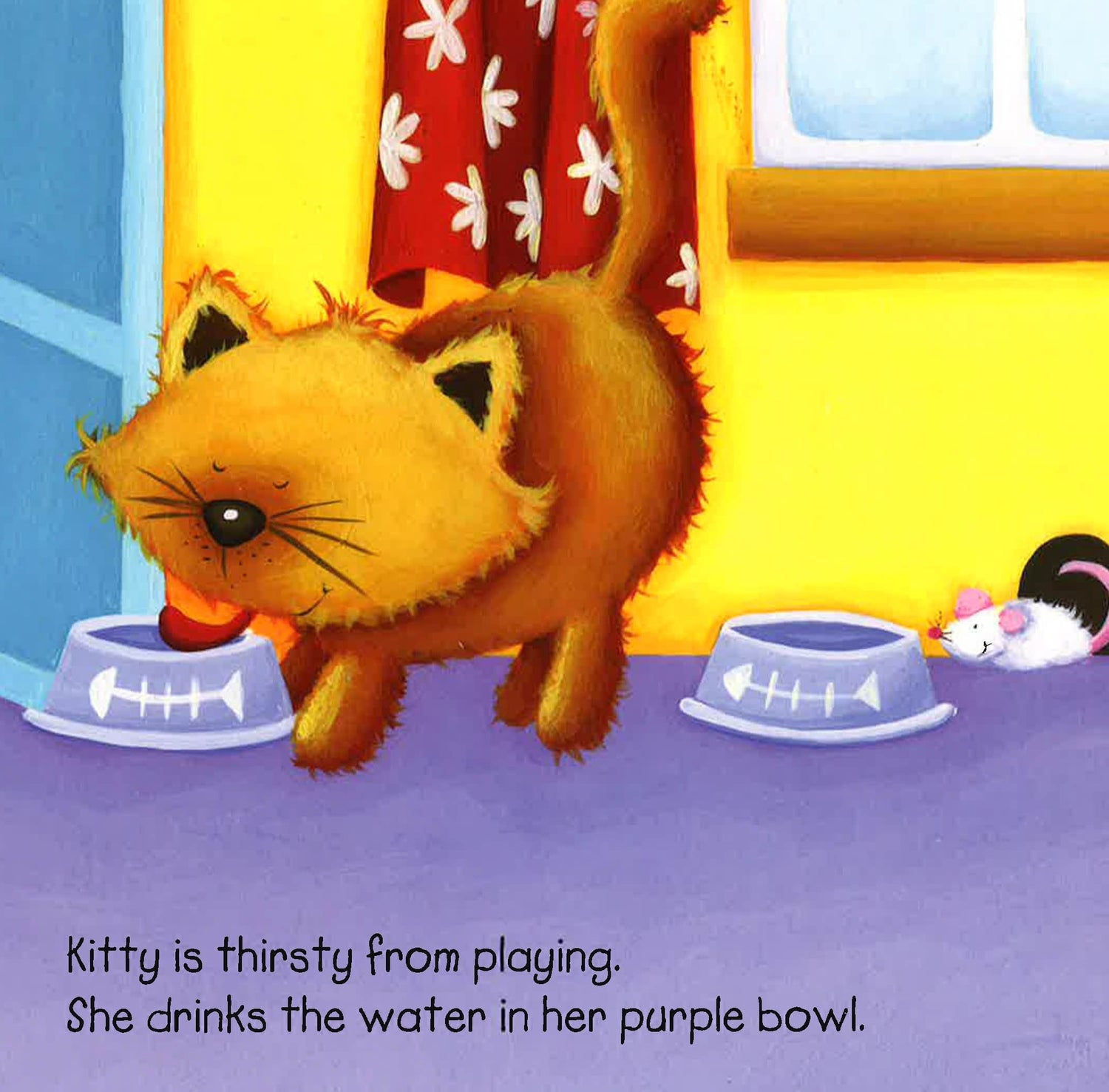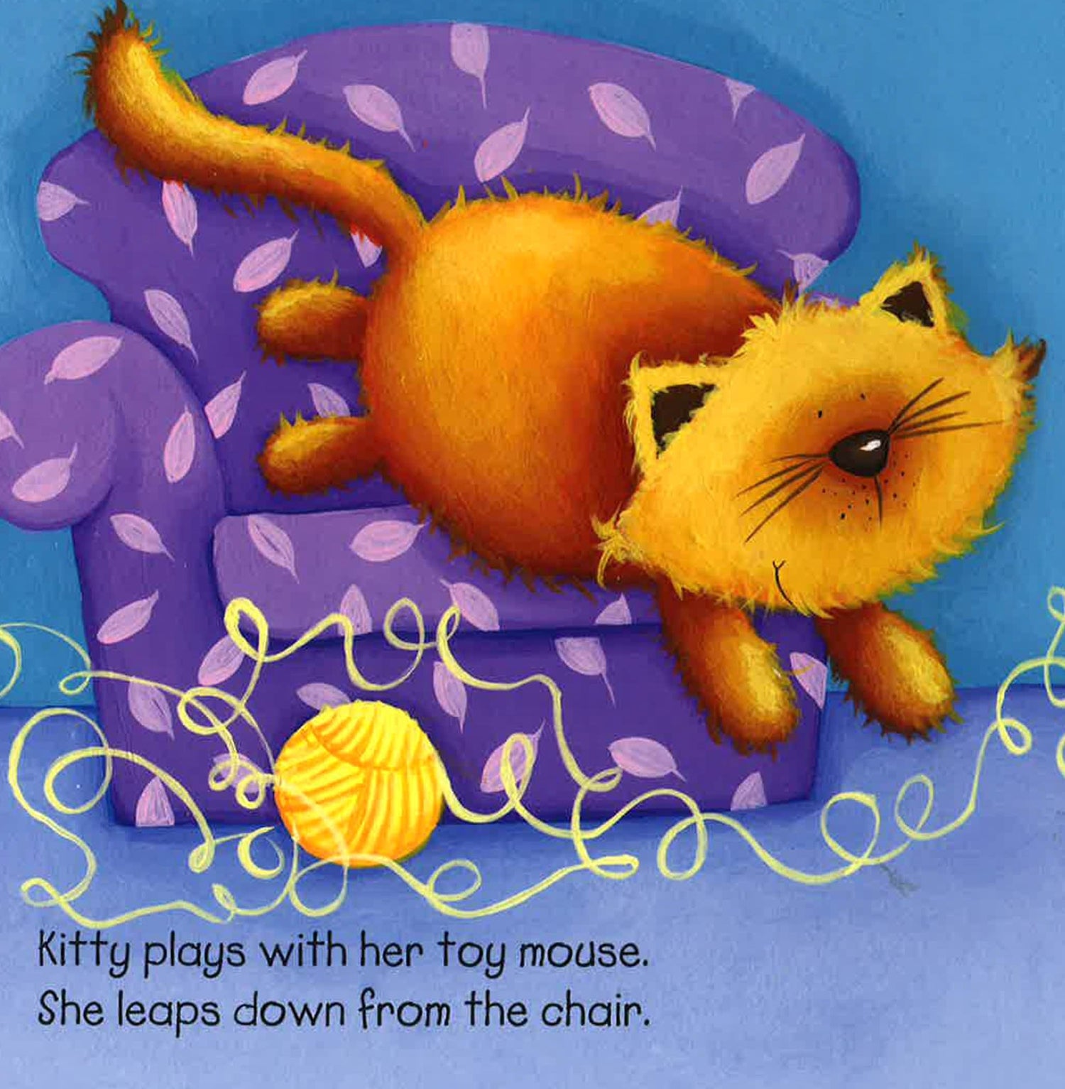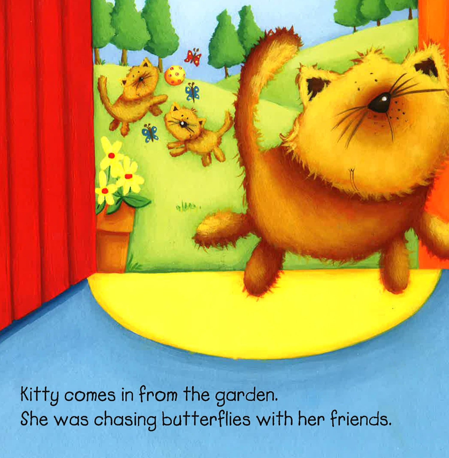 Kitty plays in the garden with the butterflies and then plays inside with a ball of yarn. When she is tired, she sleeps in front of the warm fireplace. Sleep well, Kitty.