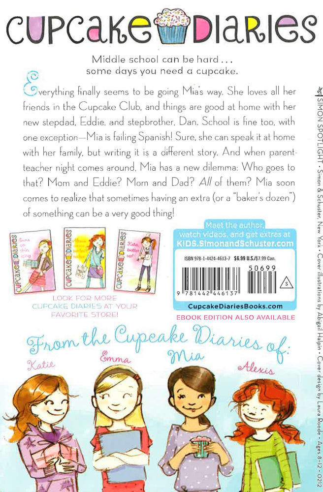 Mia finds that one more in the mix is always better in this treat of a tween series! Mia is getting used to her new family now that her mom is remarried to Eddie and she's gained a new stepbrother, Dan. She's in the groove of going to her dad's house on the weekends, and everything is going pretty well at home and at school. Well, except for Spanish class. Mia's parents and stepfather speak it and she does too--but speaking it and writing it are two different things, and somehow Mia ends up in the hands of the merciless Mrs. Alvarez and almost failing Spanish class. Still, things are so good at home that Mia doesn't want to worry anyone or rock the boat. But when her parents find out--all three of them--she realizes that instead of having two parents, she's lucky enough to have three, and all three of them pitch in to help her. A baker's dozen is a bonus!