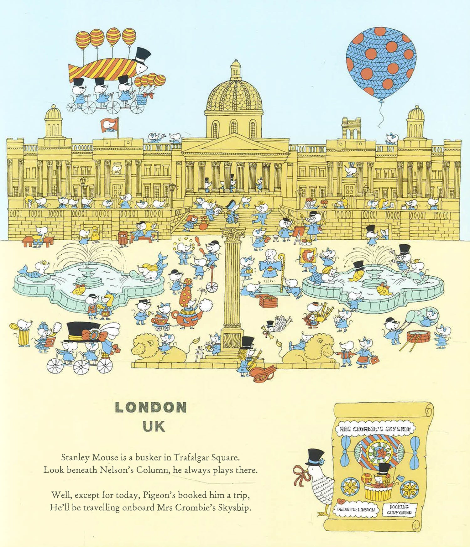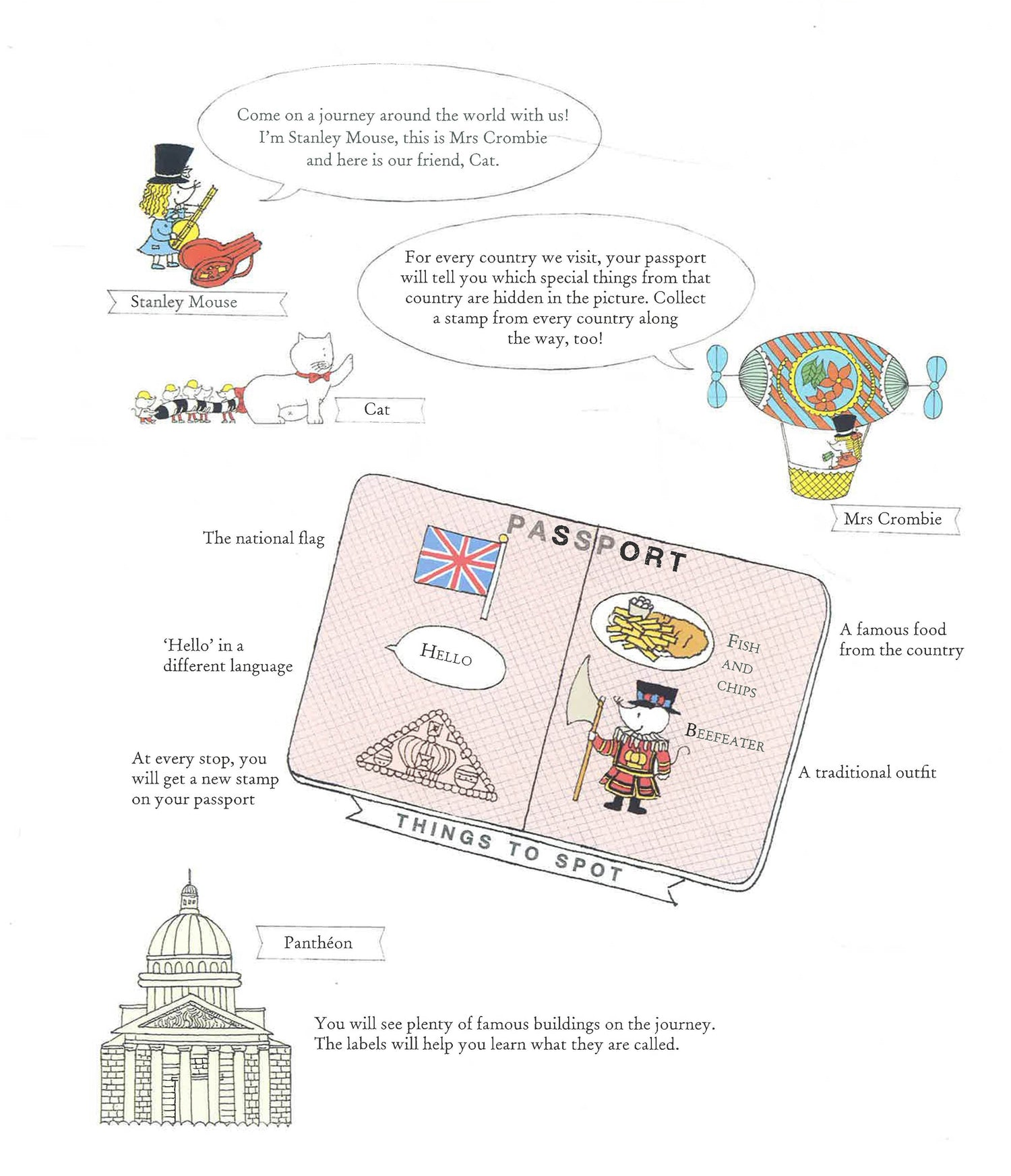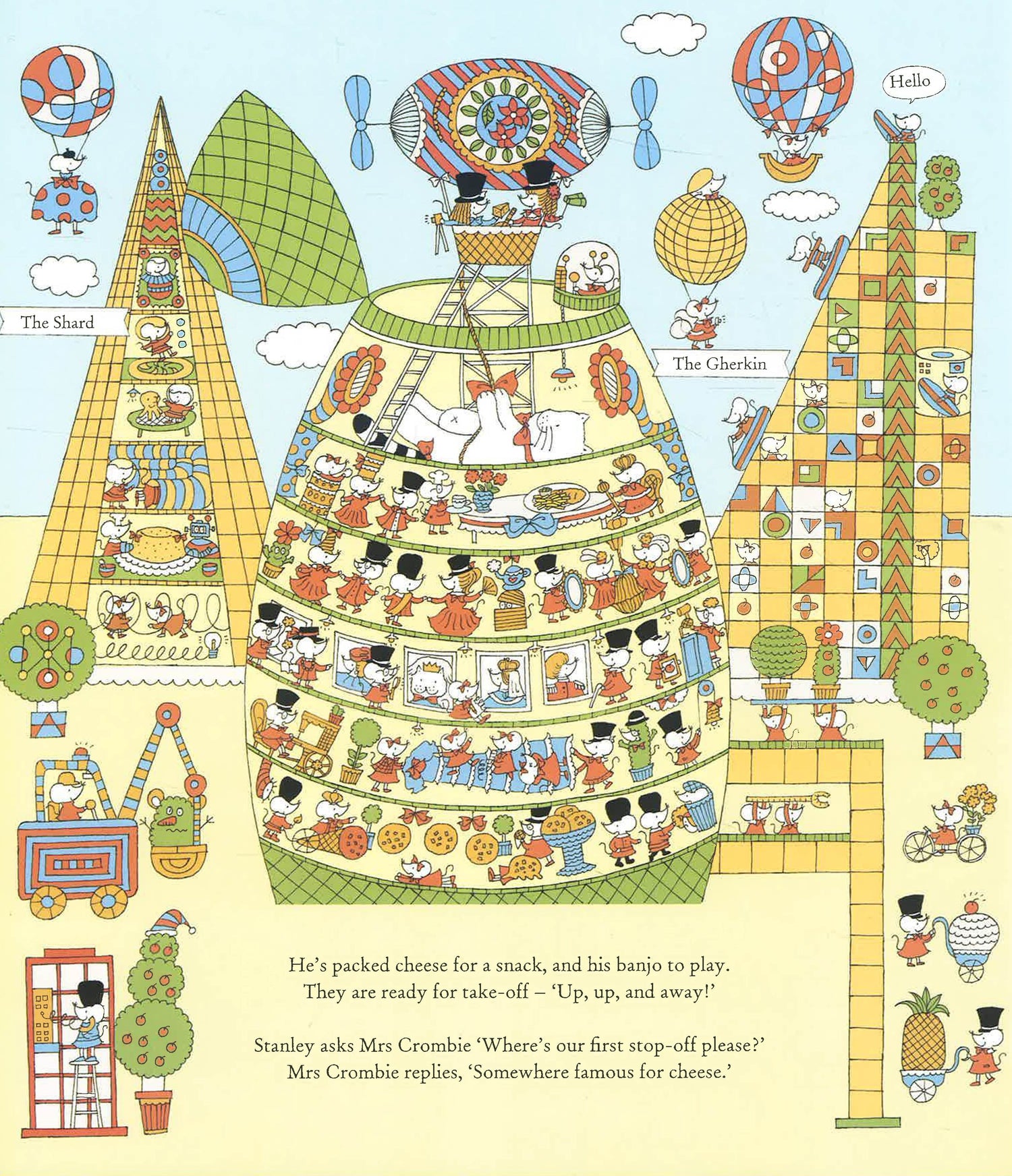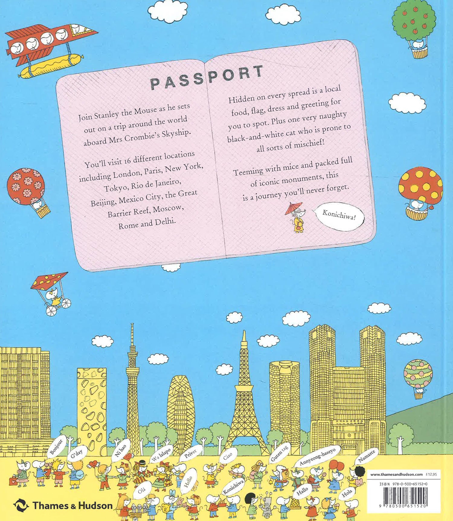 Join Stanley the Mouse as he sets out on a trip around the world aboard Mrs Crombie's airship! Readers will visit sixteen different locations, including London, Paris, New York, Tokyo, Rio de Janeiro, Beijing, Mexico City, the Great Barrier Reef, Moscow, Rome, Delhi, Namibia's Etosha National Park, Seoul, the Black Forest, Amsterdam and Barcelona. Hidden on every spread is a local food, flag, dress and greeting for children to spot - plus one very naughty black-and-white cat who is prone to all sorts of mischief... Teeming with mice and packed full of iconic monuments, this is a journey children will never forget.