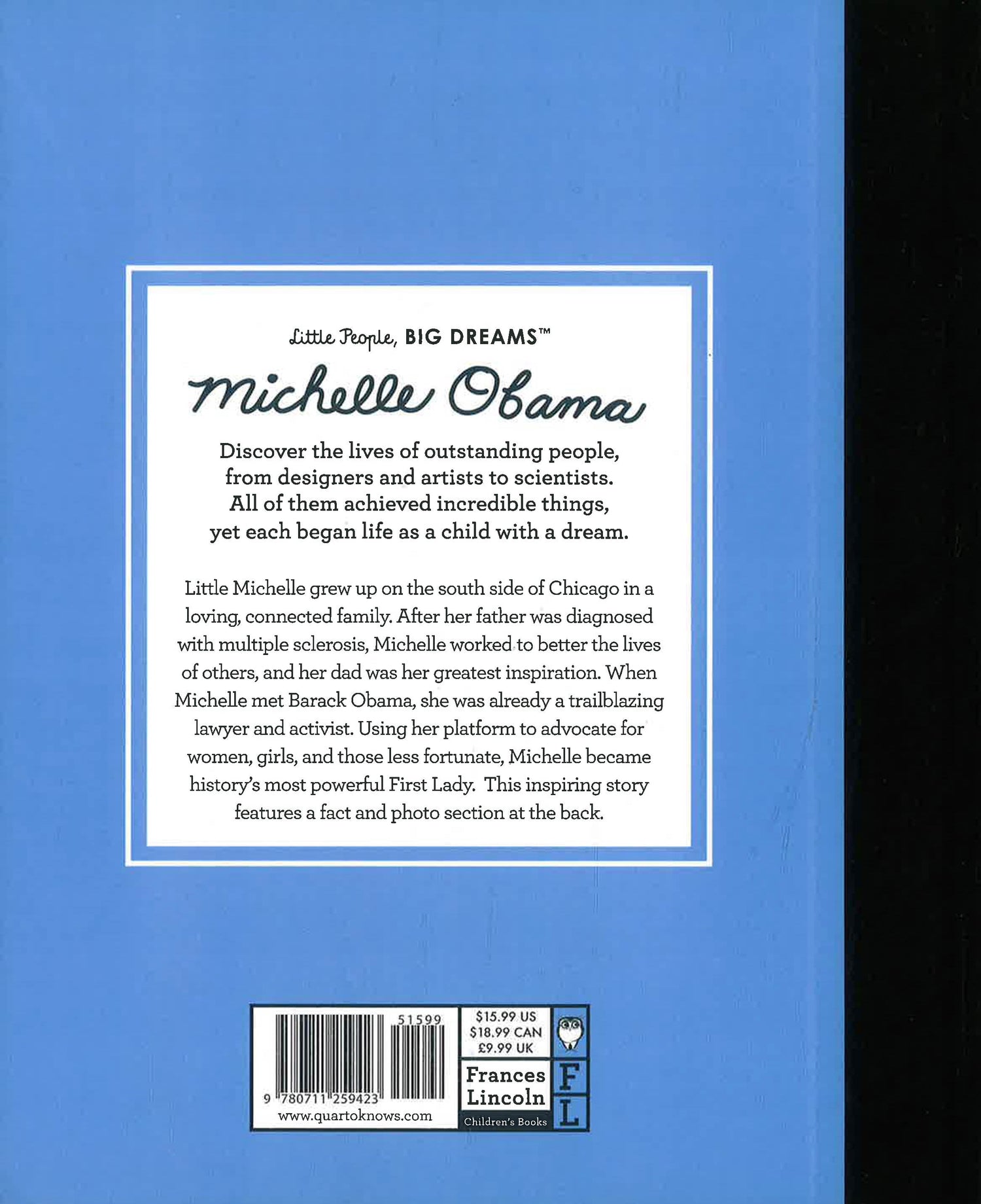 In this book from the critically acclaimed, multimillion-copy best-selling Little People, BIG DREAMS series, discover the life of Michelle Obama, the iconic first lady, advocate, lawyer, and author.
