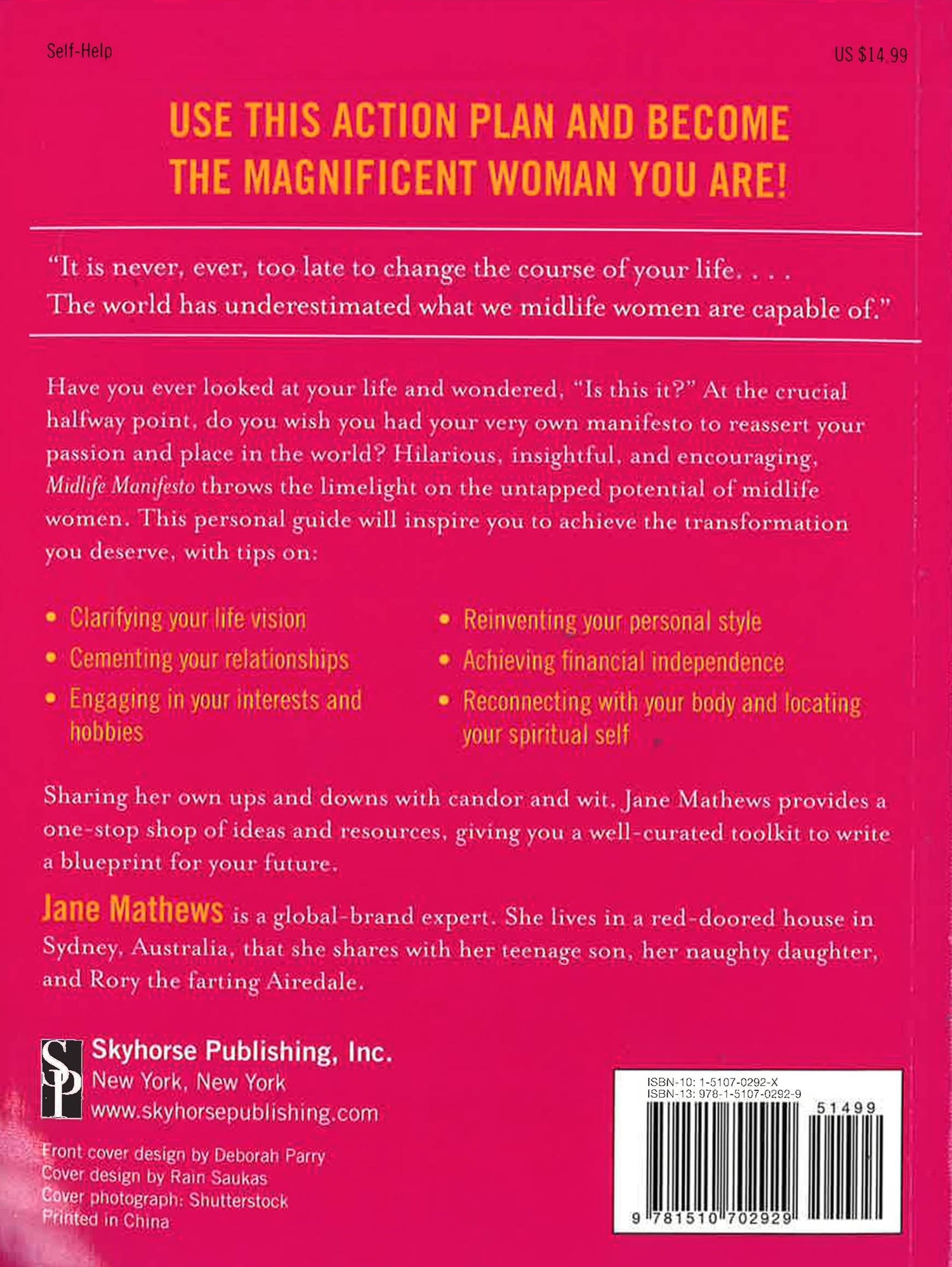 Have you ever looked at your life and wondered "is this it?" At the crucial halfway point, do you wish you had your very own manifesto to reassert your passion and place in the world? Hilarious, insightful, and encouraging, Midlife Manifesto throws the limelight on the untapped potential of midlife women instead of obsessing over the struggles and crises that come with the 40s and 50s. Whether it regards financial independence, personal style, relationships, health, spirituality, or making your home a sanctuary, this personal guide will inspire you to achieve the transformation you deserve and create the plan to make it happen.