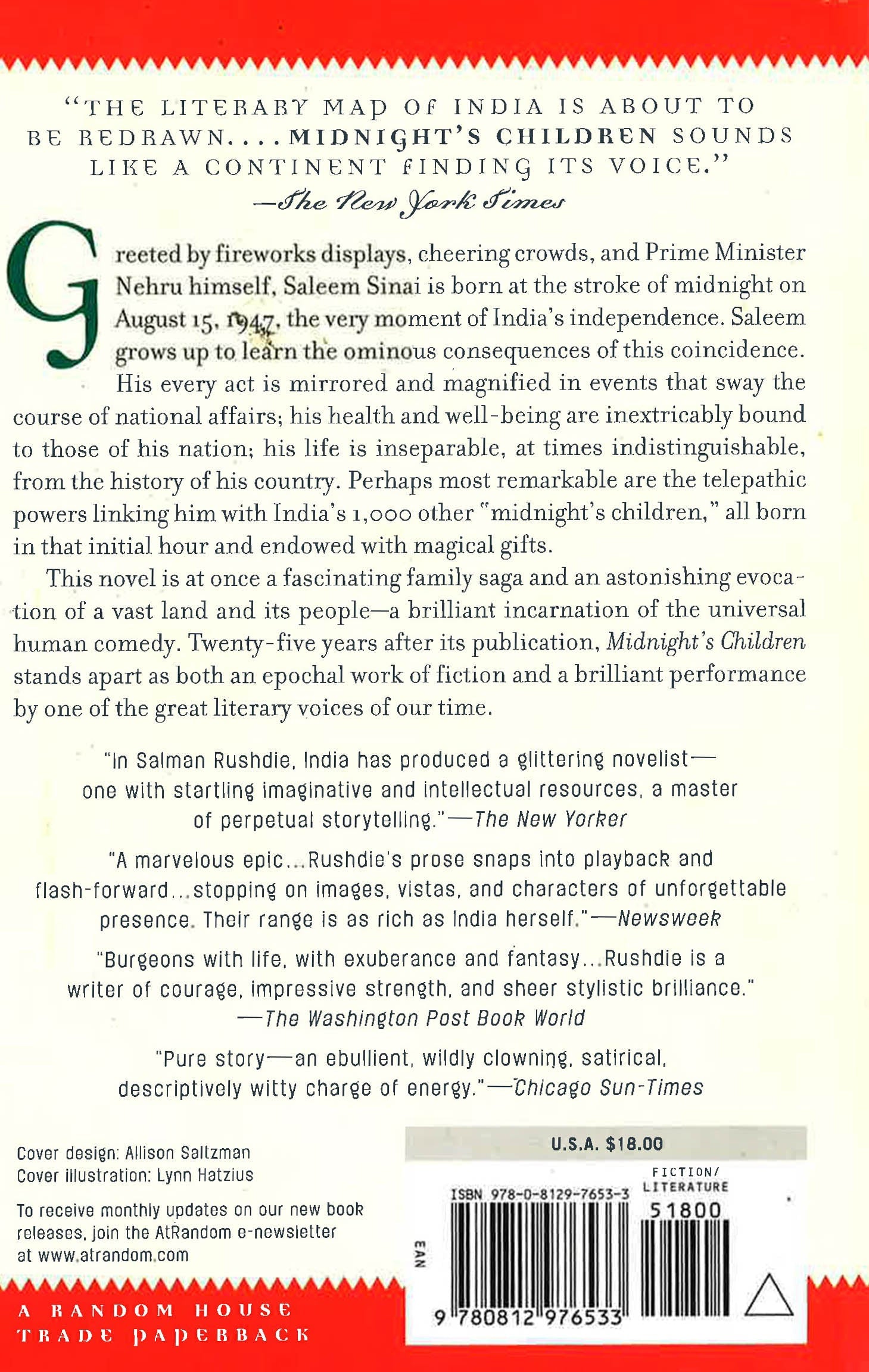 Selected by the Modern Library as one of the 100 best novels of all time Winner of the Booker of Bookers Saleem Sinai is born at the stroke of midnight on August 15, 1947, the very moment of India's independence. Greeted by fireworks displays, cheering crowds, and Prime Minister Nehru himself, Saleem grows up to learn the ominous consequences of this coincidence. His every act is mirrored and magnified in events that sway the course of national affairs; his health and well-being are inextricably bound to those of his nation; his life is inseparable, at times indistinguishable, from the history of his country. Perhaps most remarkable are the telepathic powers linking him with India's 1,000 other "midnight's children," all born in that initial hour and endowed with magical gifts. This novel is at once a fascinating family saga and an astonishing evocation of a vast land and its people-a brilliant incarnation of the universal human comedy. Twenty-five years after its publication, Midnight' s Children stands apart as both an epochal work of fiction and a brilliant performance by one of the great literary voices of our time.