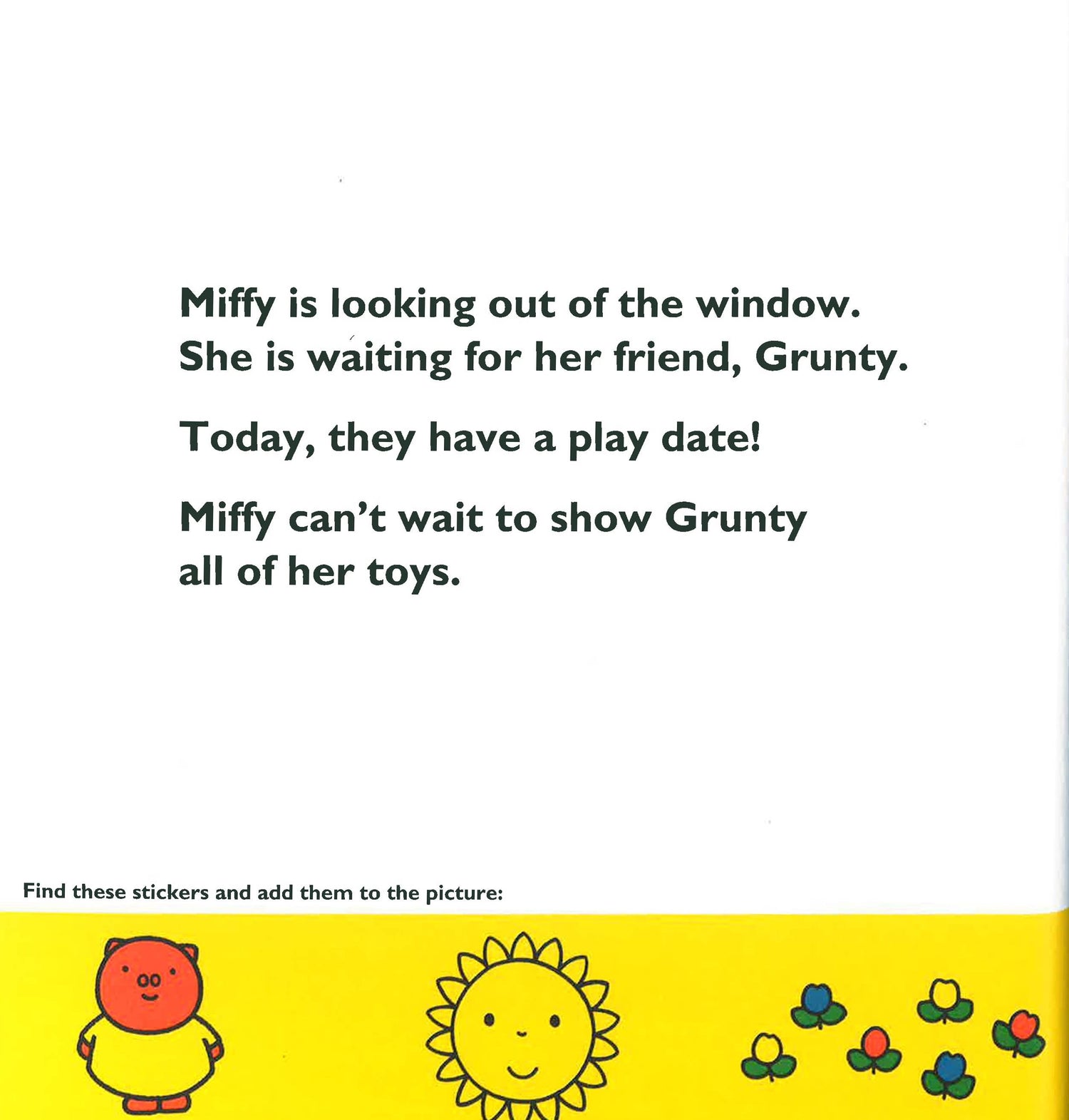Meet Miffy - a lovable little bunny who likes to discover the wonder in everyday things. Miffy has invited her friend Grunty over for a play date. Join Miffy and Grunty as they take turns, share and cooperate their way through their play date. With over 30 stickers to decorate the illustrations in this charming sticker storybook! Share this book with your child to: *Relate to a child's first experiences *Practise dexterity and fine motor skills