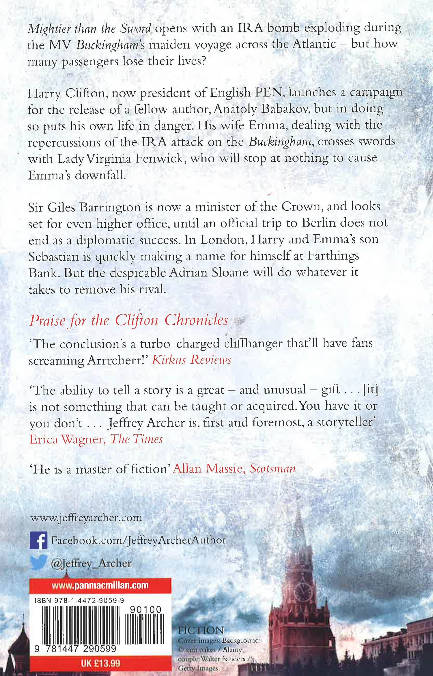 Mightier than the Sword opens with an IRA bomb exploding during the MV Buckingham's maiden voyage across the Atlantic - but how many passengers lose their lives? When Harry Clifton visits his publisher in New York, he learns that he has been elected as the new president of English PEN, and immediately launches a campaign for the release of a fellow author, Anatoly Babakov, who's imprisoned in Siberia. Babakov's crime? Writing a book called Uncle Joe, a devastating insight into what it was like to work for Stalin. So determined is Harry to see Babakov released and the book published, that he puts his own life in danger.His wife Emma, chairman of Barrington Shipping, is facing the repercussions of the IRA attack on the Buckingham. Some board members feel she should resign, and Lady Virginia Fenwick will stop at nothing to cause Emma's downfall.Sir Giles Barrington is now a minister of the Crown, and looks set for even higher office, until an official trip to Berlin does not end as a diplomatic success. Once again, Giles's political career is thrown off balance by none other than his old adversary, Major Alex Fisher, who once again stands against him at the election. But who wins this time?In London, Harry and Emma's son, Sebastian, is quickly making a name for himself at Farthing's Bank in London, and has proposed to the beautiful young American, Samantha. But the despicable Adrian Sloane, a man interested only in his own advancement and the ruin of Sebastian, will stop at nothing to remove his rival.Jeffrey Archer's compelling Clifton Chronicles continue in this, his most accomplished novel to date. With all the trademark twists and turns that have made him one of the world's most popular authors, the spellbinding story of the Clifton and the Barrington families continues.