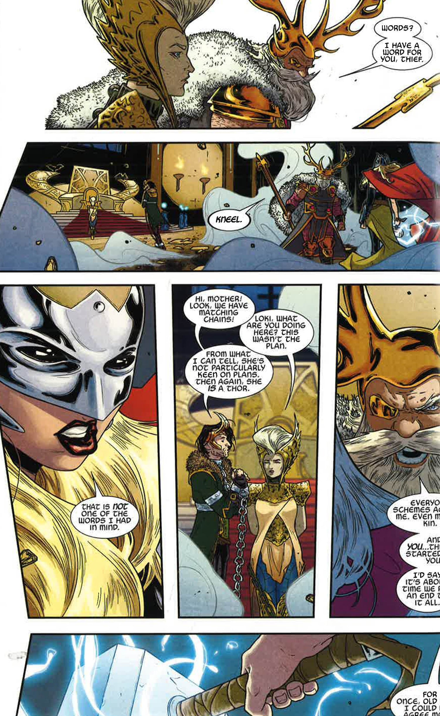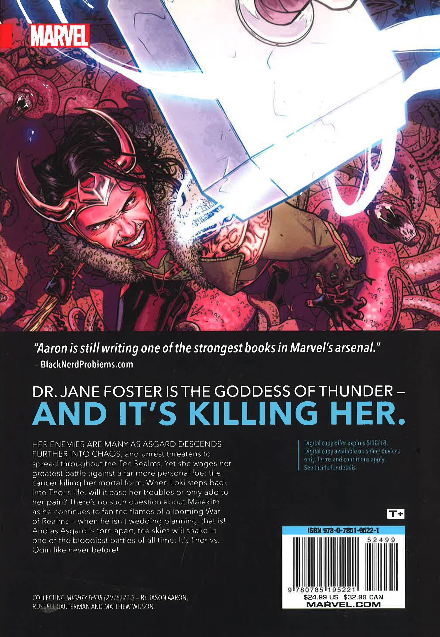 When Dr. Jane Foster lifts the mystic hammer Mjolnir, she is transformed into the Goddess of Thunder, the Mighty Thor! Her enemies are many, as Asgard descends further into chaos and unrest threatens to spread throughout the Ten Realms. Yet her greatest battle is against a far more personal foe: the cancer that is killing her mortal form. When Loki steps back into Thor's life, will it ease her troubles or only add to her pain? It's time to find out whether the next chapter in the twisting tale of the Trickster will be one of good or evil! There's no such question about Malekith, though, as he and his Dark Council continue to fan the flames of a looming War of Realms! Jason Aaron continues his startling saga of the mighty Thor!