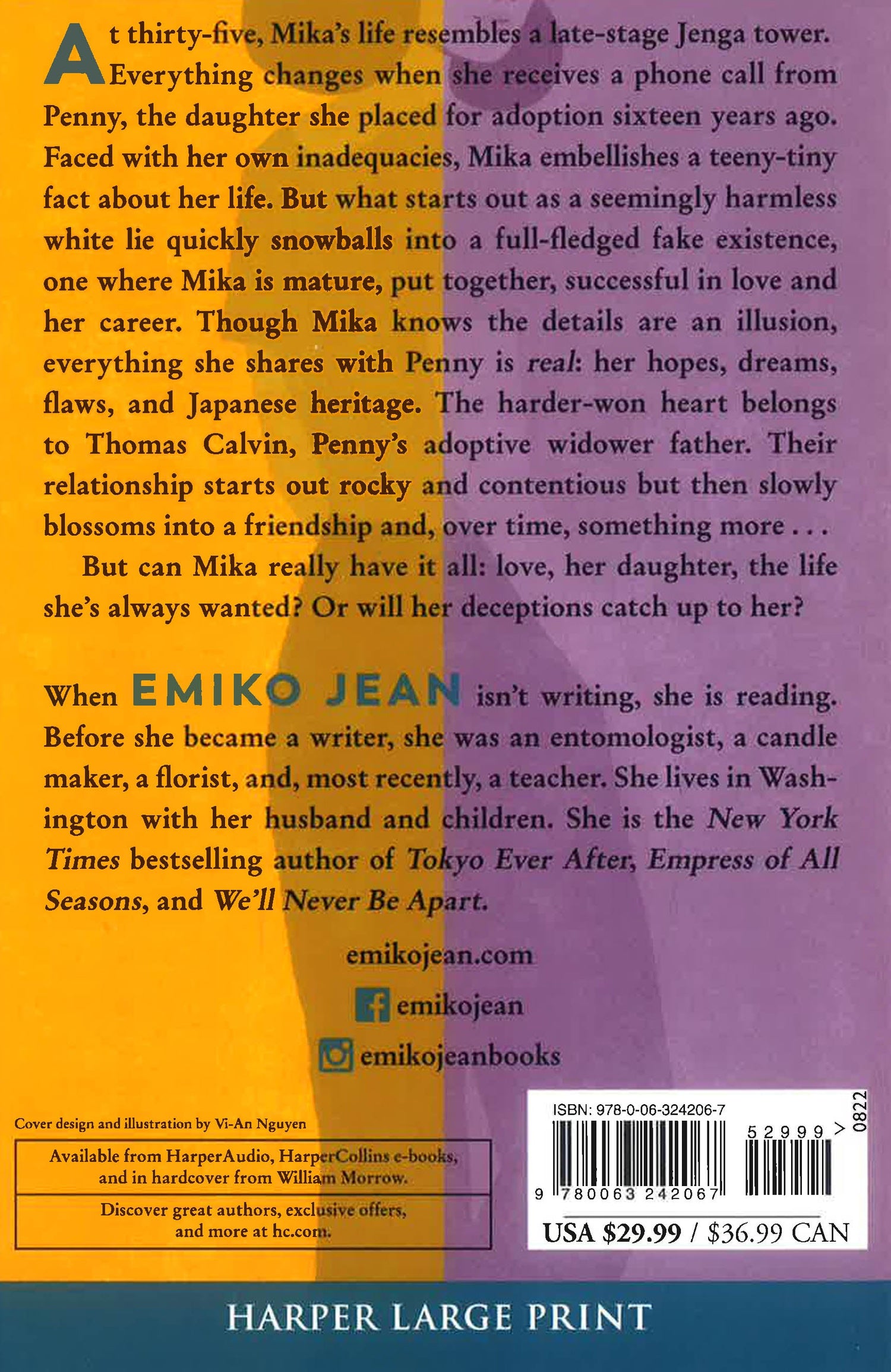 The details of Mika’s life might be an illusion, but everything she shares with curious, headstrong Penny is real: her hopes, dreams, flaws, and Japanese heritage. The harder-won heart belongs to Thomas Calvin, Penny’s adoptive widower father. What starts as a rocky, contentious relationship slowly blossoms into a friendship and, over time, something more. But can Mika really have it all—love, her daughter, the life she’s always wanted? Or will Mika’s deceptions ultimately catch up to her? In the end, Mika must face the truth—about herself, her family, and her past—and answer the question, just who is Mika in real life?