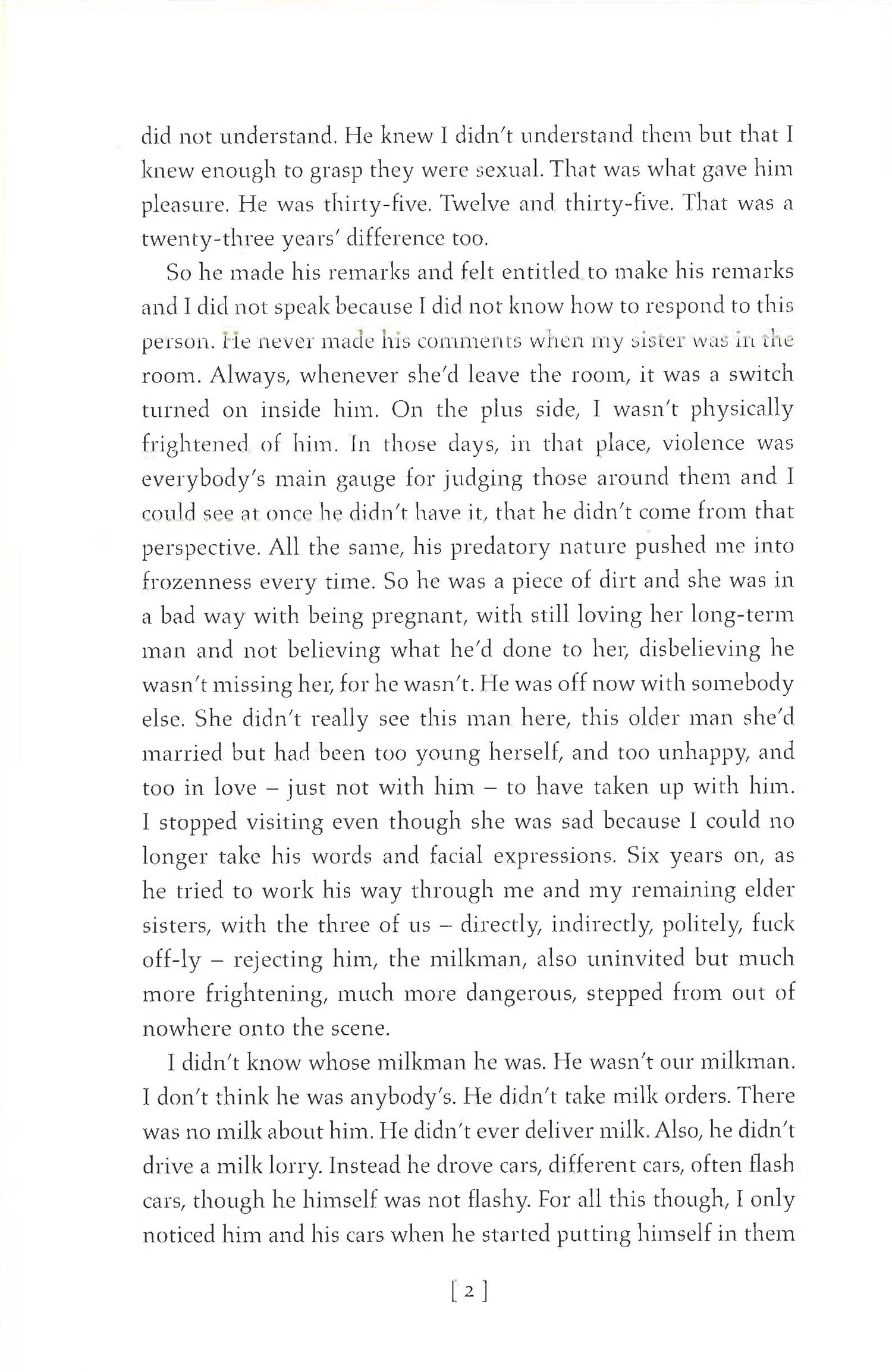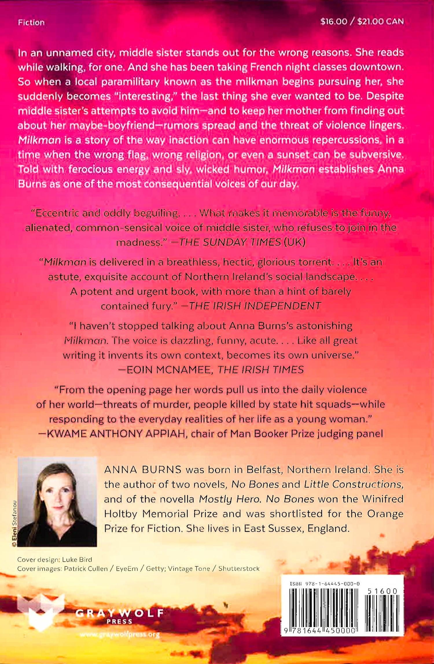 Winner of the Man Booker Prize "Everything about this novel rings true. . . . Original, funny, disarmingly oblique and unique."--The Guardian In an unnamed city, middle sister stands out for the wrong reasons. She reads while walking, for one. And she has been taking French night classes downtown. So when a local paramilitary known as the milkman begins pursuing her, she suddenly becomes "interesting," the last thing she ever wanted to be. Despite middle sister's attempts to avoid him--and to keep her mother from finding out about her maybe-boyfriend--rumors spread and the threat of violence lingers. Milkman is a story of the way inaction can have enormous repercussions, in a time when the wrong flag, wrong religion, or even a sunset can be subversive. Told with ferocious energy and sly, wicked humor, Milkman establishes Anna Burns as one of the most consequential voices of our day.
