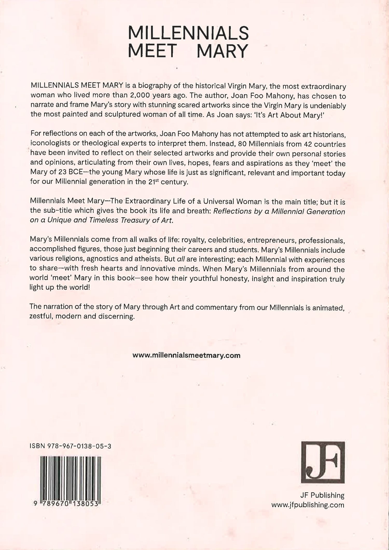 For reflections on each of the artworks, Joan Foo Mahony has not attempted to ask art historians, iconologists or theological experts to interpret them. Instead, 80 Millennials from 42 countries have been invited to reflect on their selected artworks and provide their own personal stories and opinions, articulating from their own lives, hopes, fears and aspirations as they 'meet' the Mary of 23 BCE-the young Mary whose life is just as significant, relevant and important today for our Millennial generation in the 21st century.