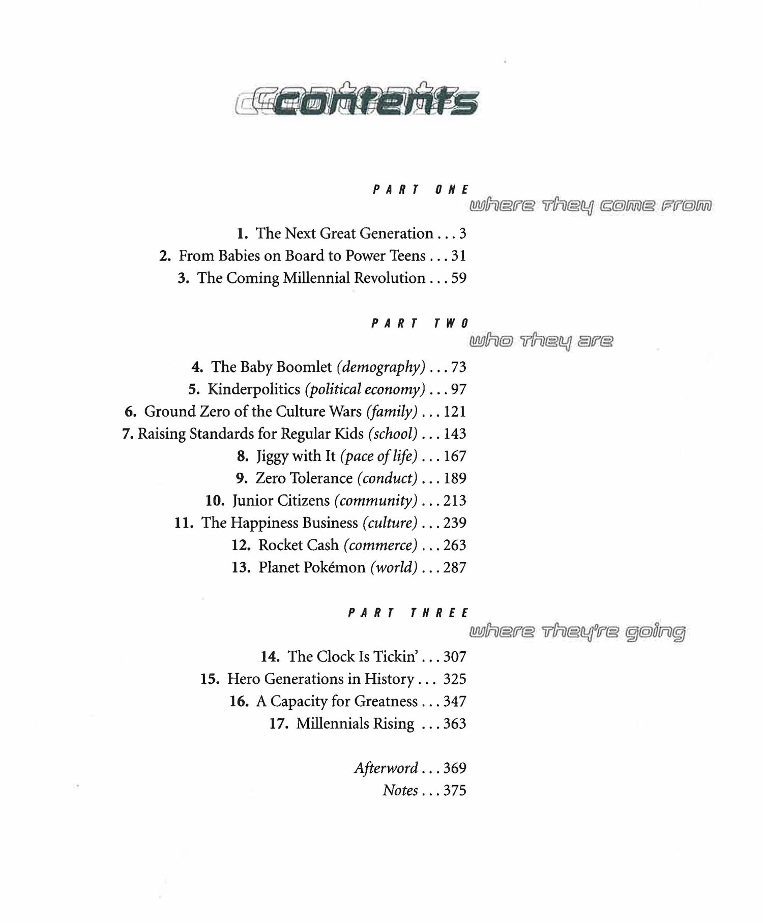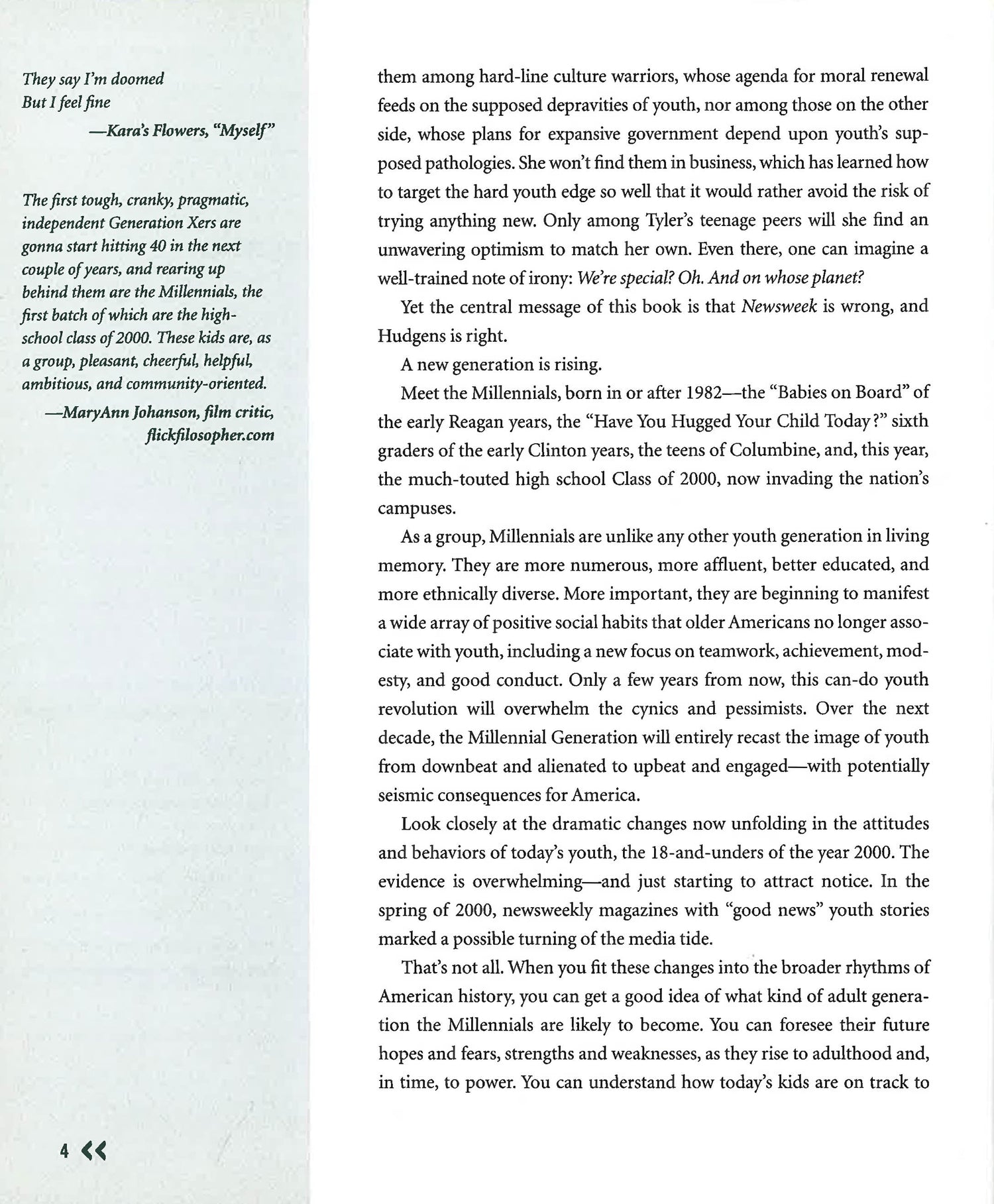 By the authors of the bestselling 13th Gen, the first in-depth examination of the Millennials--the generation born after 1982. "Over the next decade, the Millennial Generation will entirely recast the image of youth from downbeat and alientated to upbeat and engaged--with potentially seismic consequences for America." --from Millennials Rising In this remarkable account, certain to stir the interest of educators, counselors, parents, and people in all types of business as well as young people themselves, Neil Howe and William Strauss introduce the nation to a powerful new generation: the Millennials. They will also explain: Why today's teens are smart, well-behaved, and optimisitc, and why you won't hear older people say that. Why they get along so well with their Boomer and Xer parents. Why Millennial collegians will bring a new youth revolution to America's campuses. Why names like "Generation Y" and "Echo Boom" just don't work for today's kids. Having looked at oceans of data, taken their own polls, and talked to hundreds of kids, parents, and teachers, Howe and Strauss explain how Millennials are turning out to be so dramatically different from Xers and boomers and how, in time, they will become the next great generation. *This book may have remainder mark*