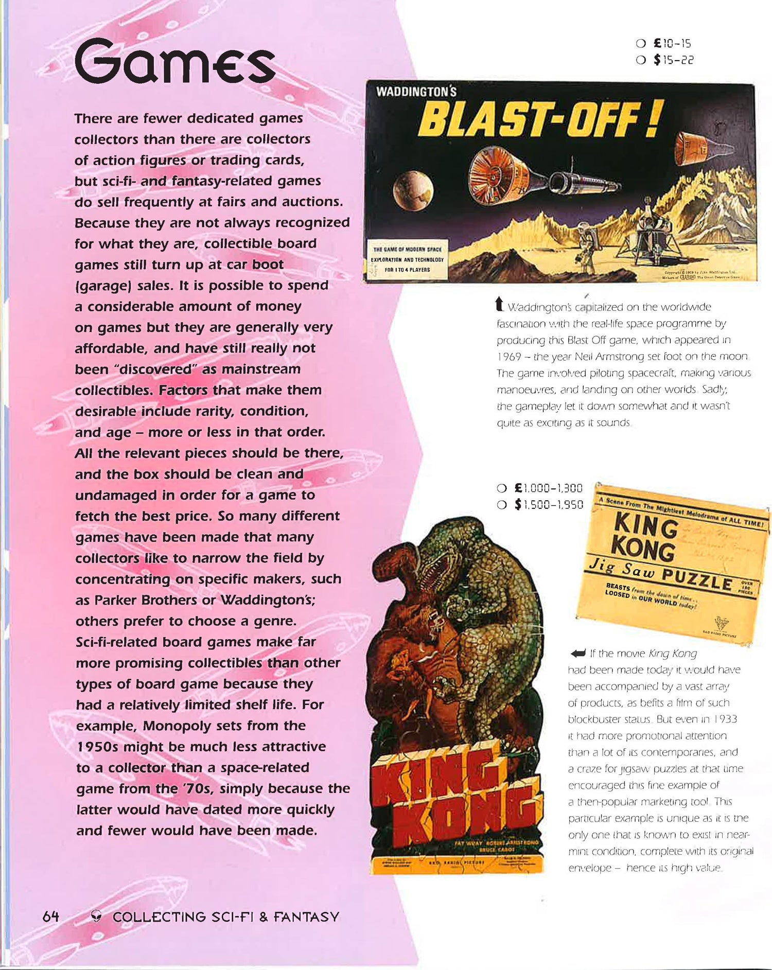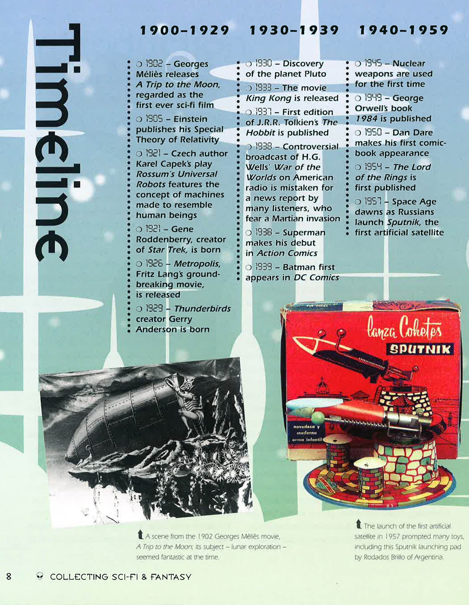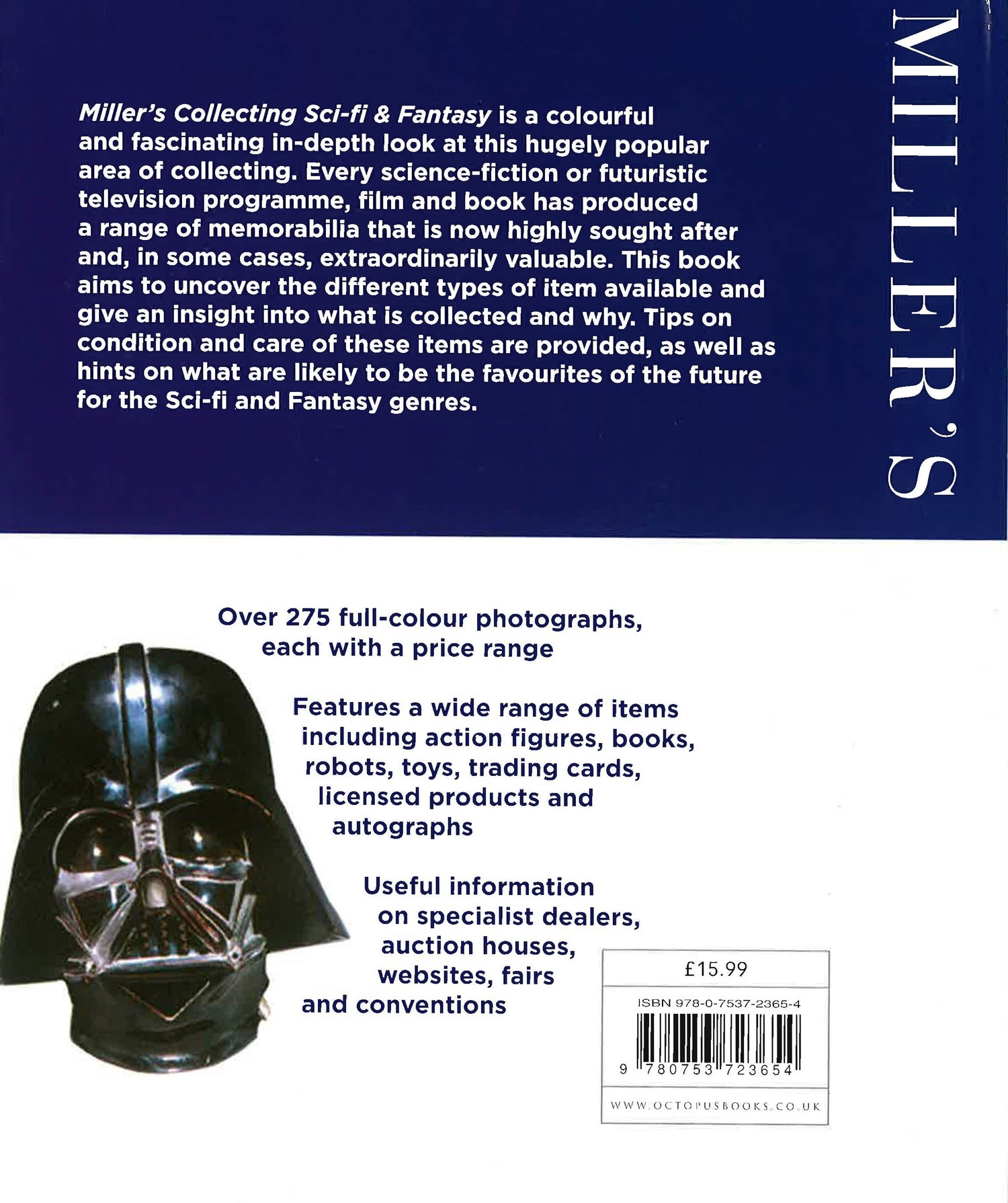 Following an introduction to the subject of collecting sci-fi and fantasy, the book is divided into the main types of collectable, such as comics and annuals, movie posters and ephemera. Within these chapters are further sub-sections highlighting specific areas of collecting, with an introduction to each and colour photographs with informative captions and price guides. A timeline highlights key events in the development of sci-fi and fantasy as a genre and real-life events that have furthered interest in the subject. All the familiar favourites are included, from the Forbidden Planet of the 1950s, and the 1970s cult classics of Star Wars and Star Trek, up to Spider-Man, Harry Potter and Lord of the Rings and information is provided on a range of items including action figures, books and toys. Also included is a list of useful addresses for auction houses and dealers and a further reading section.