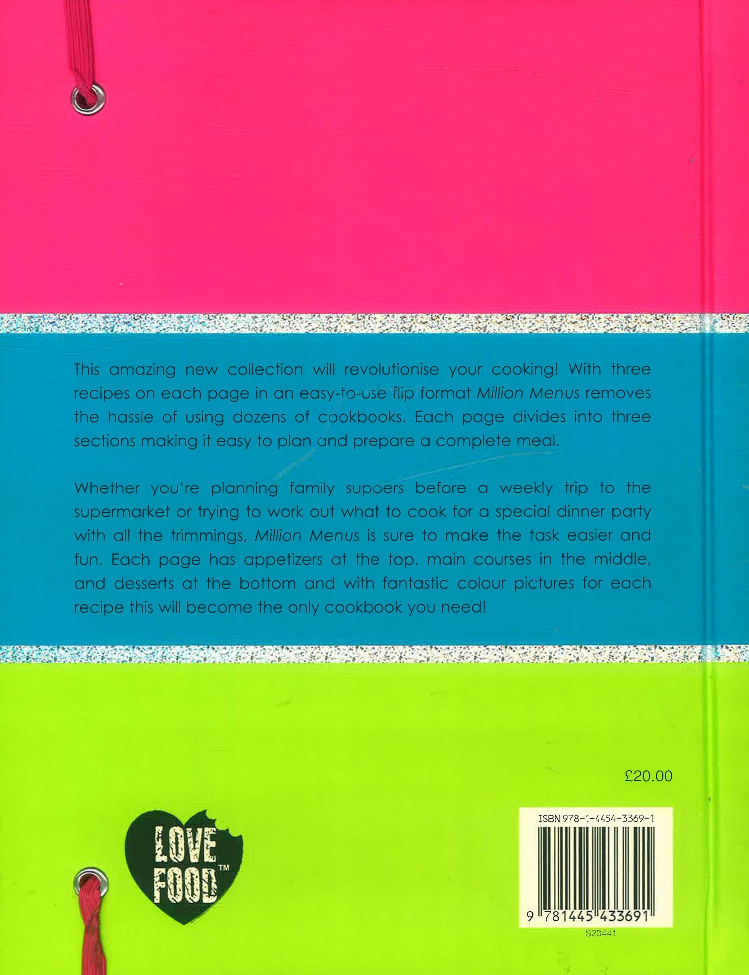 This amazing new collection will revolutionise your cooking! With three recipes on each page in an easy-to-use flip format Million Menus removes the hassle of using dozen of cookbooks. Each page divides into three sections making it easy to plan and prepare a complete meal.