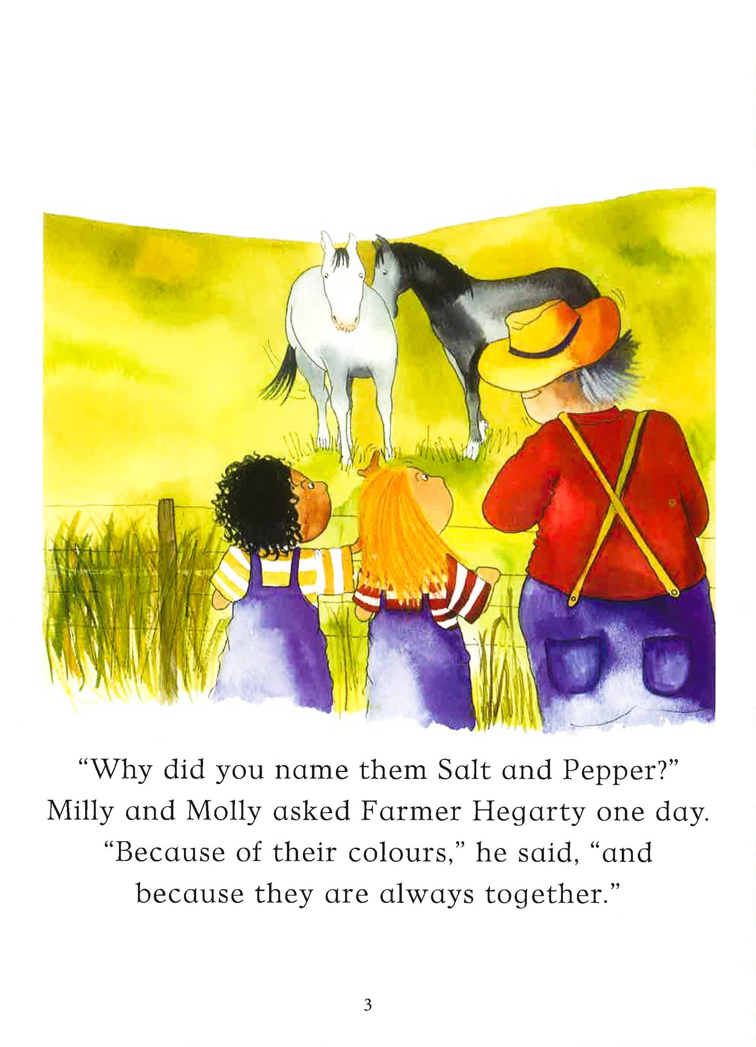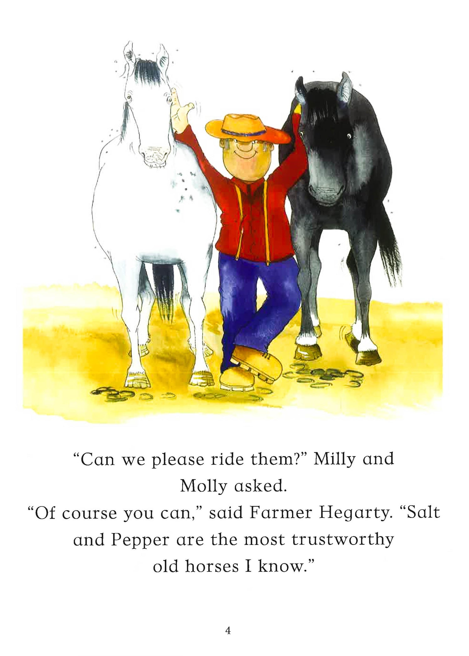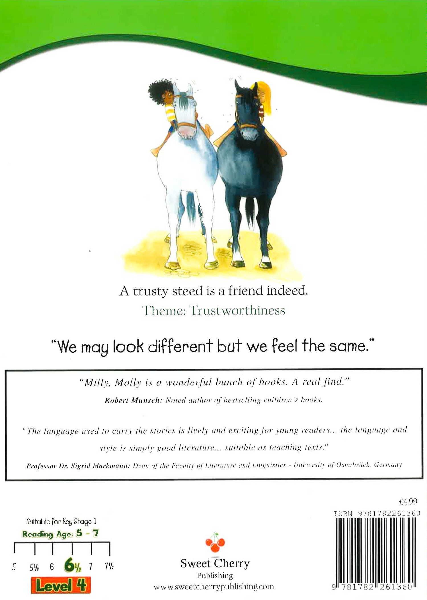 A trusty steed is a friend indeed. Theme: Trustworthiness Suitable for Key Stage 1 readers, the Milly, Molly series will challenge and encourage children - enhancing their reading skills at home and at school. Broken down in to 6 levels, from ages 5 to 7, parents and teachers will find it easy to build up children's confidence and teach them to think about what they are reading. Milly and Molly will engage children and implicitly inform them about good values and the acceptance of diversity. With each book they will learn about a new theme, every story told in a fun an interesting style; a brilliant set of books, filled with colourful illustrations.