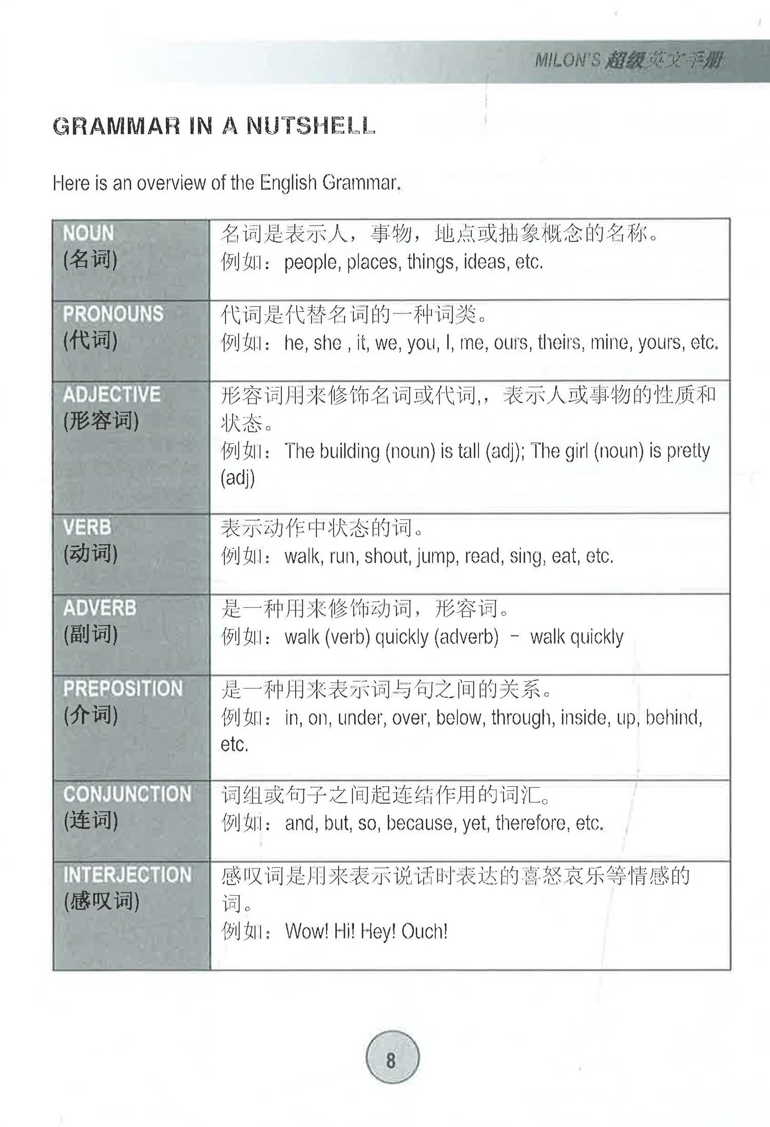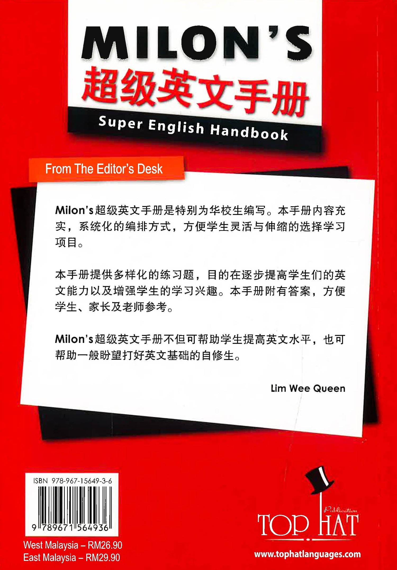 Milon’s Super English Handbook attempts to give concisely the essentials of the English language to meet the needs of Chinese students to whom English is a second language. The Chinese support in this book explains every important aspect of the English language to enable students to acquire mastery of the language with ease and speed. This in turn will help the student accell in any field of education, be it academic or professional.To assist learners to learn the correct use of the English language, numerous exercises with answers have also been included, for practice and exposure to the jargon that surrounds the English language.Milon’s Super English Handbookshould prove useful not only in the teaching of English in the classroom but also to others who are desirous of improving their command of the English language through self study.