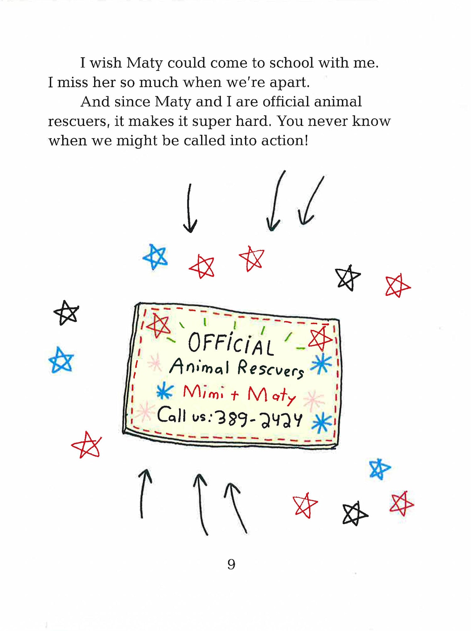Mimi, an animal-loving girl, and her loyal three-legged dog, Maty, set out together to rescue any animal that needs help. It's a crazy start to the third grade when the new girl, Emma, brings her pet parakeet, C. C., to school ...only to have him fly out the window and disappear! Mimi and Maty jump into action, showing the whole third grade what rescuing animals is all about.