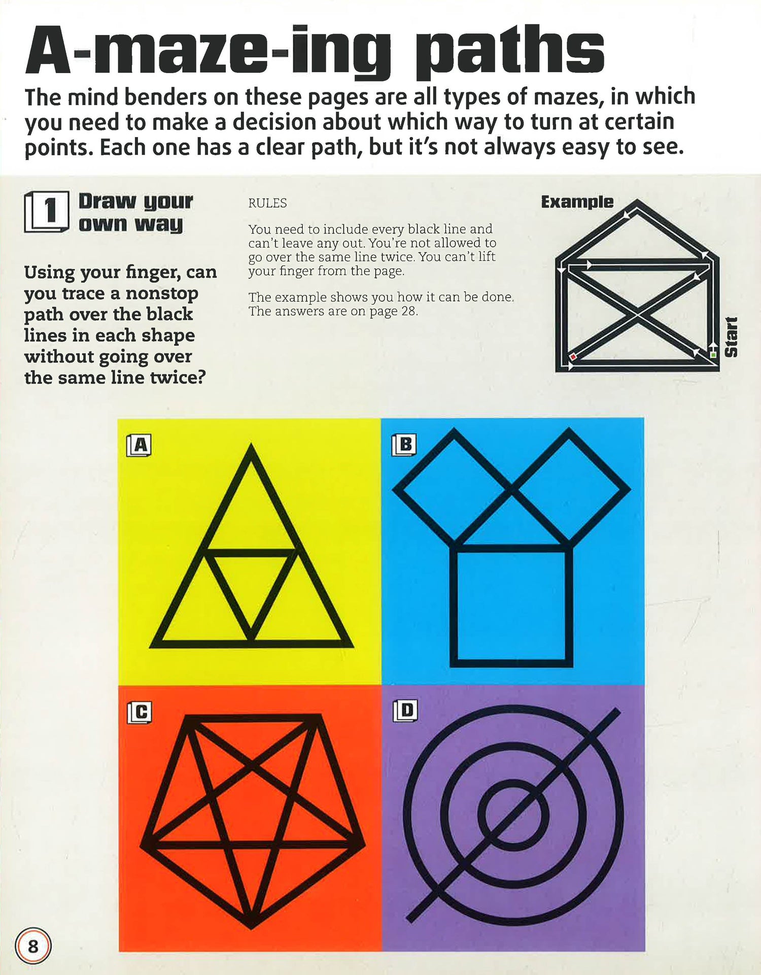 Flex your mental muscles with "Mind Benders" an interactive book of brainteasers, optical illusions, word and number games, logic puzzles, physical tricks, mazes, and more. Featuring 60 mind bending questions and challenges with bright, appealing graphics, each mind bender is introduced with a straightforward question and gives simple instructions of what to do. Answers not only give the solution, but also explain how the challenge works and how to find the solution. With cerebral challenges that include learning to think laterally and logically, and finding the shortcut to speedy sums, "Mind Benders" will get children away from electronic devices and give their brains a workout. 2014 National Parenting Publications Gold Award Winner 2014 The Mom's Choice Awards(r) Gold Award Winner 2014 International Reading Association and Children's Book Council Children's Choices List Winner