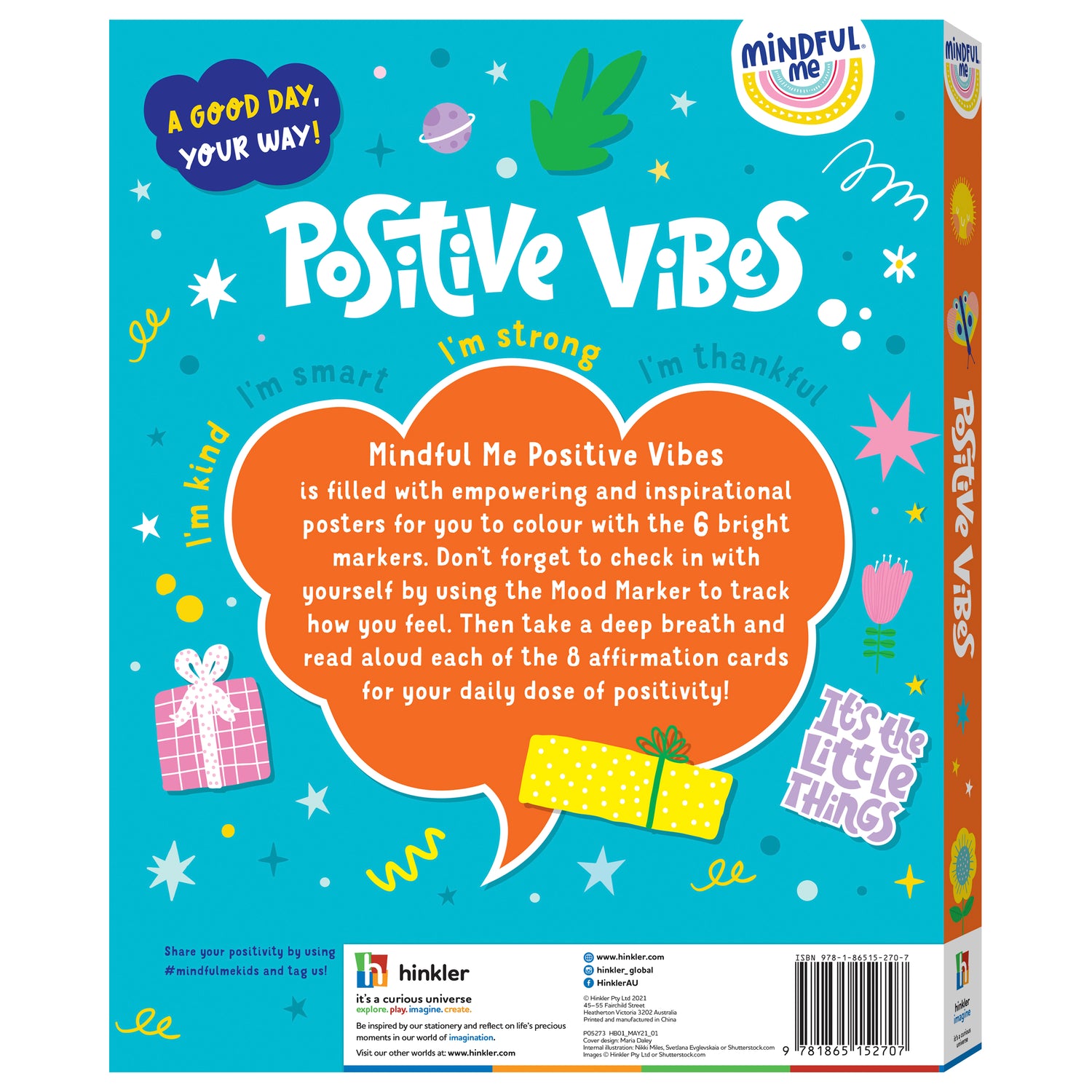 Mindful Me Positive Vibes Colouring Kit includes inspiring affirmations to colour, 6 markers, 8 affirmation cards, plus a Mood Marker to track how you feel. So take the time to pause and say thanks to the awesome person that you are!