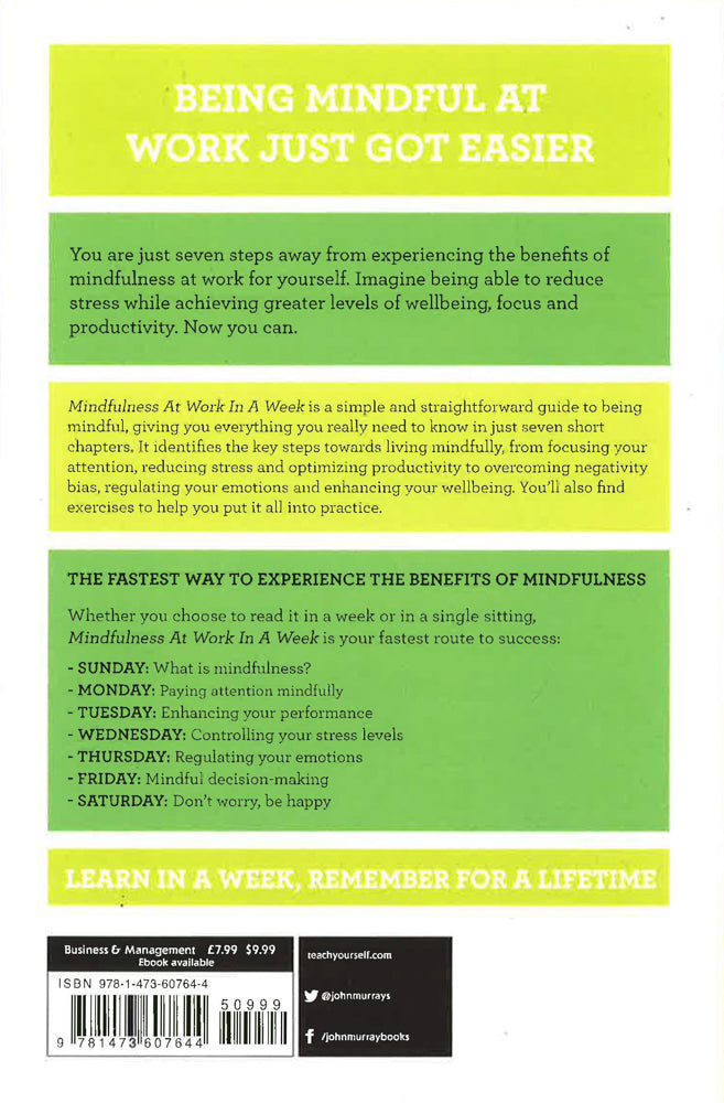 Mindfulness is more than a buzzword. It is a vital skill to help you survive and get ahead in your career. Executive coach and business trainer Dr Seeger has been practising and teaching mindfulness since before it was fashionable, and in this short, accessible book she shares a lifetime of hard-earned wisdom and practical advice.This book introduces you to the main themes and ideas, giving you a basic knowledge and understanding of the key concepts, together with practical and thought-provoking exercises. Whether you choose to read it in a week or in a single sitting, Mindfulness at Work In A Week is your fastest route to success:- Sunday: Learn to focus your attention and overcome the multi-tasking myth- Monday: Use mindfulness-based stress reduction (MBSR) to prevent and overcome stress- Tuesday: Discover how mindfulness can optimise your productivity- Wednesday: Use mindfulness to overcome the brain's negativity bias and make the workplace happier for yourself and your colleagues- Thursday: Regulate your emotions and improve your self-control- Friday: Use mindfulness to create new mental maps which will promote insight and creativity- Saturday: Understand how using mindfulness can strengthen relationships with your teamABOUT THE SERIESIn A Week books are for managers, leaders, and business executives who want to succeed at work. From negotiating and content marketing to finance and social media, the In A Week series covers the business topics that really matter and that will help you make a difference today. Written in straightforward English, each book is structured as a seven-day course so that with just a little work each day, you will quickly master the subject. In a fast-changing world, this series enables readers not just to get up to speed, but to get ahead.